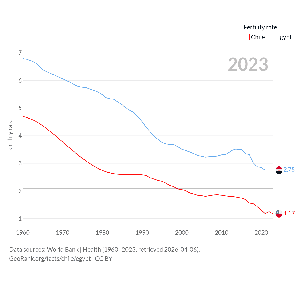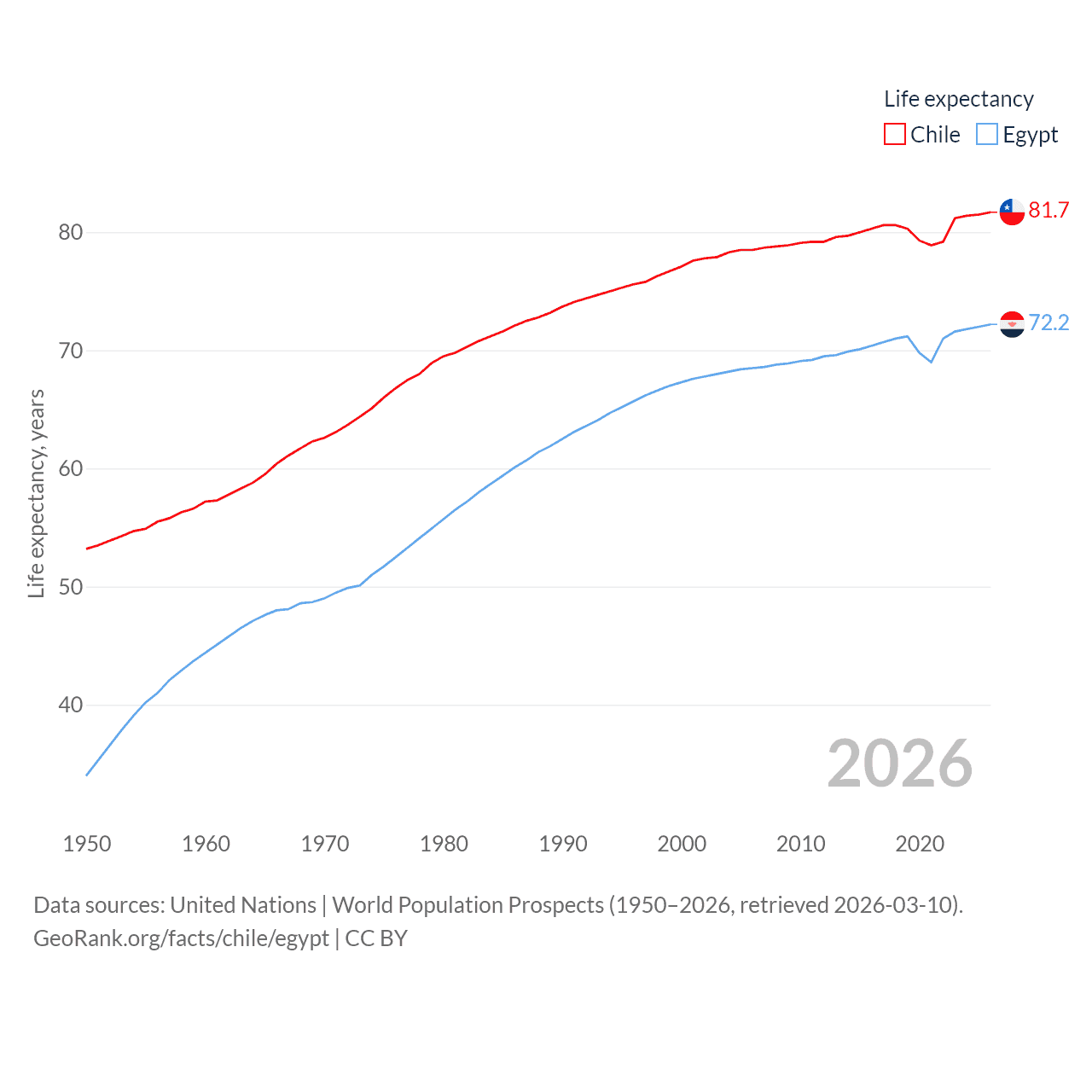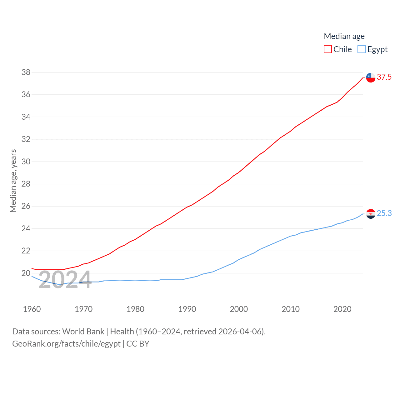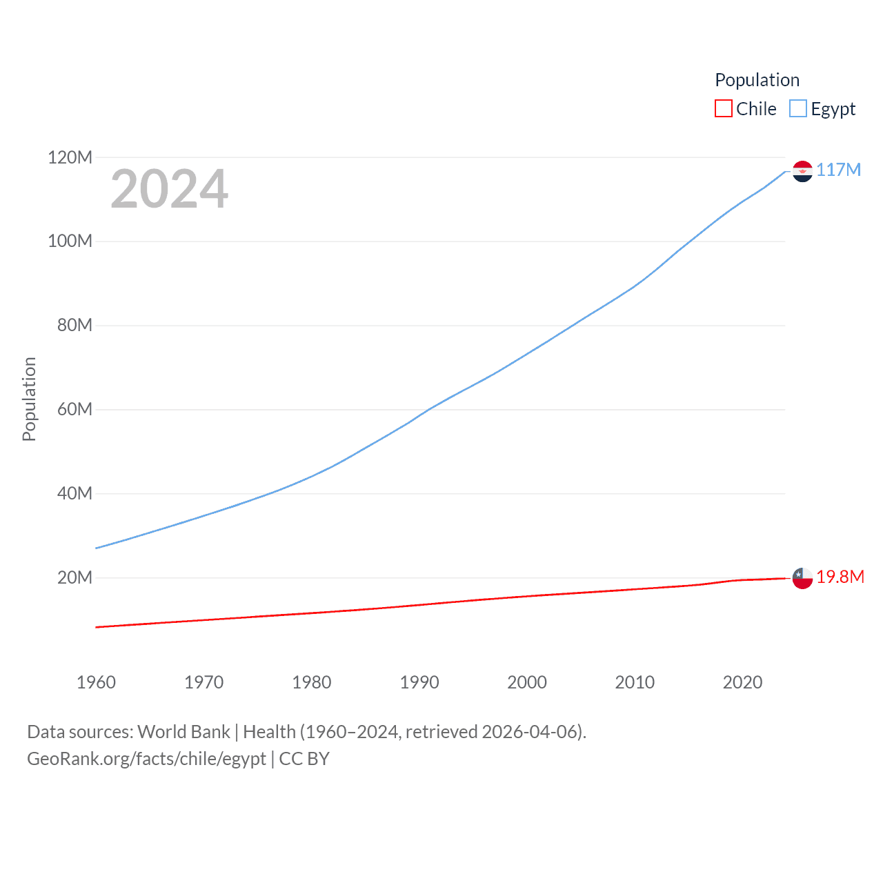 Chile has a population of 19.8M (ranked 66/197), compared with 117M in Egypt (ranked 13/197). Chile's land area is 286,809 sq mi versus 384,345 sq mi for Egypt (ranked 38th vs. 29th).