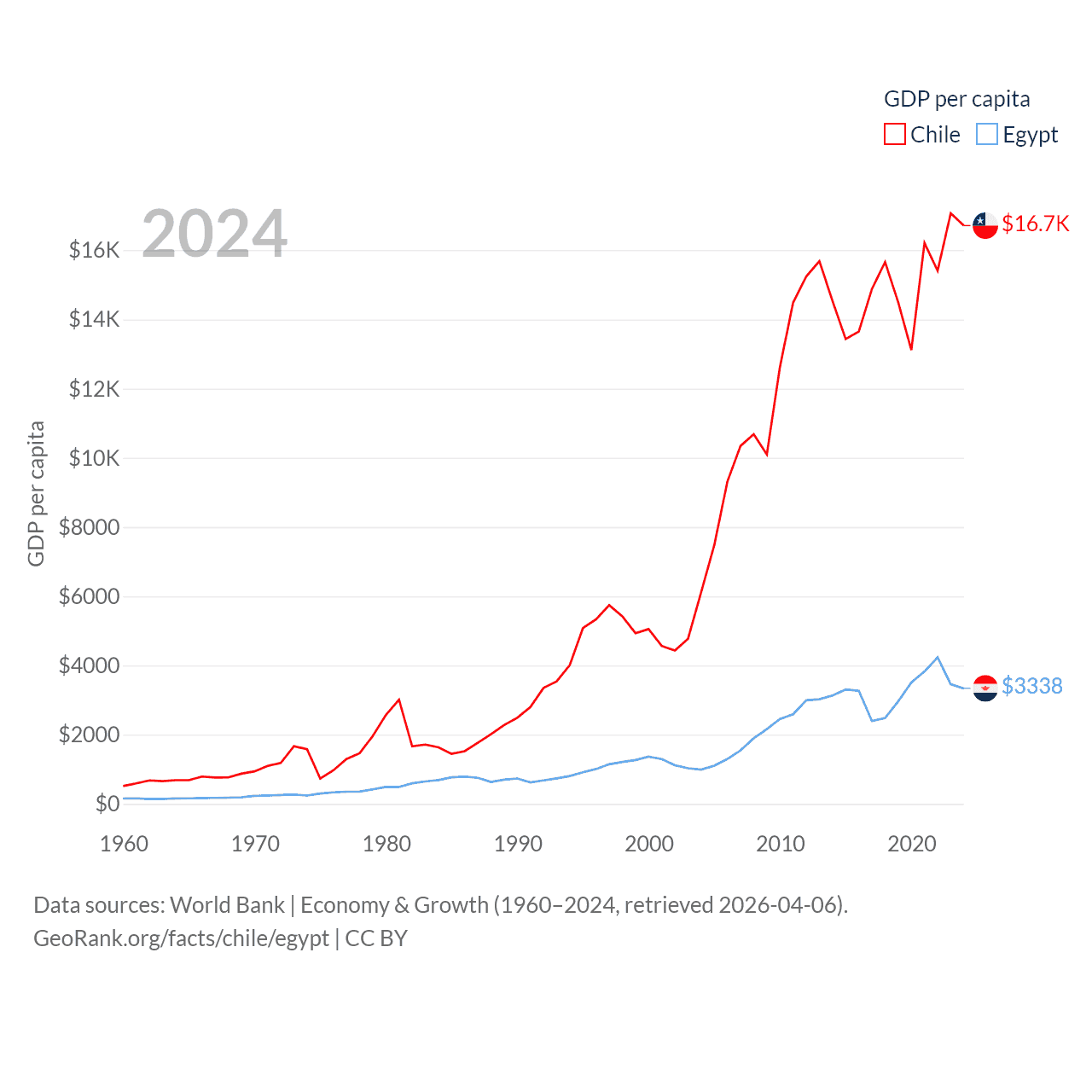 By GDP, Chile ranks 45/197 ($330B) and Egypt ranks 41/197 ($389B). By GDP per capita, Chile ranks 65/197 ($16,710), while Egypt ranks 138/197 ($3,338).