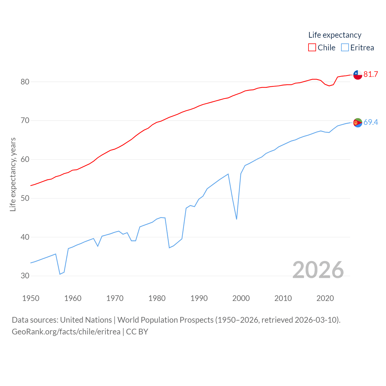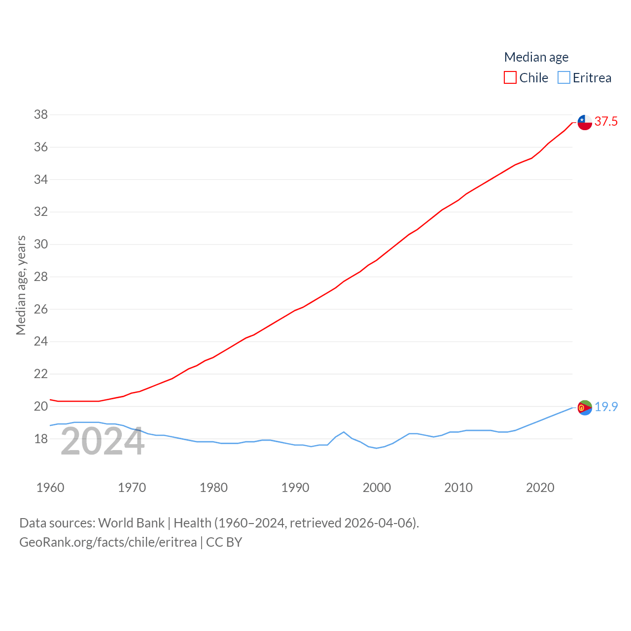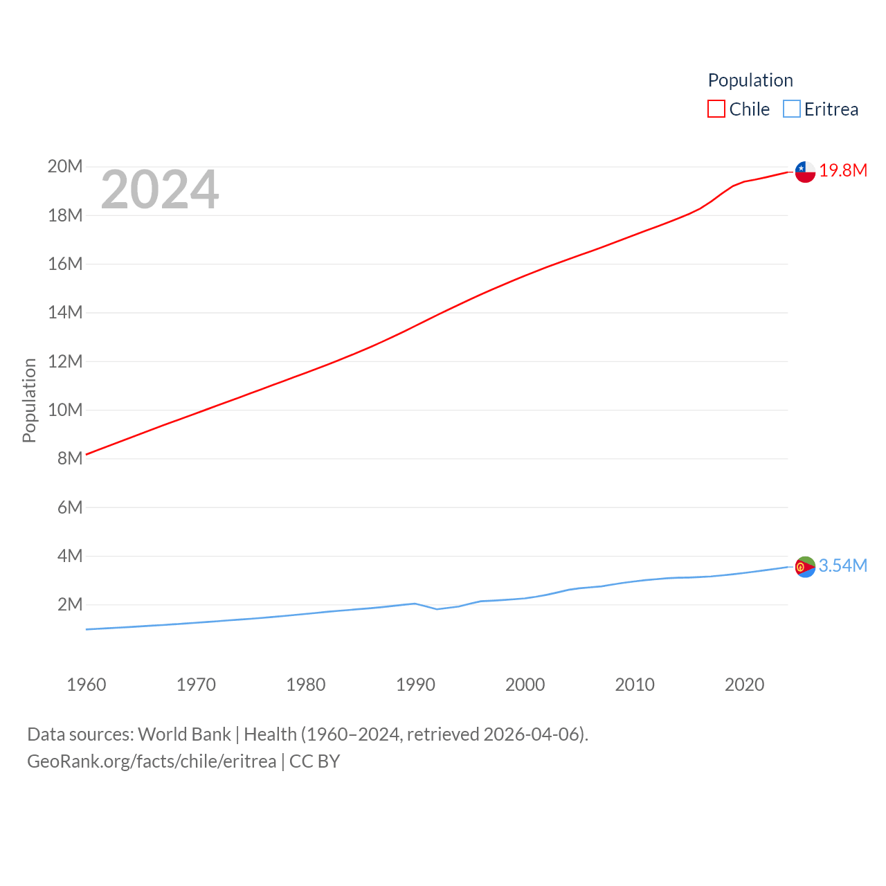 Chile has a population of 19.8M (ranked 66/197), compared with 3.54M in Eritrea (ranked 131/197). Chile's land area is 286,809 sq mi versus 46,787 sq mi for Eritrea (ranked 38th vs. 96th).