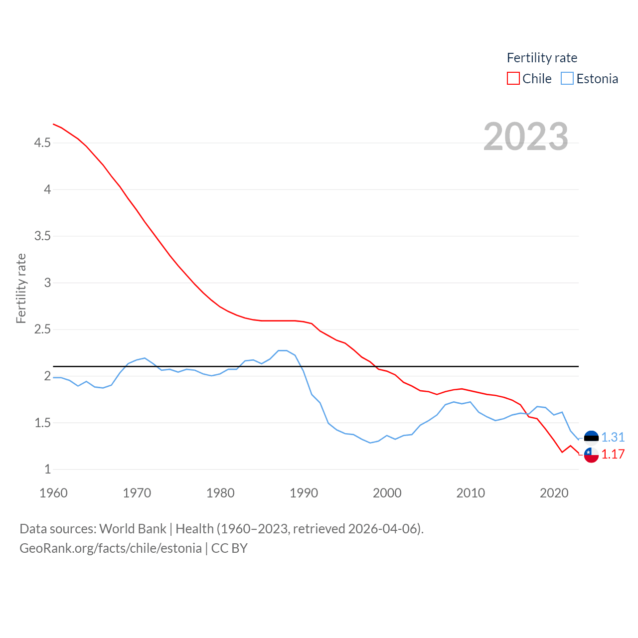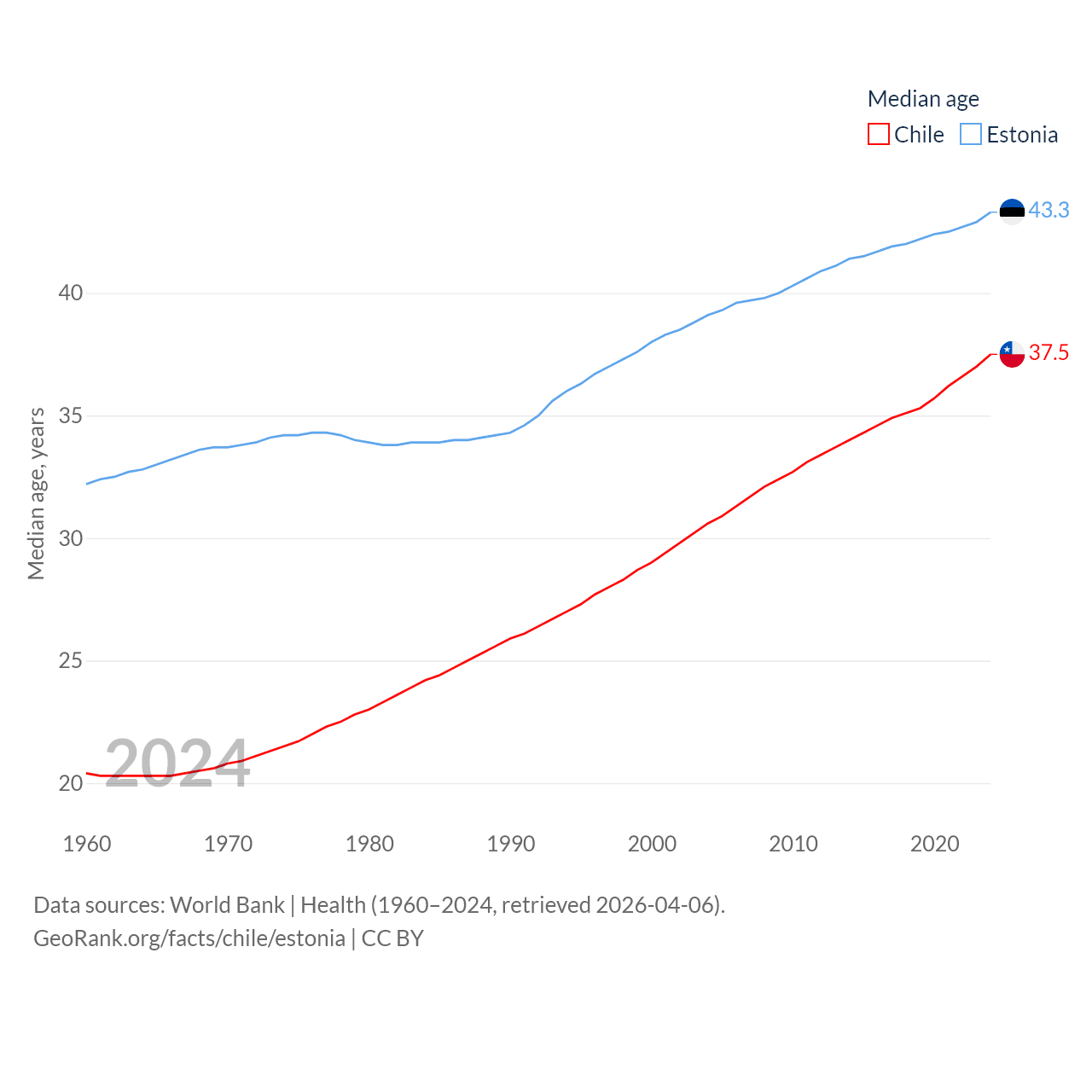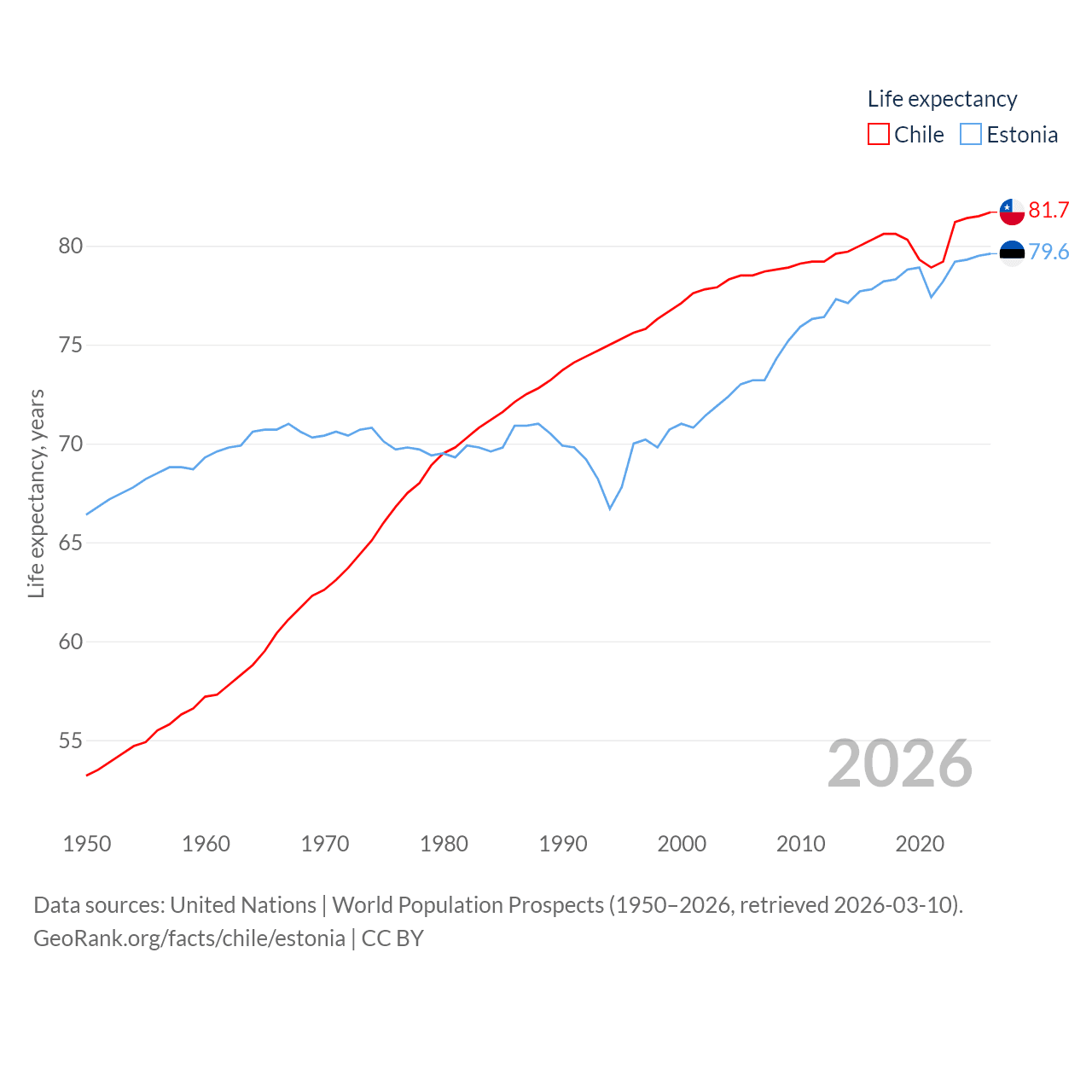 Chile has a population of 19.8M (ranked 66/197), compared with 1.37M in Estonia (ranked 153/197). Chile's land area is 286,809 sq mi versus 16,498 sq mi for Estonia (ranked 38th vs. 129th).