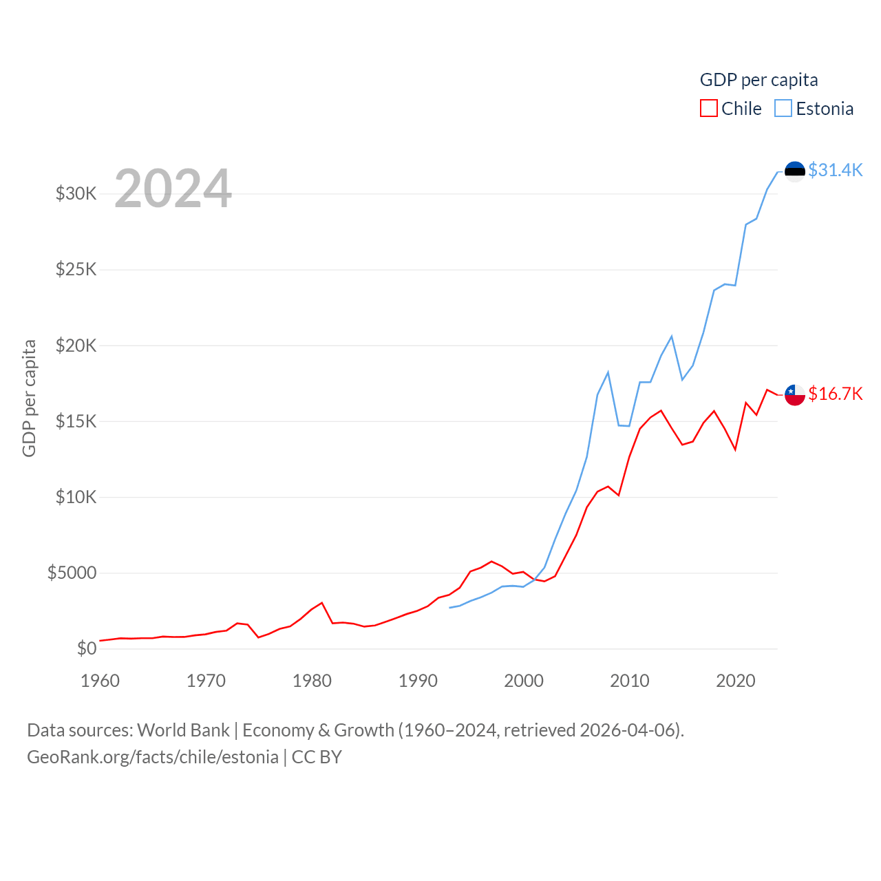 By GDP, Chile ranks 45/197 ($330B) and Estonia ranks 100/197 ($43.1B). By GDP per capita, Chile ranks 65/197 ($16,710), while Estonia ranks 40/197 ($31,428).