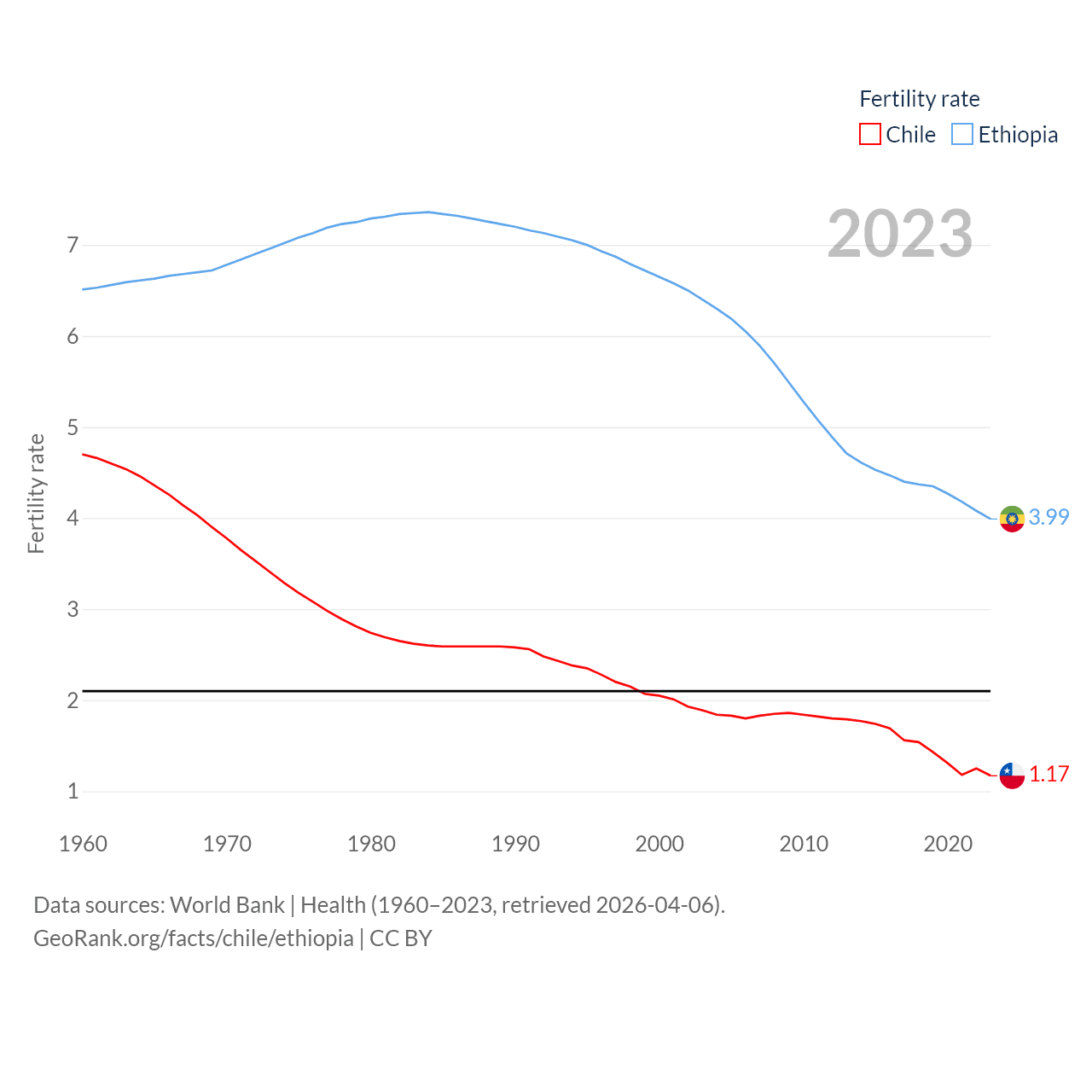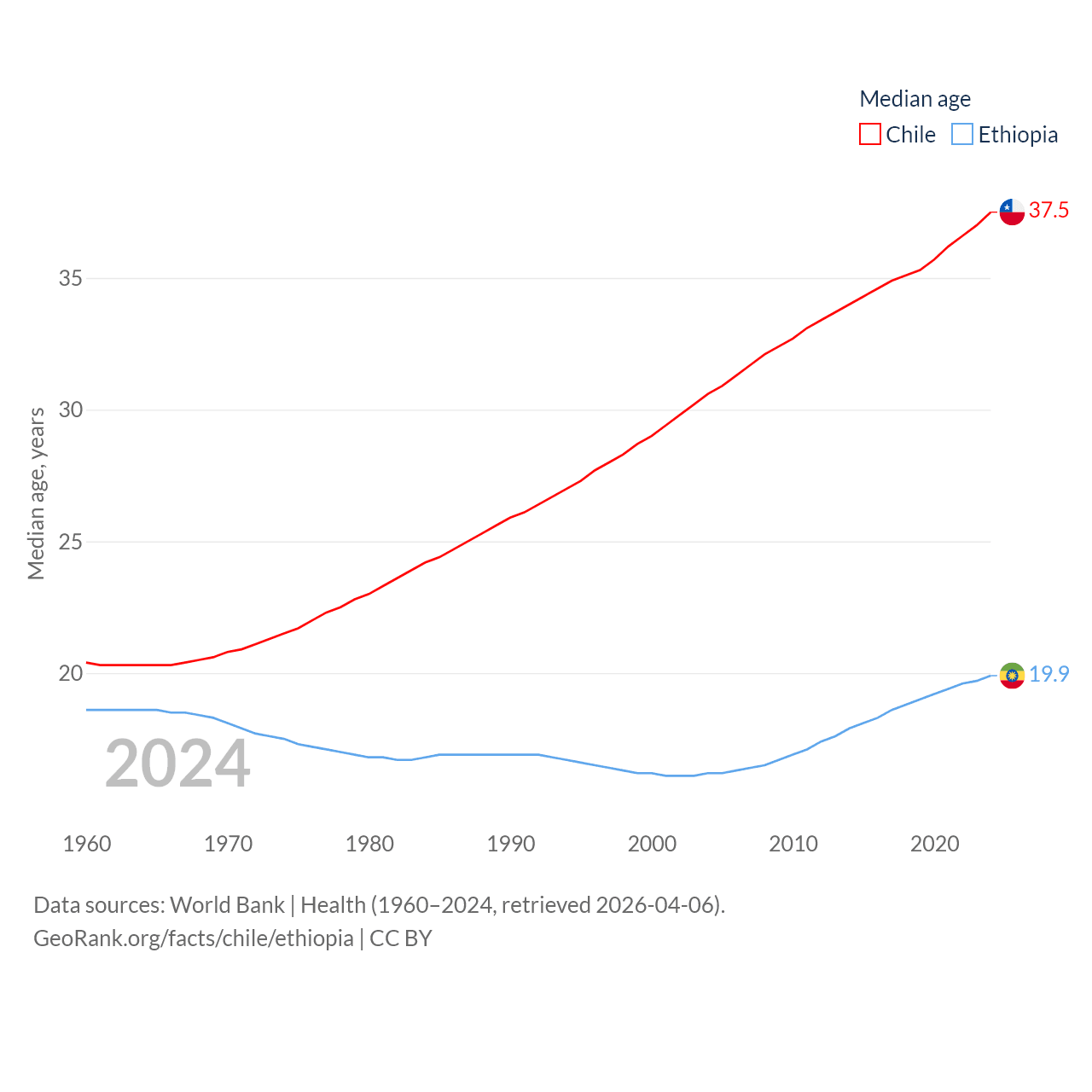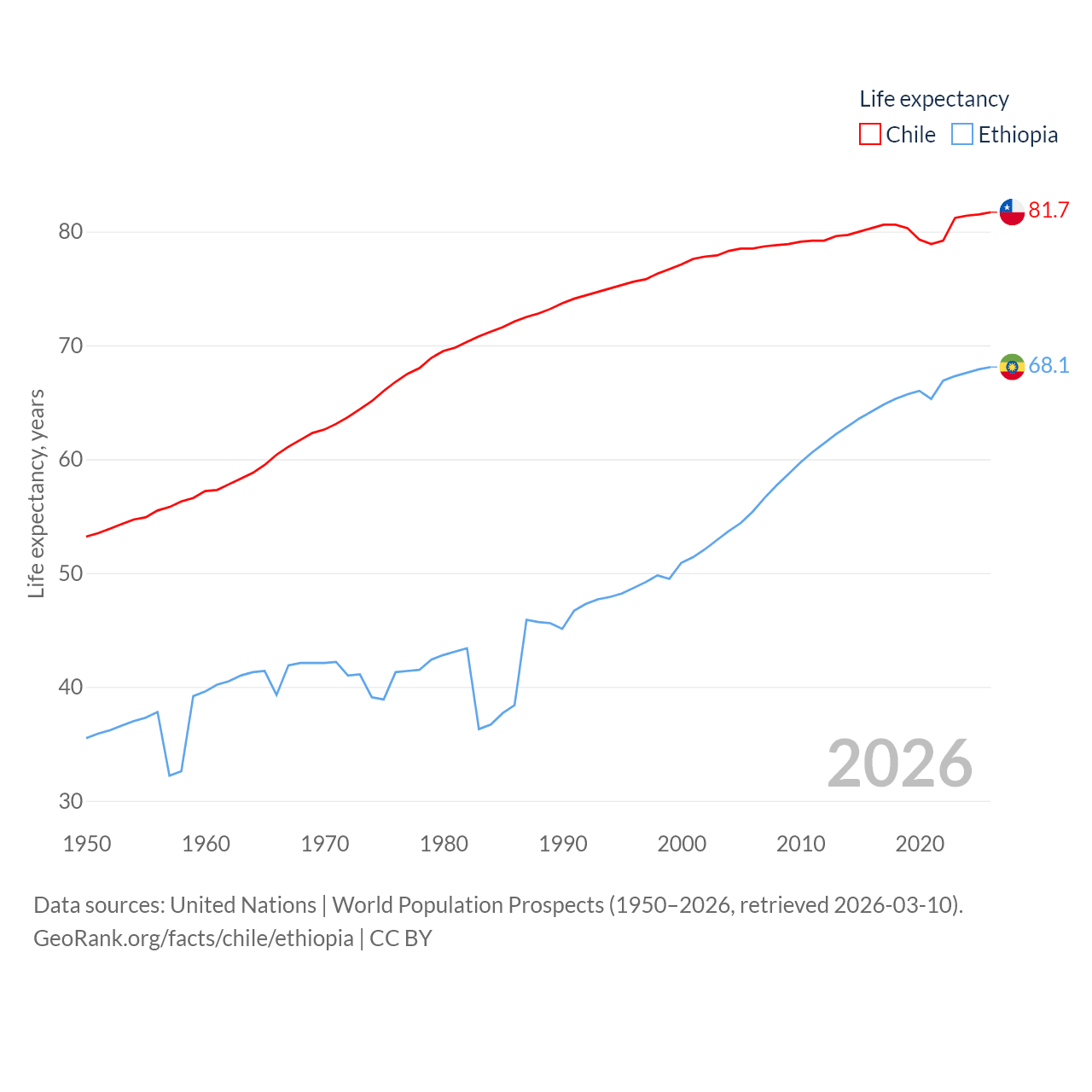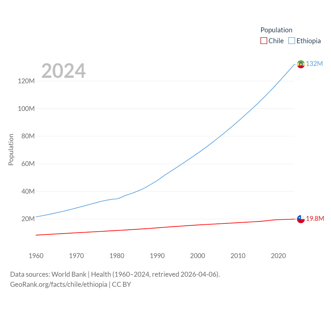 Chile has a population of 19.8M (ranked 66/197), compared with 132M in Ethiopia (ranked 10/197). Chile's land area is 286,809 sq mi versus 435,716 sq mi for Ethiopia (ranked 38th vs. 25th).