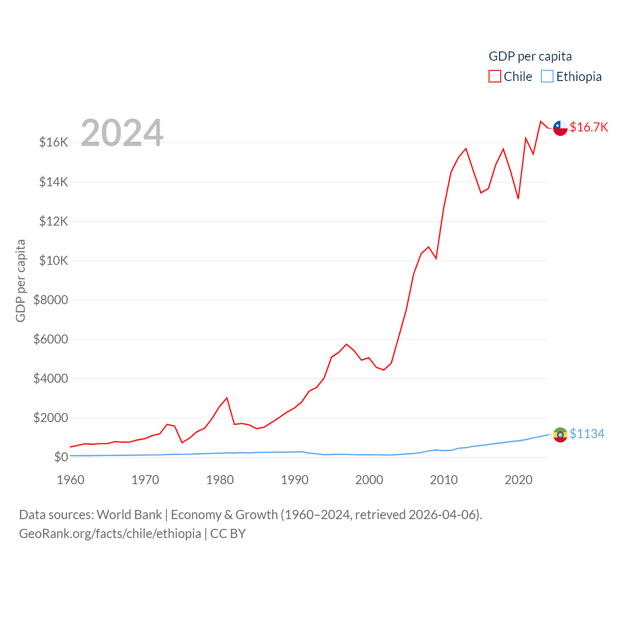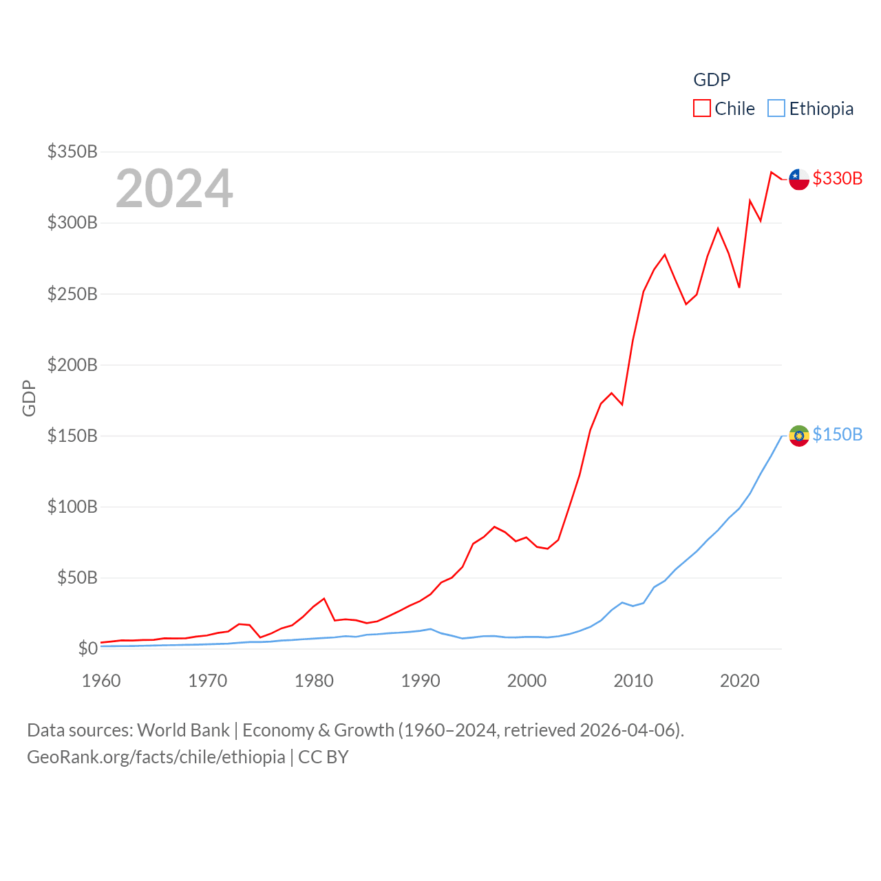 By GDP, Chile ranks 45/197 ($330B) and Ethiopia ranks 60/197 ($150B). By GDP per capita, Chile ranks 65/197 ($16,710), while Ethiopia ranks 171/197 ($1,134).