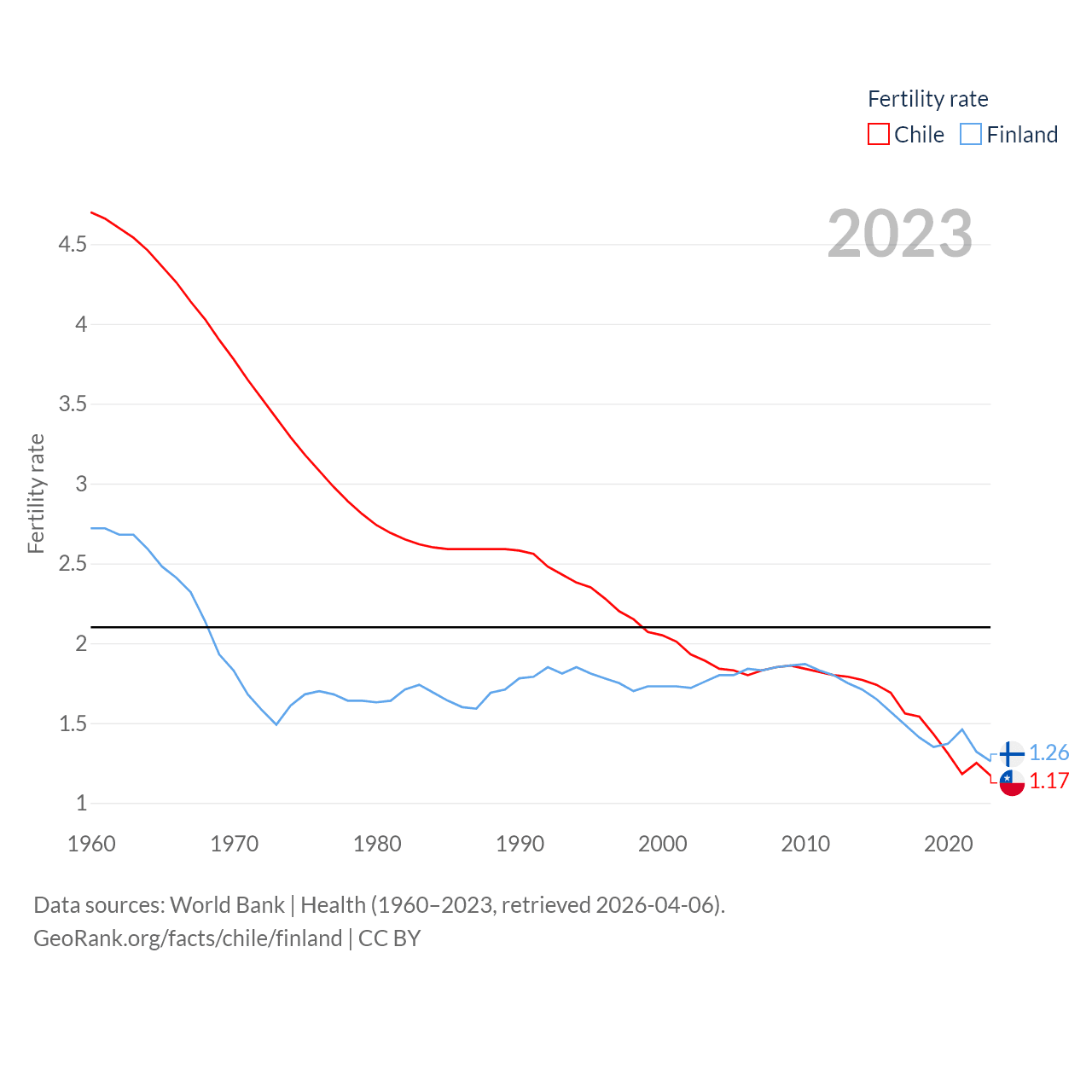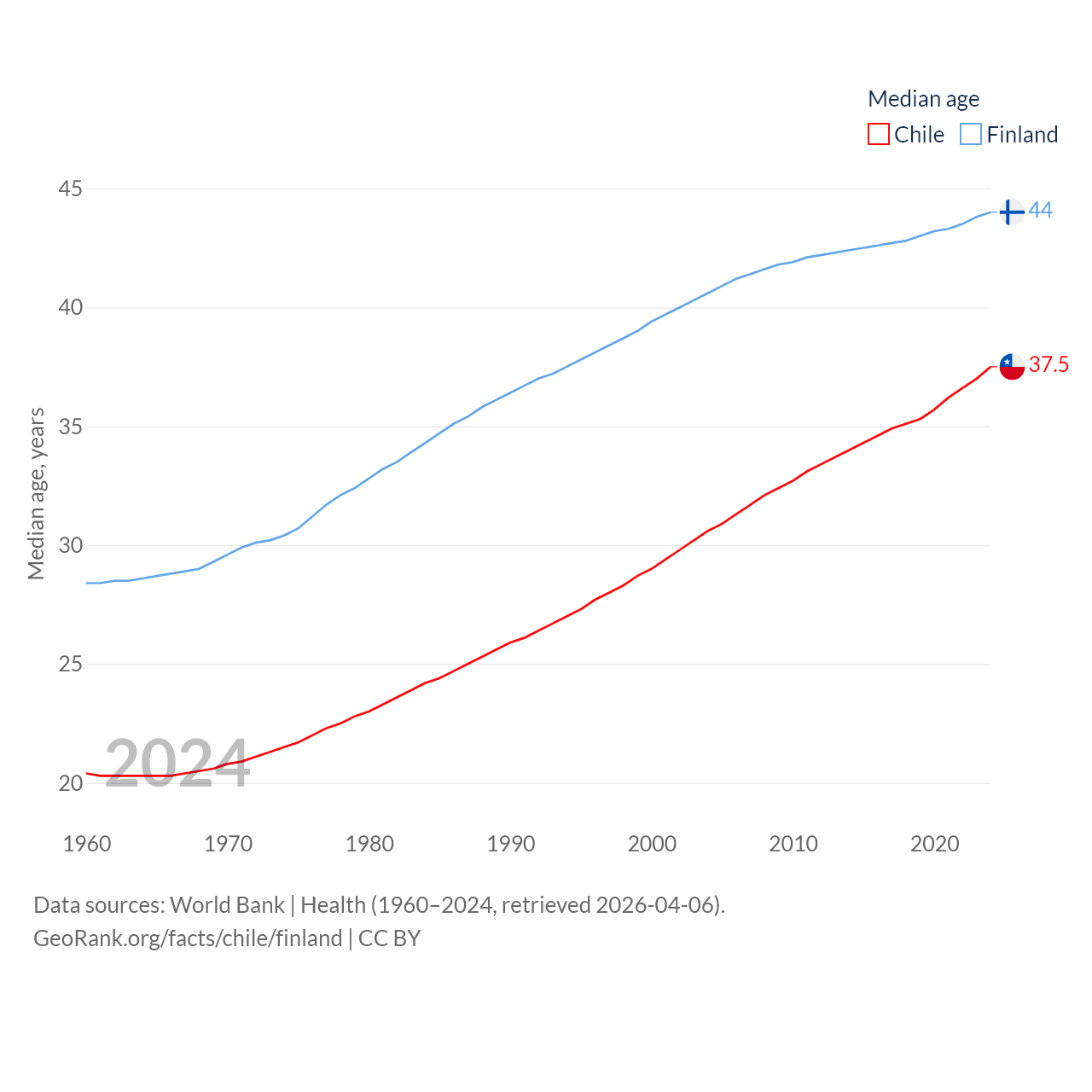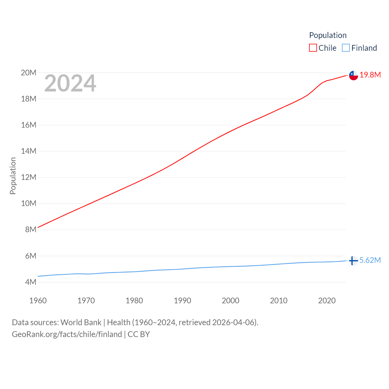 Chile has a population of 19.8M (ranked 66/197), compared with 5.62M in Finland (ranked 116/197). Chile's land area is 286,809 sq mi versus 117,360 sq mi for Finland (ranked 38th vs. 70th).