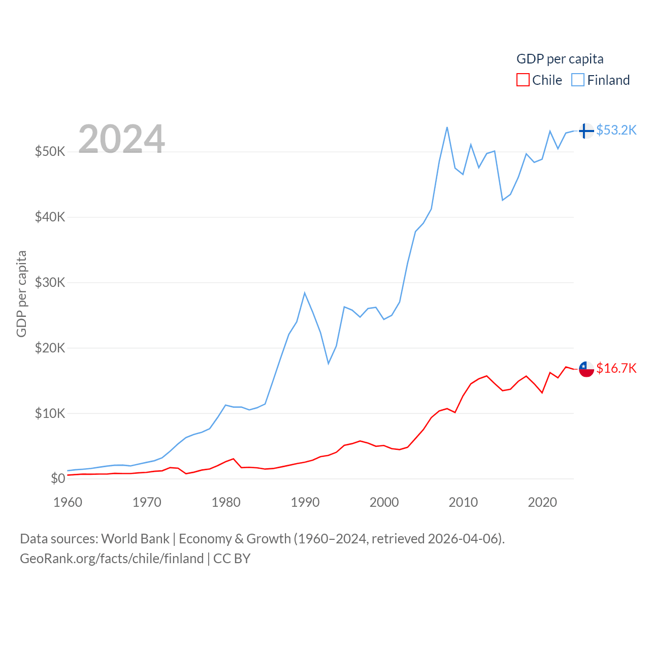 By GDP, Chile ranks 45/197 ($330B) and Finland ranks 47/197 ($299B). By GDP per capita, Chile ranks 65/197 ($16,710), while Finland ranks 23/197 ($53,150).