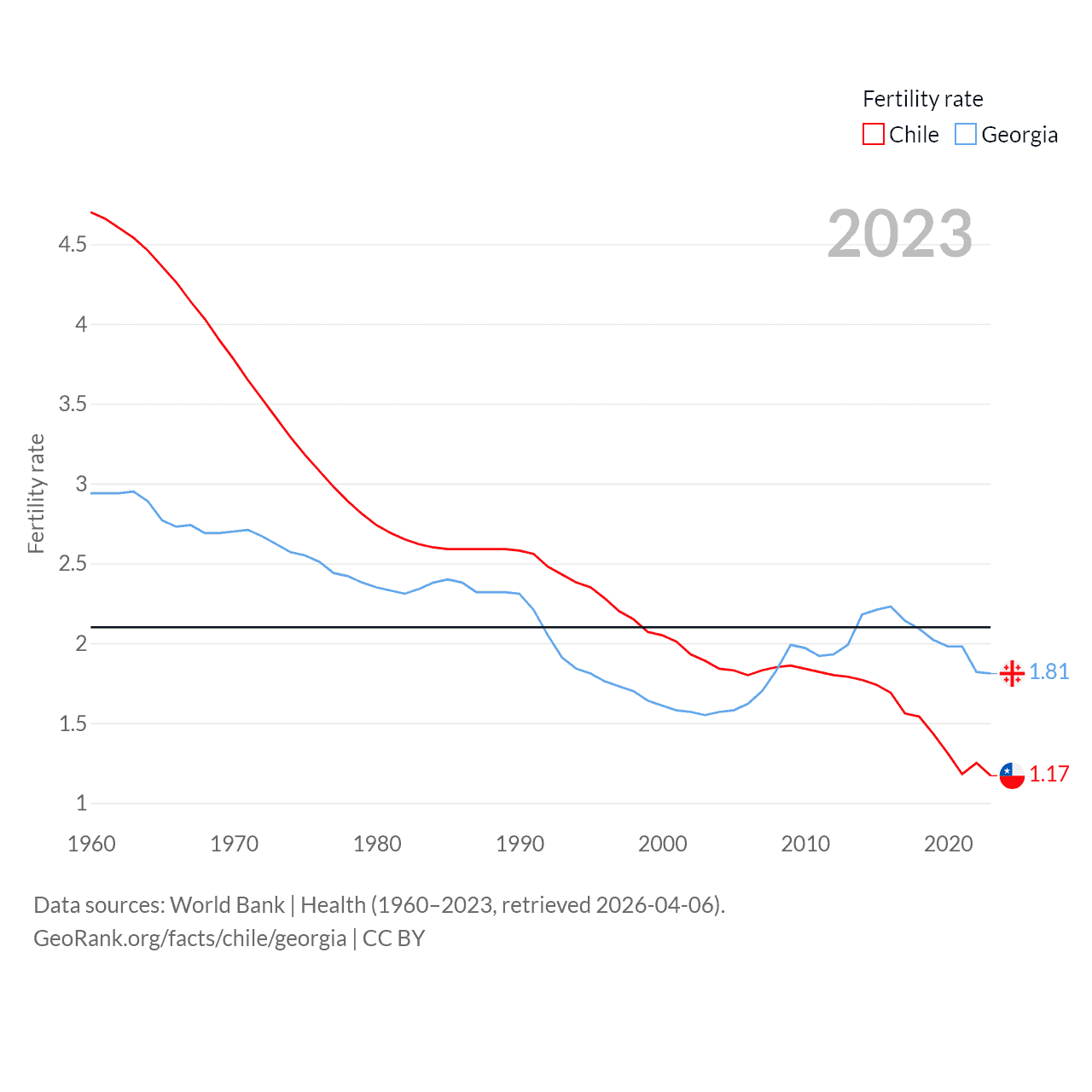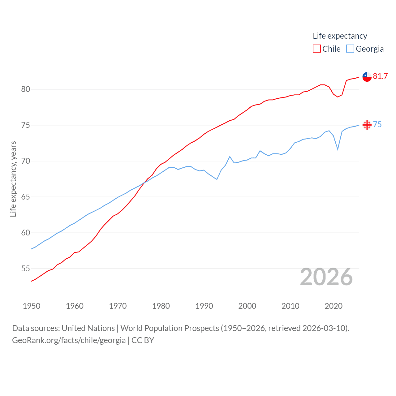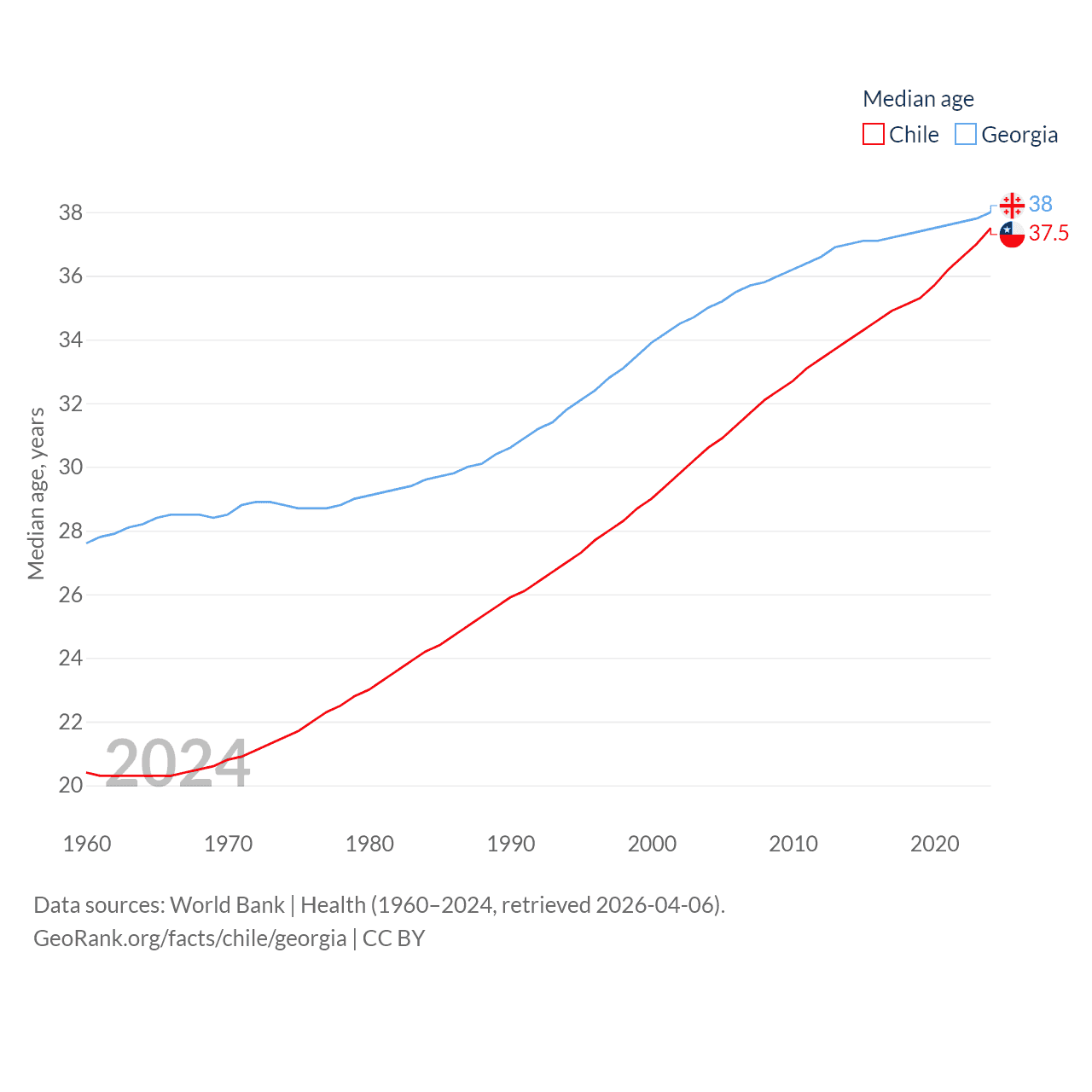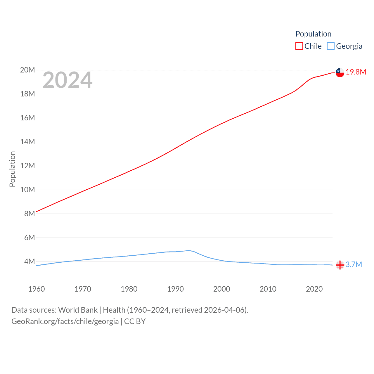 Chile has a population of 19.8M (ranked 66/197), compared with 3.7M in Georgia (ranked 130/197). Chile's land area is 286,809 sq mi versus 26,830 sq mi for Georgia (ranked 38th vs. 118th).