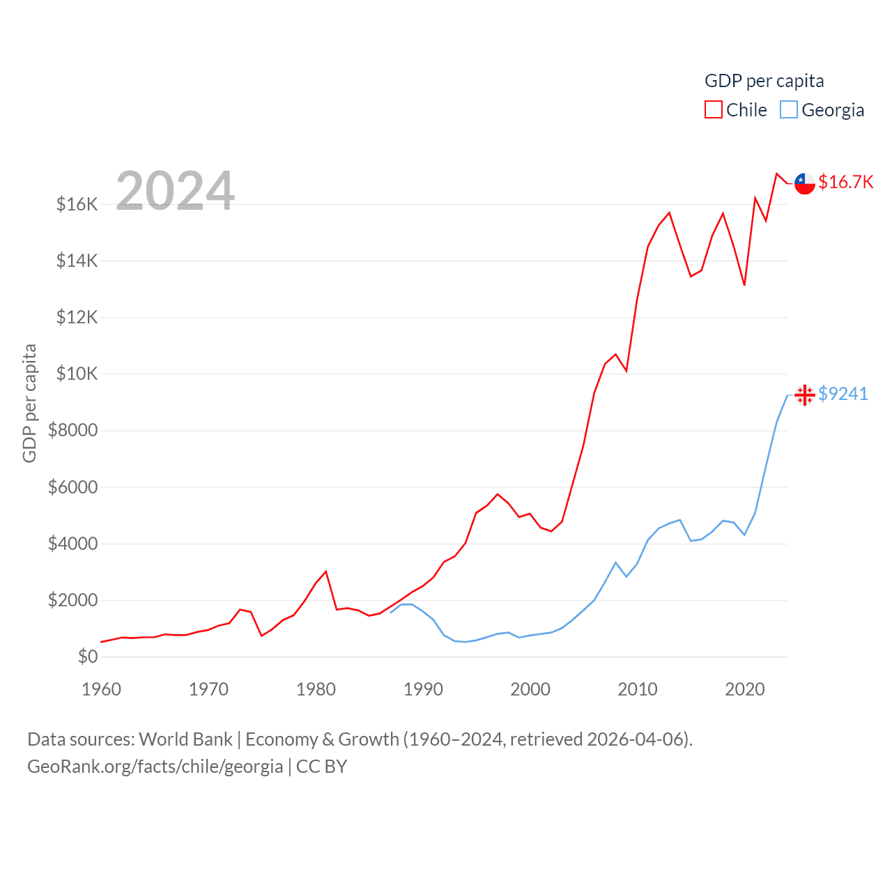 By GDP, Chile ranks 45/197 ($330B) and Georgia ranks 107/197 ($34.2B). By GDP per capita, Chile ranks 65/197 ($16,710), while Georgia ranks 89/197 ($9,241).