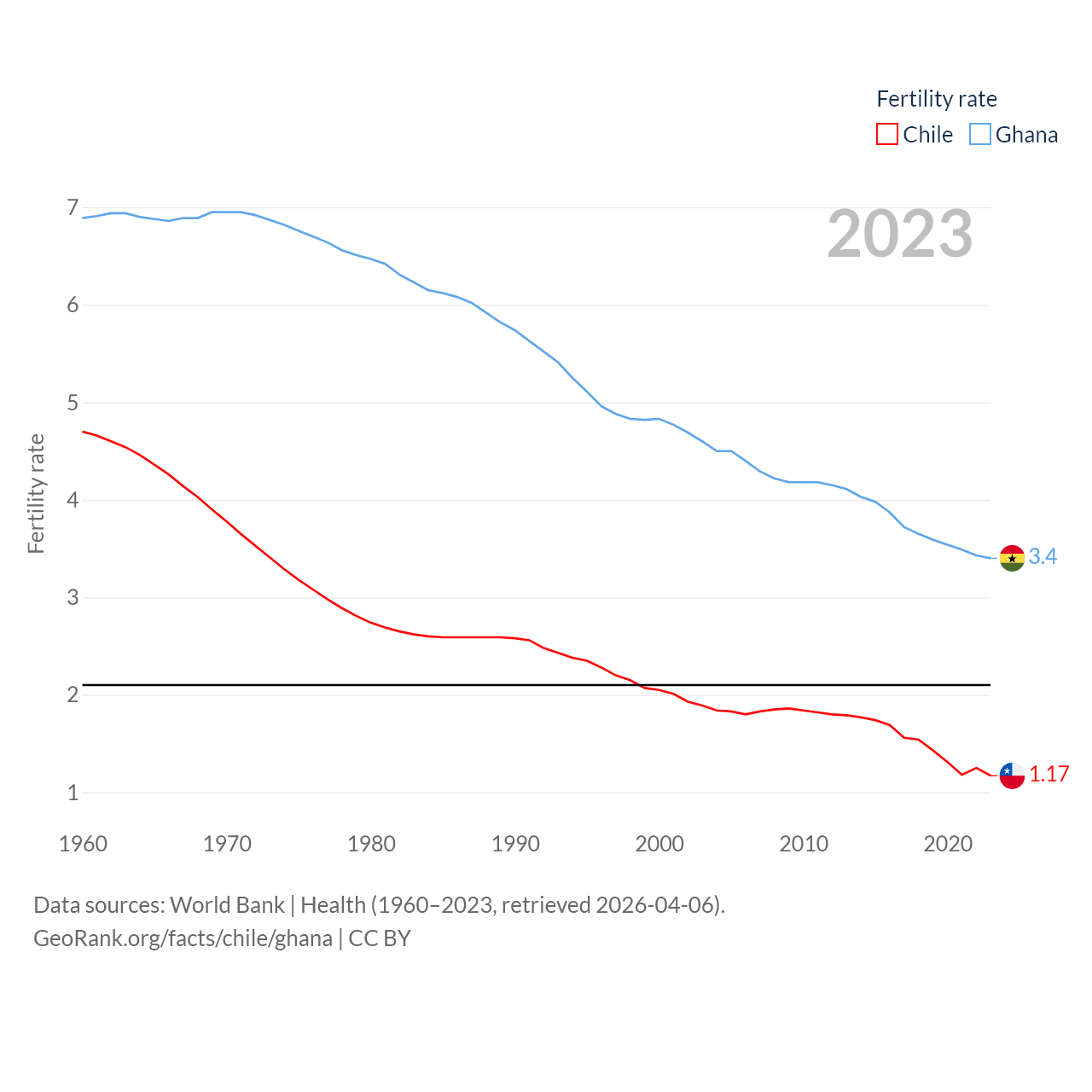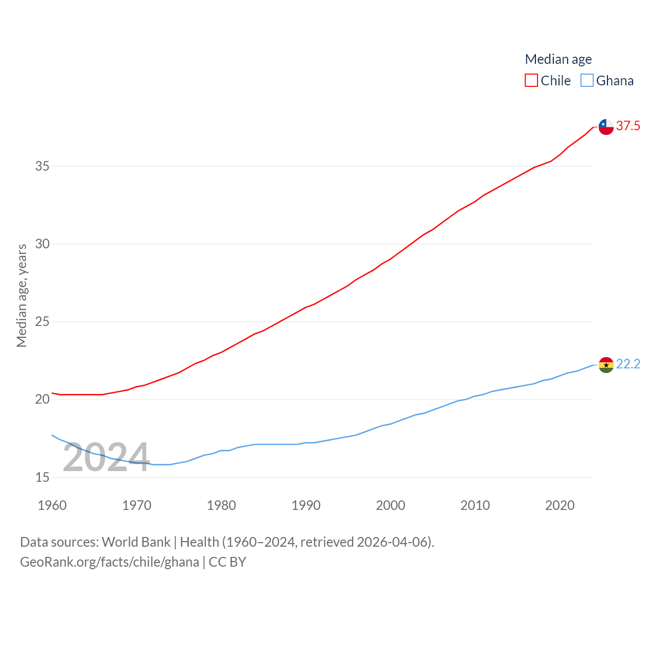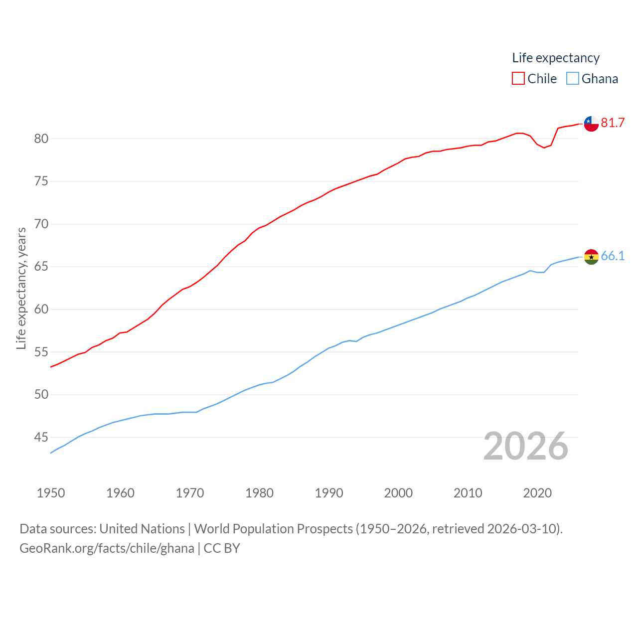 Chile has a population of 19.8M (ranked 66/197), compared with 34.4M in Ghana (ranked 47/197). Chile's land area is 286,809 sq mi versus 87,851 sq mi for Ghana (ranked 38th vs. 81st).