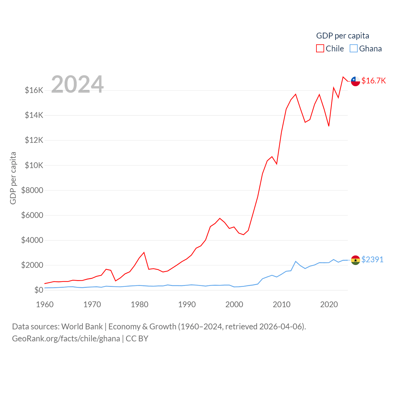 By GDP, Chile ranks 45/197 ($330B) and Ghana ranks 80/197 ($82.3B). By GDP per capita, Chile ranks 65/197 ($16,710), while Ghana ranks 151/197 ($2,391).