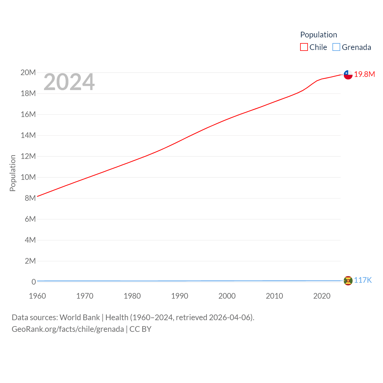 Chile has a population of 19.8M (ranked 66/197), compared with 117K in Grenada (ranked 182/197). Chile's land area is 286,809 sq mi versus 131.3 sq mi for Grenada (ranked 38th vs. 186th).