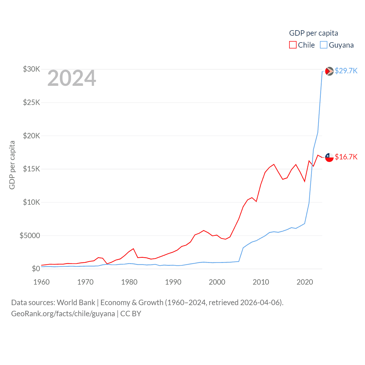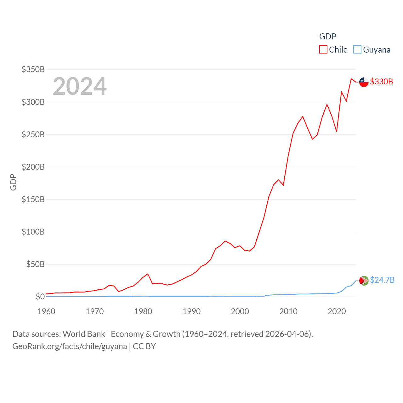 By GDP, Chile ranks 45/197 ($330B) and Guyana ranks 120/197 ($24.7B). By GDP per capita, Chile ranks 65/197 ($16,710), while Guyana ranks 41/197 ($29,675).