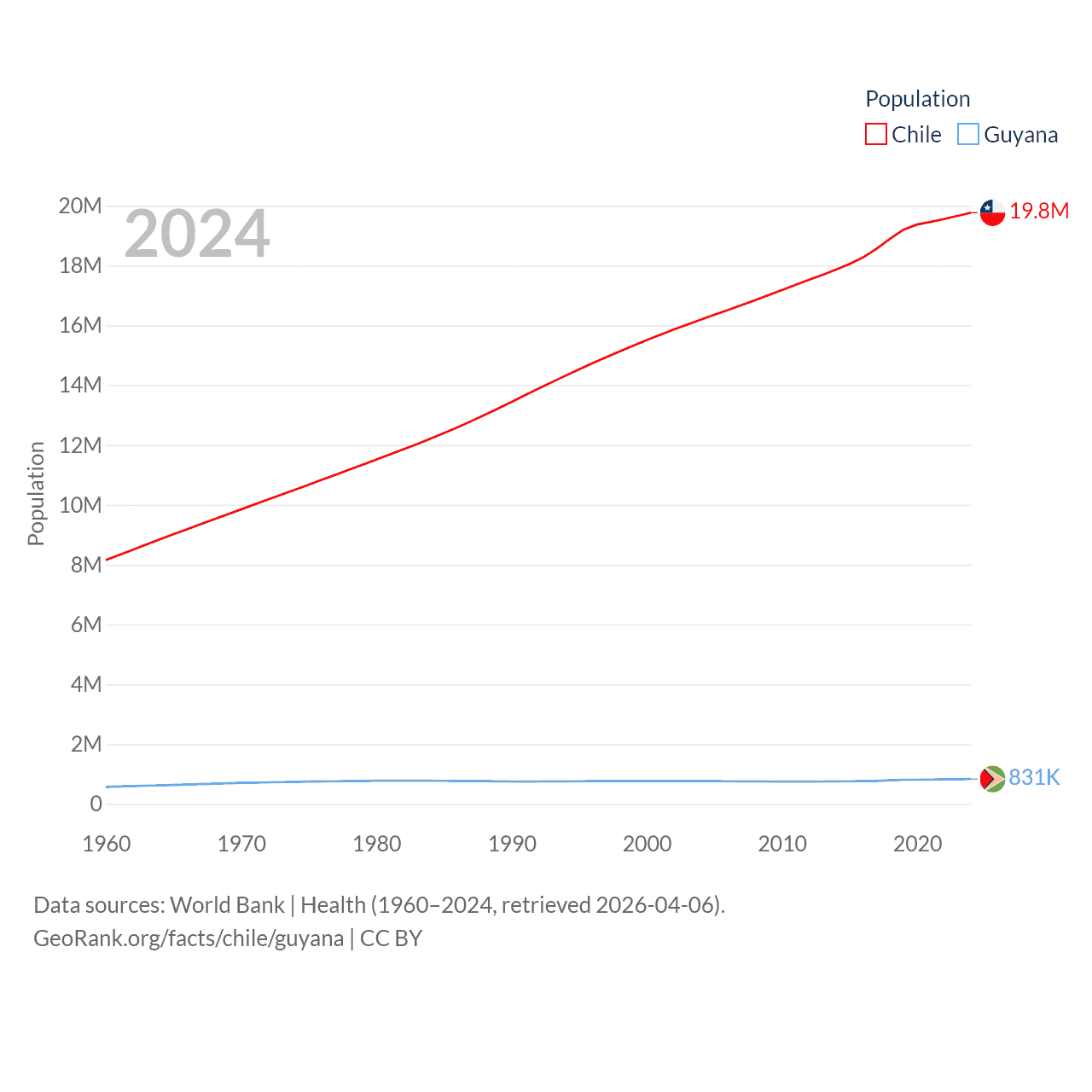 Chile has a population of 19.8M (ranked 66/197), compared with 831K in Guyana (ranked 161/197). Chile's land area is 286,809 sq mi versus 81,522 sq mi for Guyana (ranked 38th vs. 82nd).