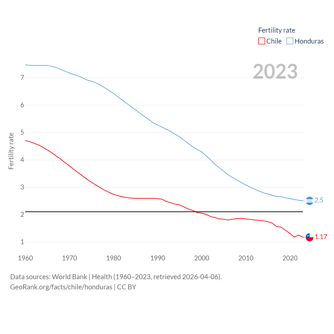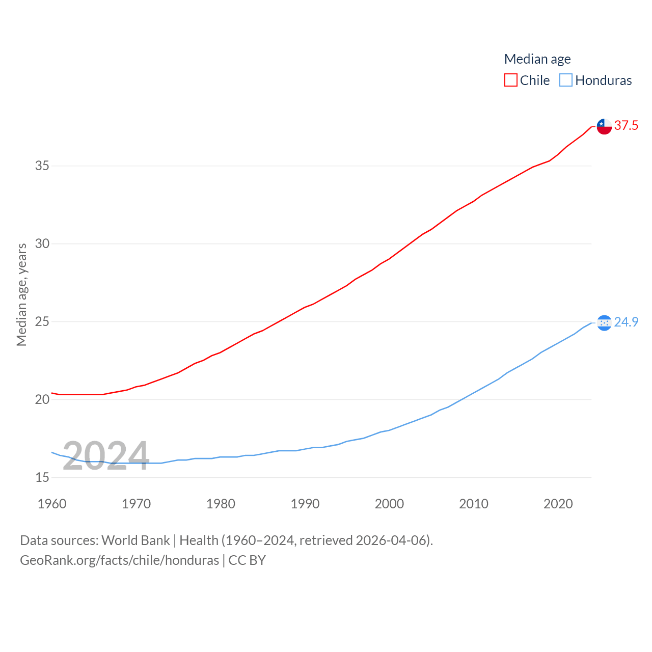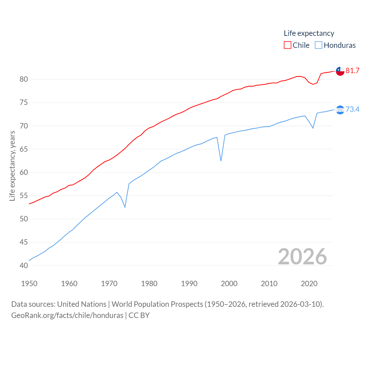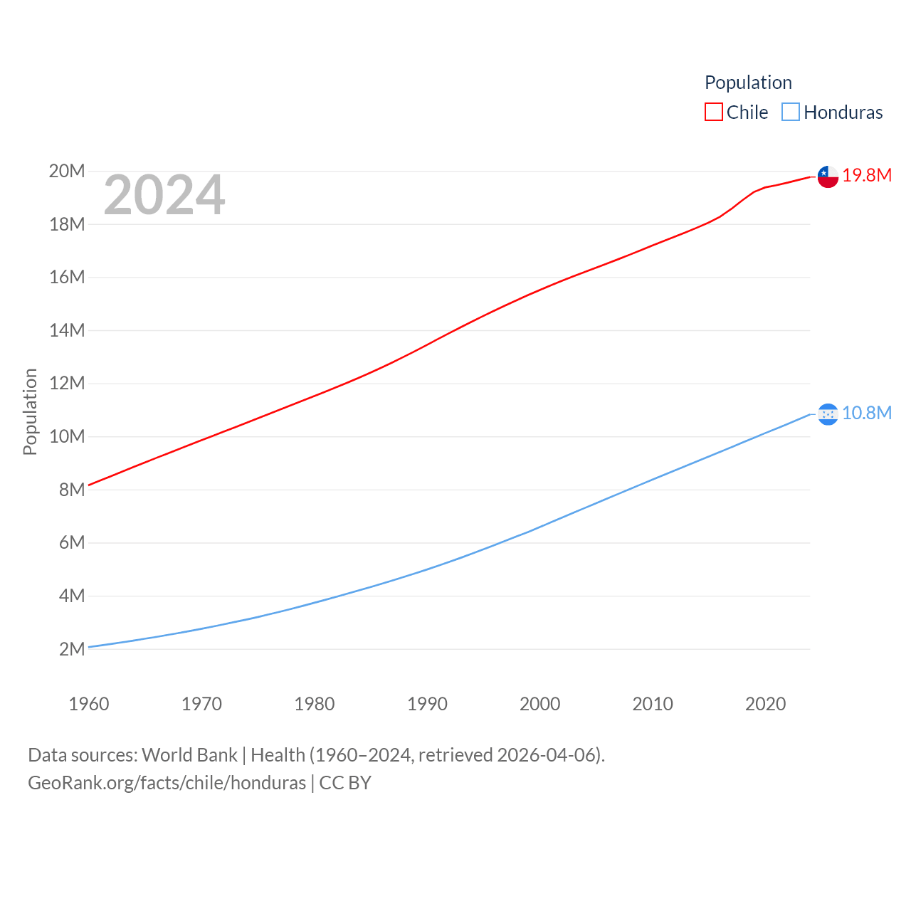 Chile has a population of 19.8M (ranked 66/197), compared with 10.8M in Honduras (ranked 89/197). Chile's land area is 286,809 sq mi versus 43,201 sq mi for Honduras (ranked 38th vs. 100th).