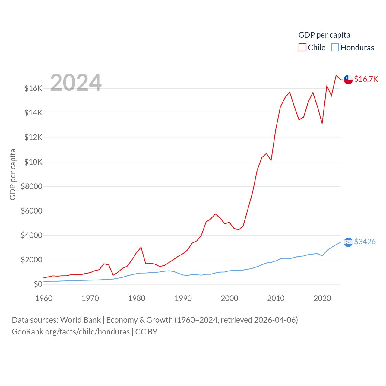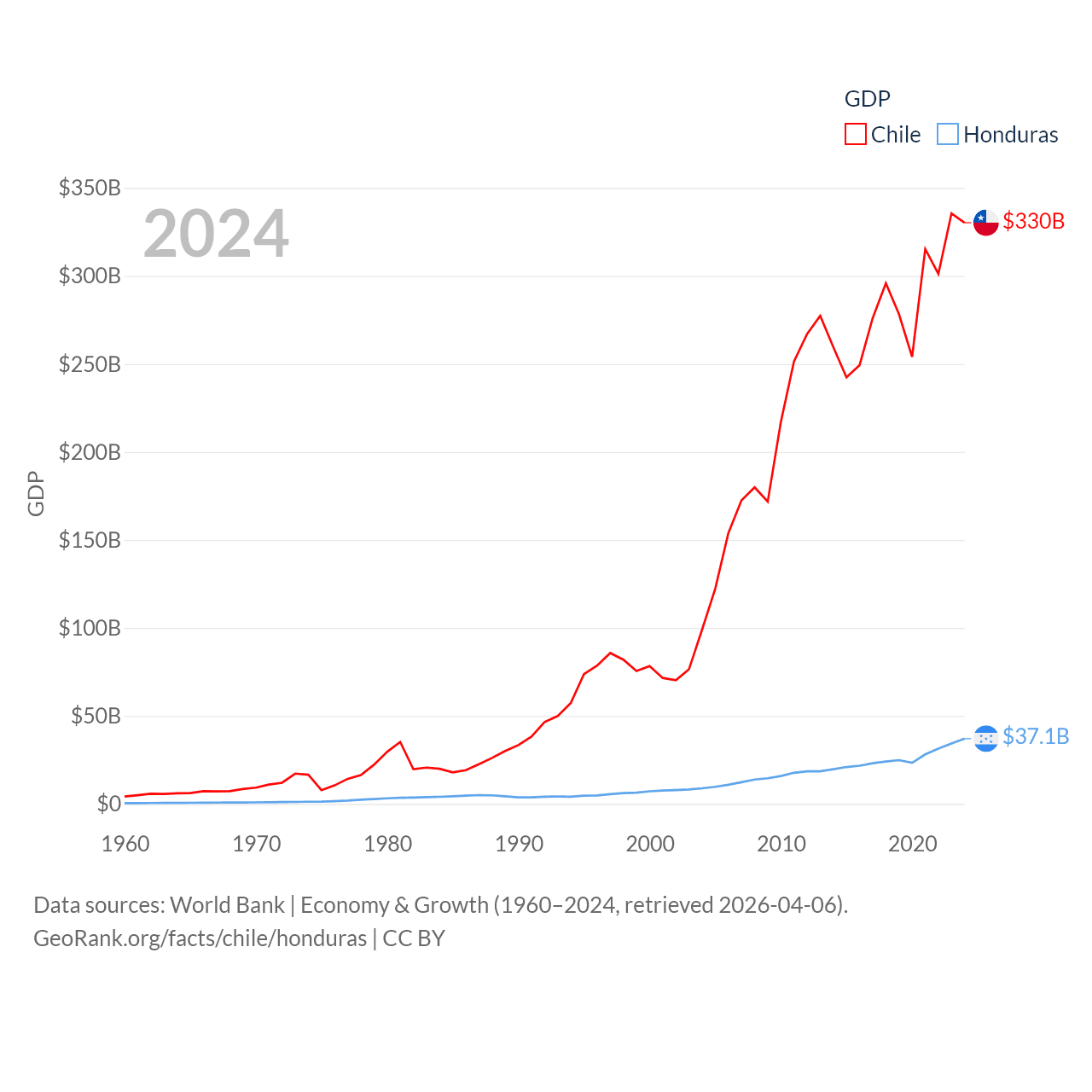 By GDP, Chile ranks 45/197 ($330B) and Honduras ranks 104/197 ($37.1B). By GDP per capita, Chile ranks 65/197 ($16,710), while Honduras ranks 136/197 ($3,426).