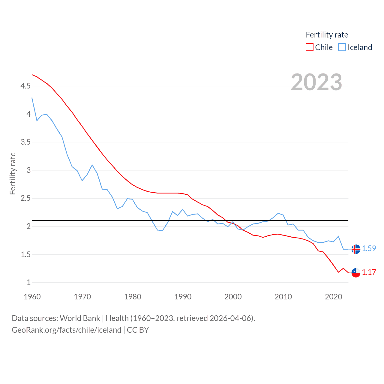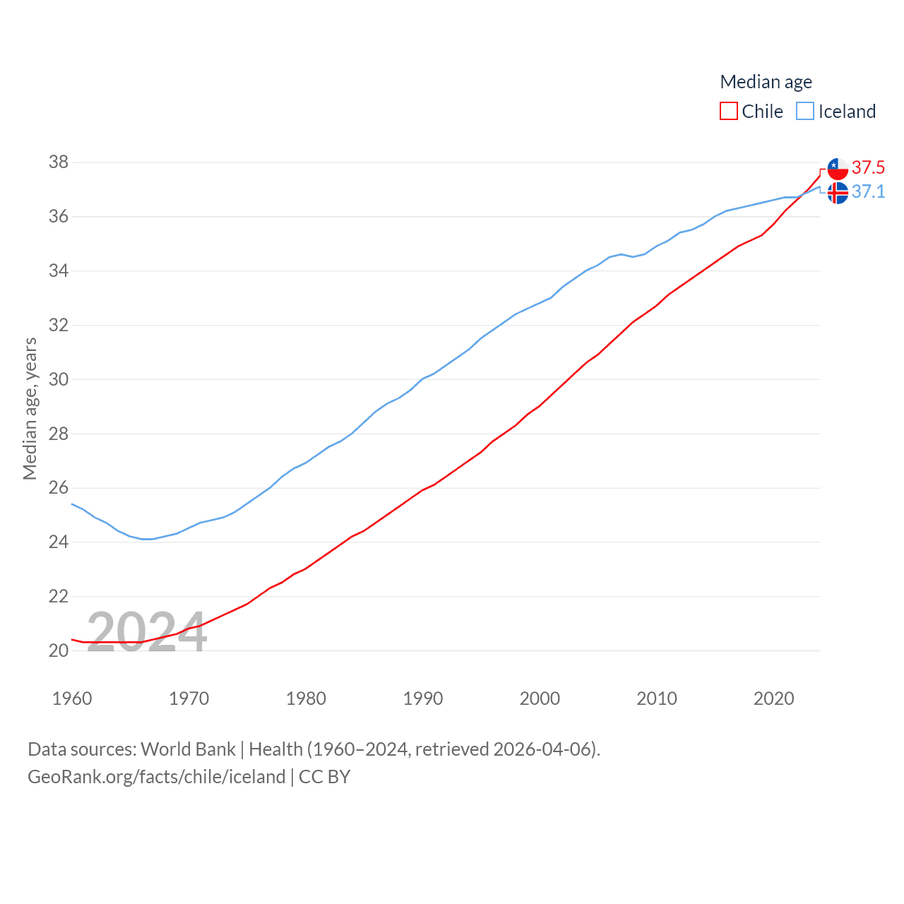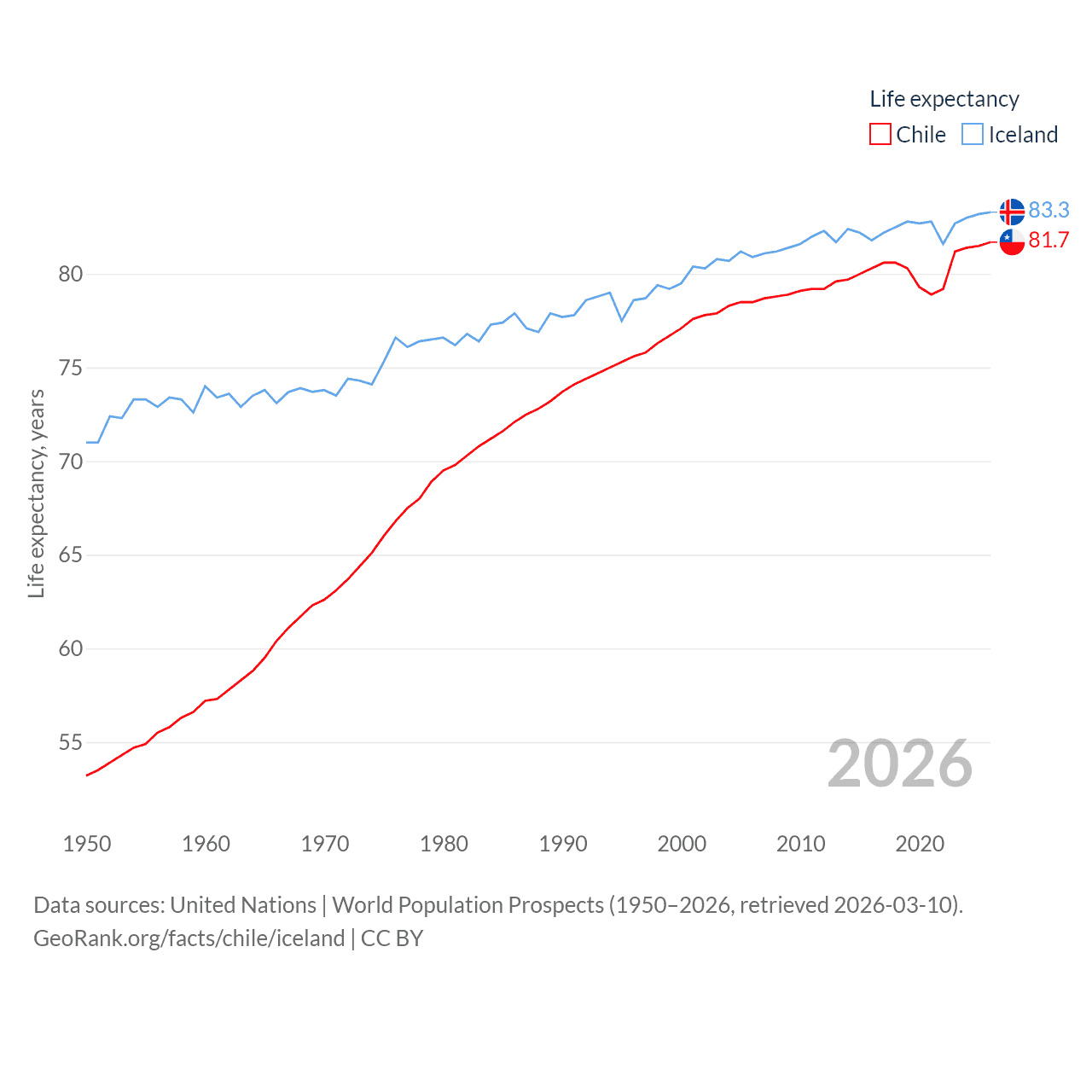 Chile has a population of 19.8M (ranked 66/197), compared with 387K in Iceland (ranked 173/197). Chile's land area is 286,809 sq mi versus 38,931 sq mi for Iceland (ranked 38th vs. 104th).