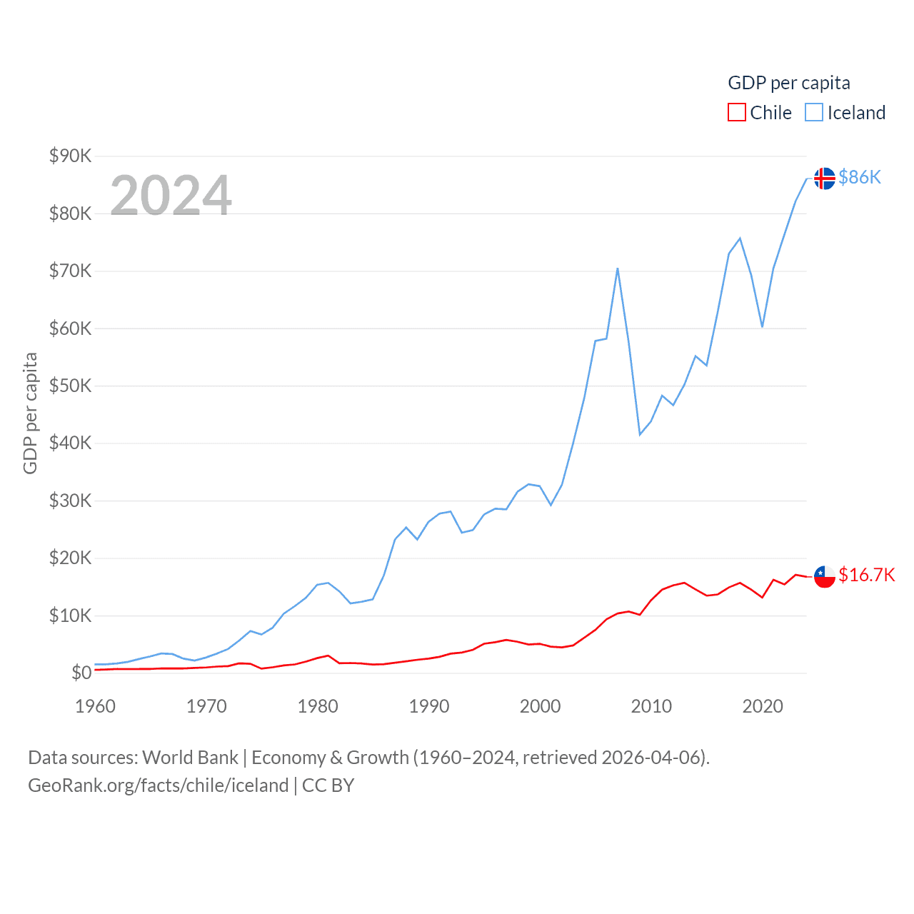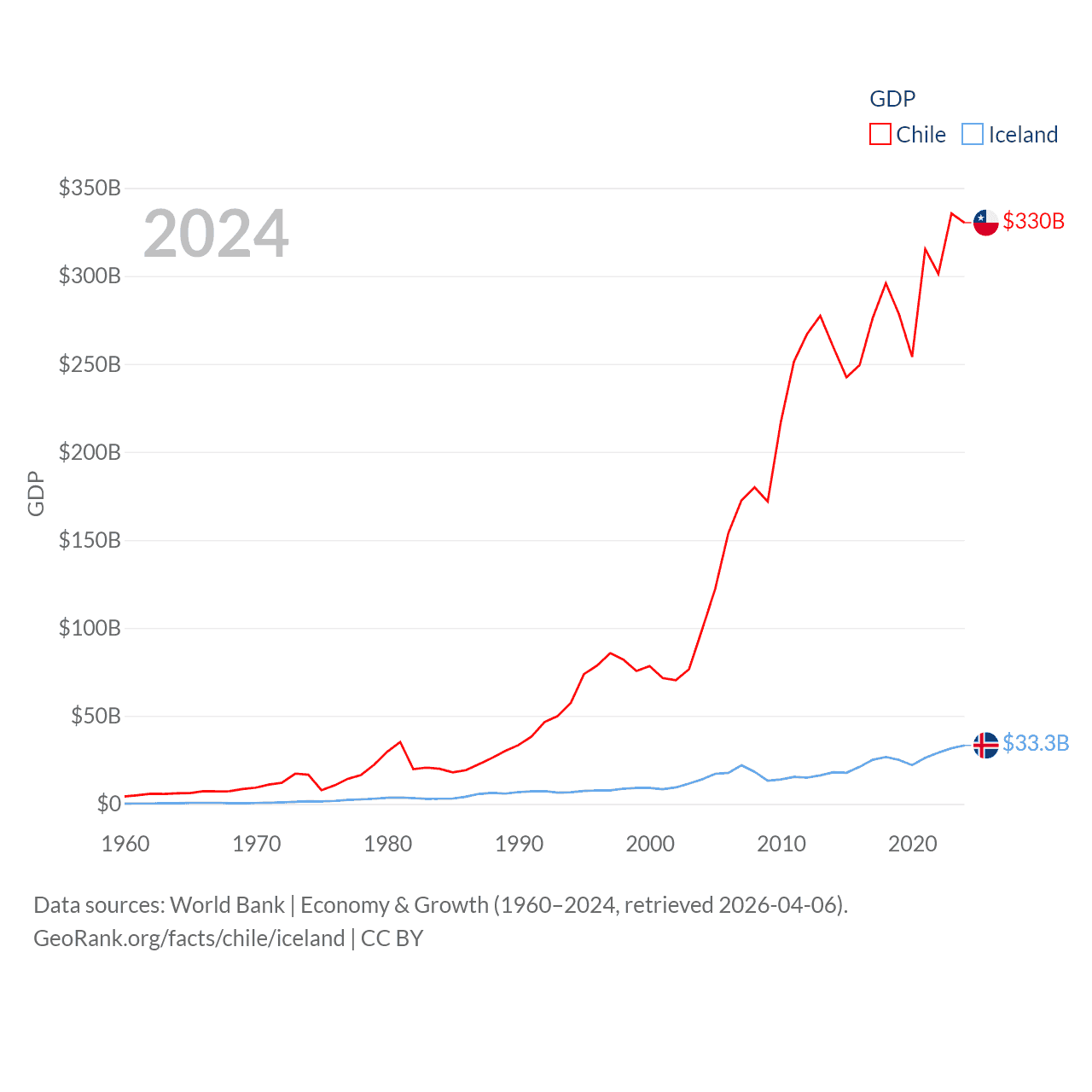 By GDP, Chile ranks 45/197 ($330B) and Iceland ranks 108/197 ($33.3B). By GDP per capita, Chile ranks 65/197 ($16,710), while Iceland ranks 9/197 ($86,041).