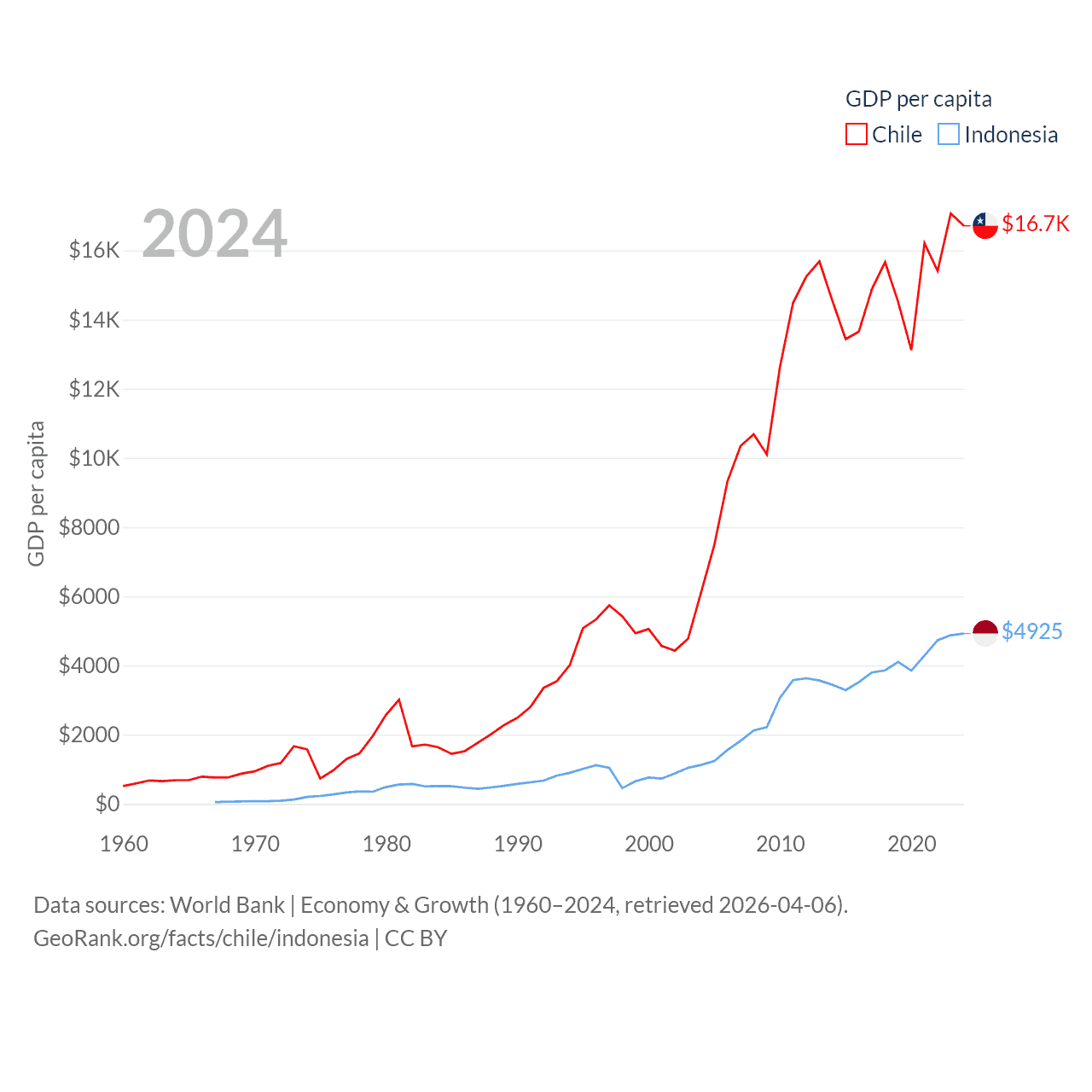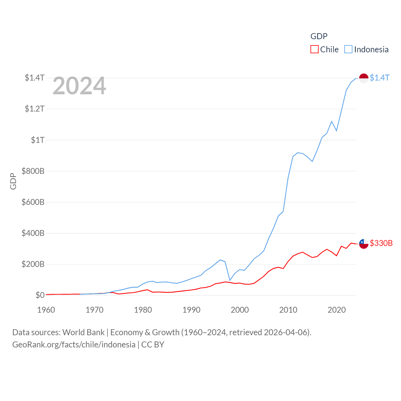By GDP, Chile ranks 45/197 ($330B) and Indonesia ranks 16/197 ($1.4T). By GDP per capita, Chile ranks 65/197 ($16,710), while Indonesia ranks 121/197 ($4,925).