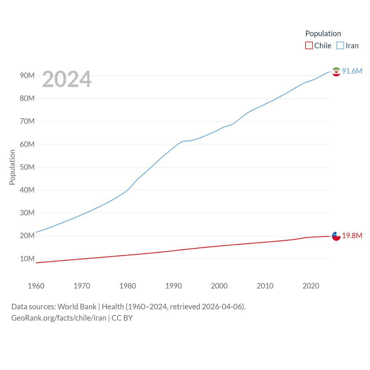 Chile has a population of 19.8M (ranked 66/197), compared with 91.6M in Iran (ranked 17/197). Chile's land area is 286,809 sq mi versus 626,451 sq mi for Iran (ranked 38th vs. 17th).