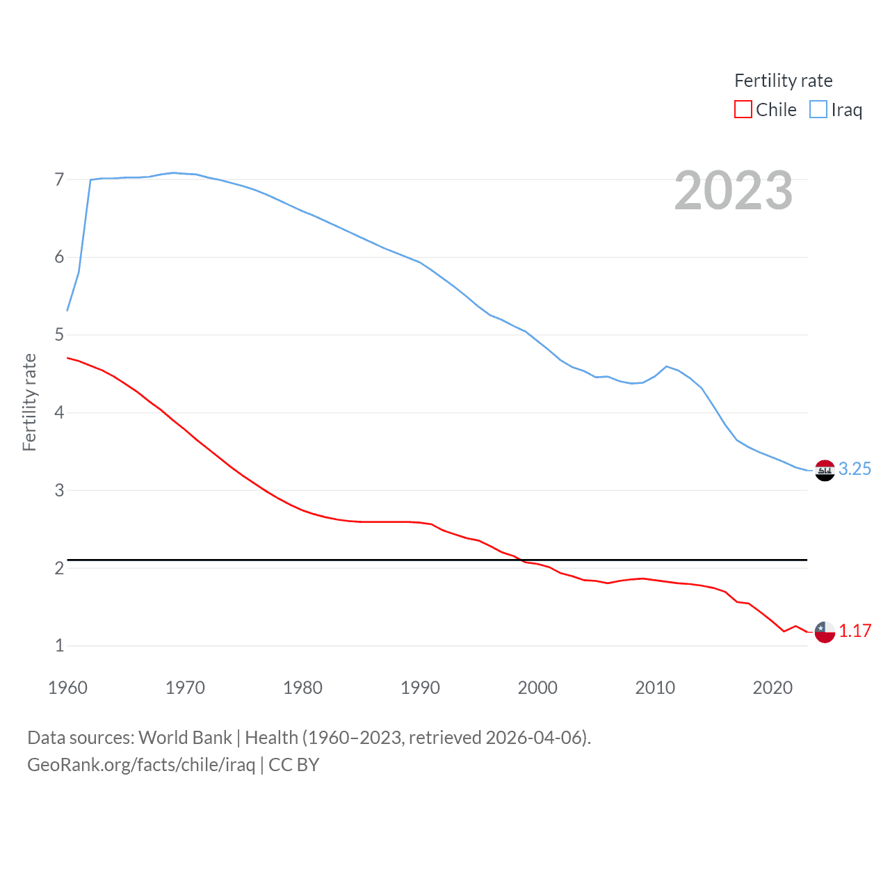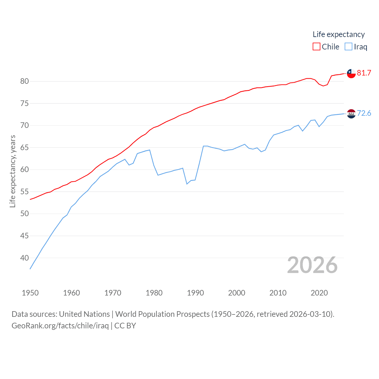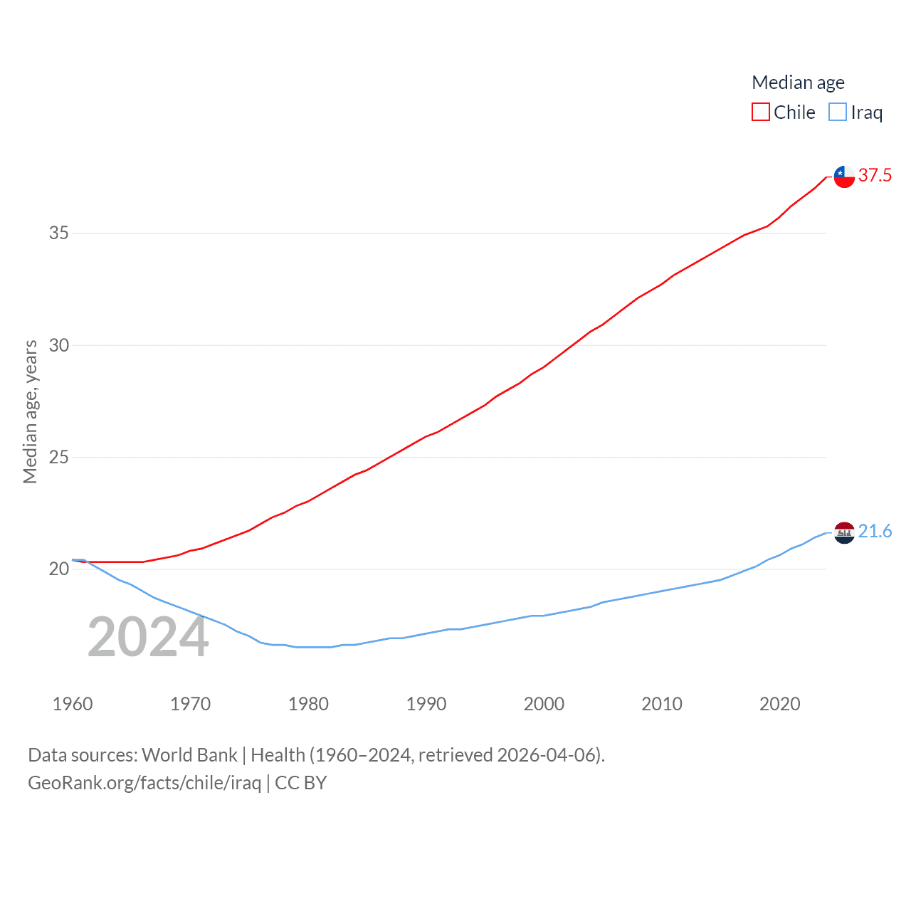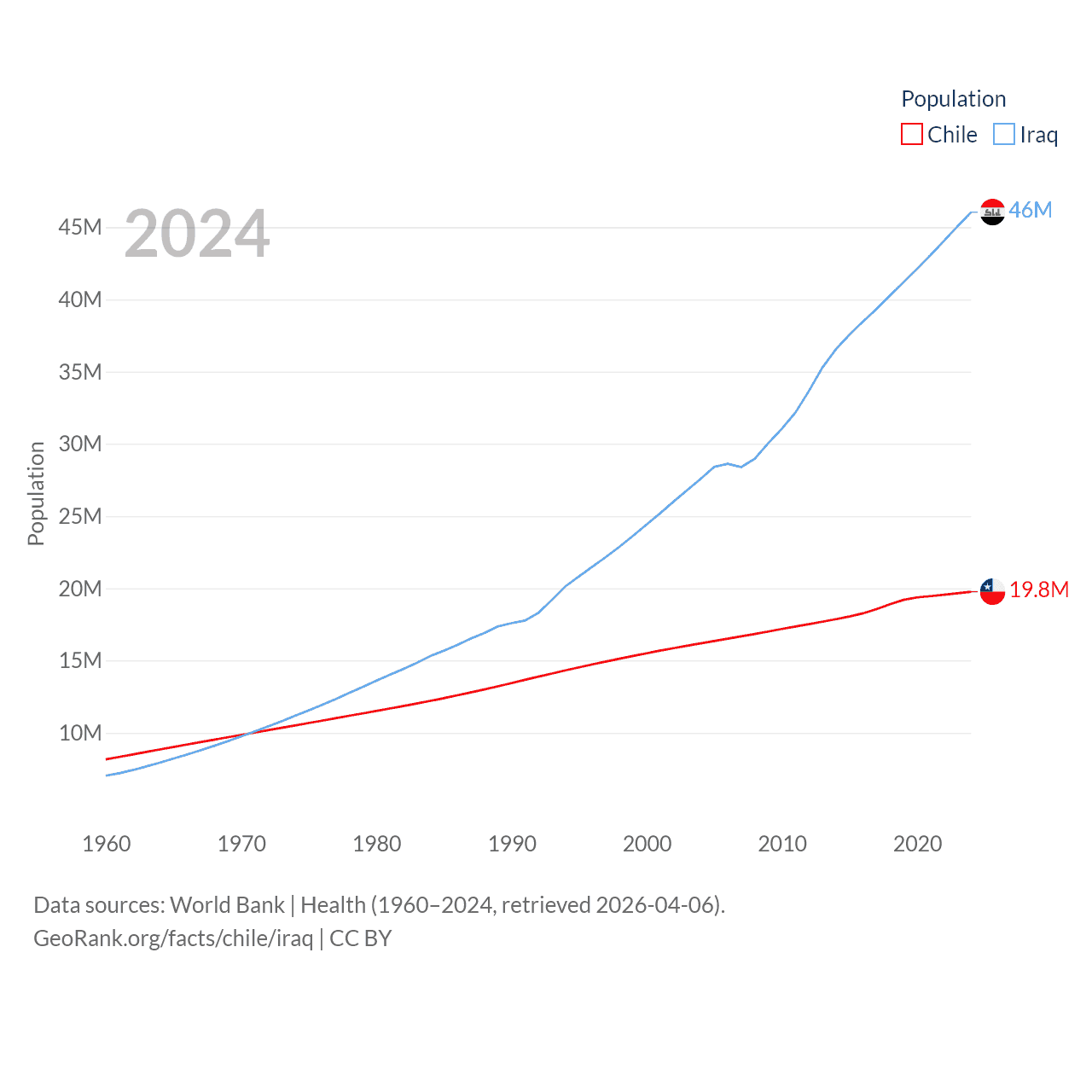 Chile has a population of 19.8M (ranked 66/197), compared with 46M in Iraq (ranked 34/197). Chile's land area is 286,809 sq mi versus 167,619 sq mi for Iraq (ranked 38th vs. 57th).
