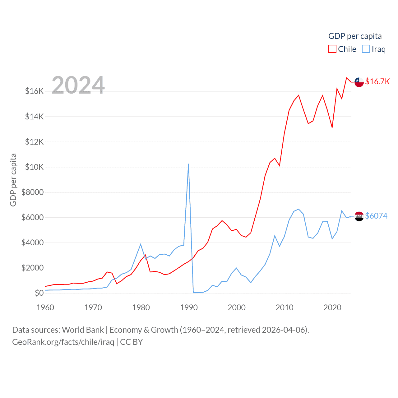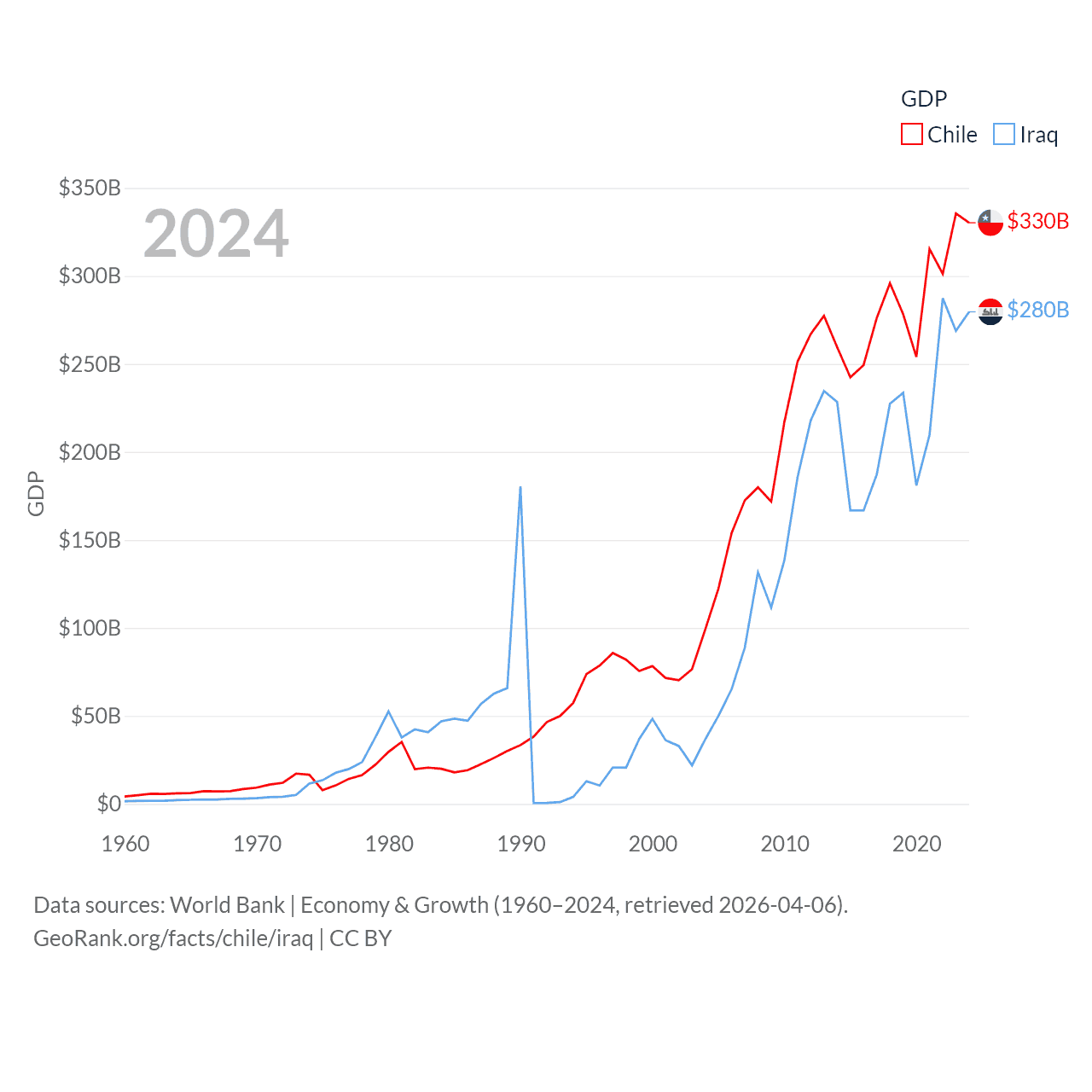 By GDP, Chile ranks 45/197 ($330B) and Iraq ranks 50/197 ($280B). By GDP per capita, Chile ranks 65/197 ($16,710), while Iraq ranks 113/197 ($6,074).