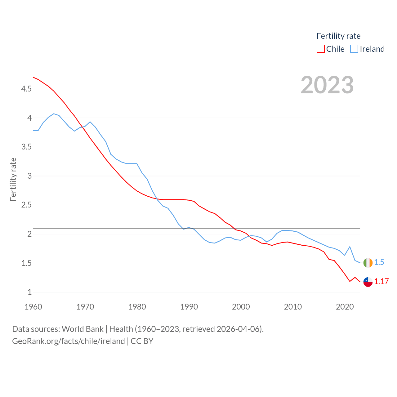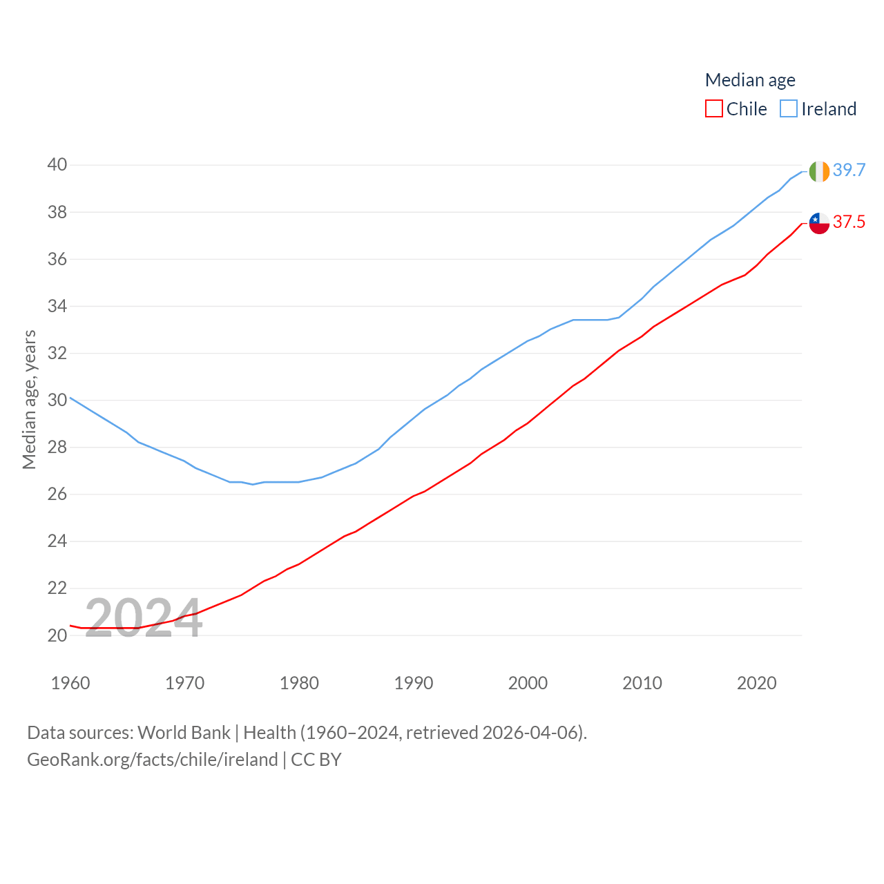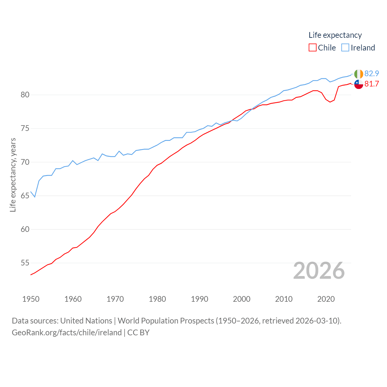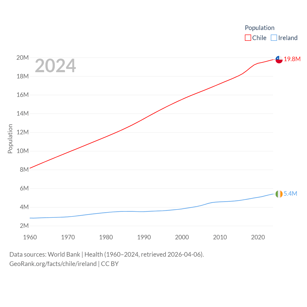 Chile has a population of 19.8M (ranked 66/197), compared with 5.4M in Ireland (ranked 120/197). Chile's land area is 286,809 sq mi versus 26,599 sq mi for Ireland (ranked 38th vs. 119th).