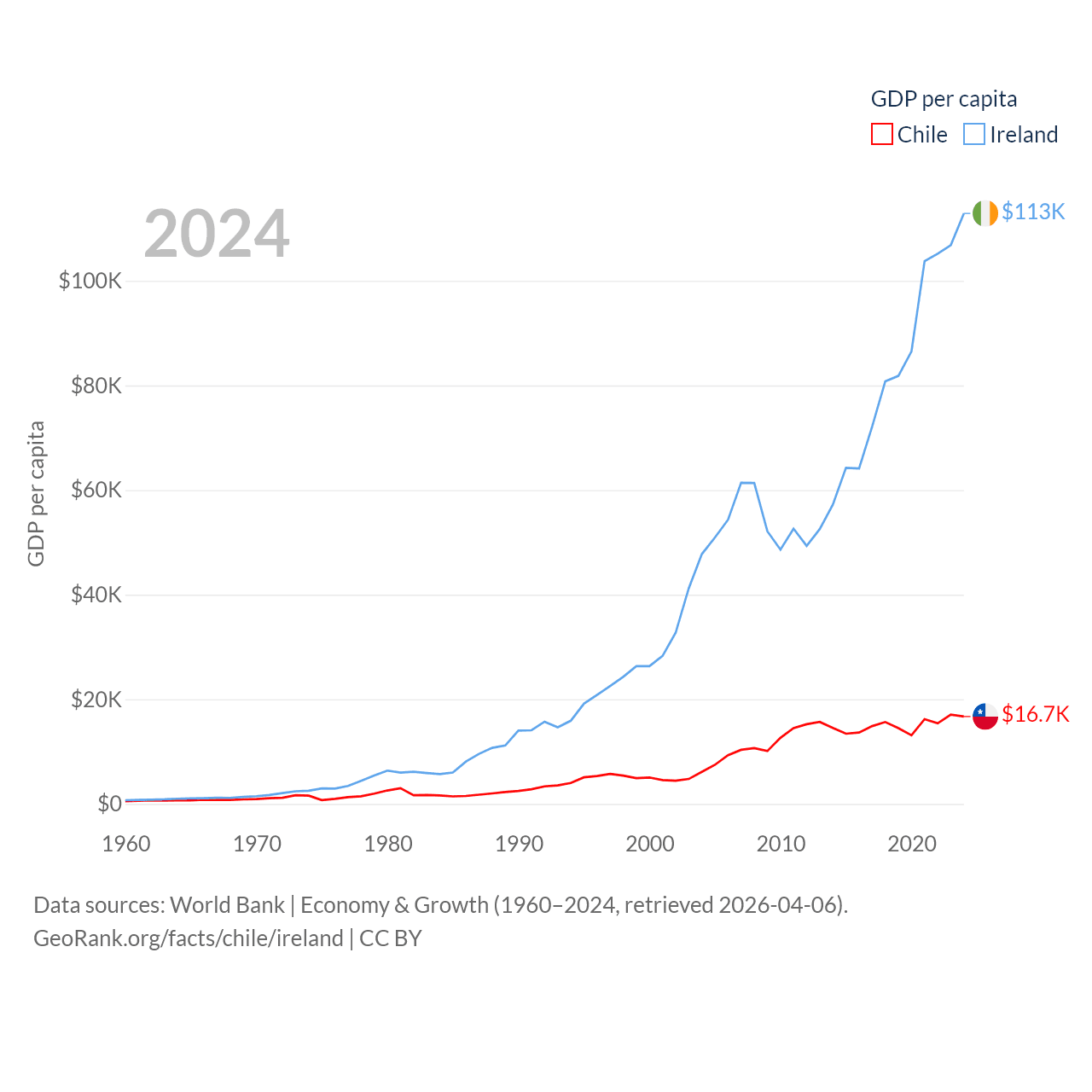 By GDP, Chile ranks 45/197 ($330B) and Ireland ranks 25/197 ($609B). By GDP per capita, Chile ranks 65/197 ($16,710), while Ireland ranks 4/197 ($112,895).