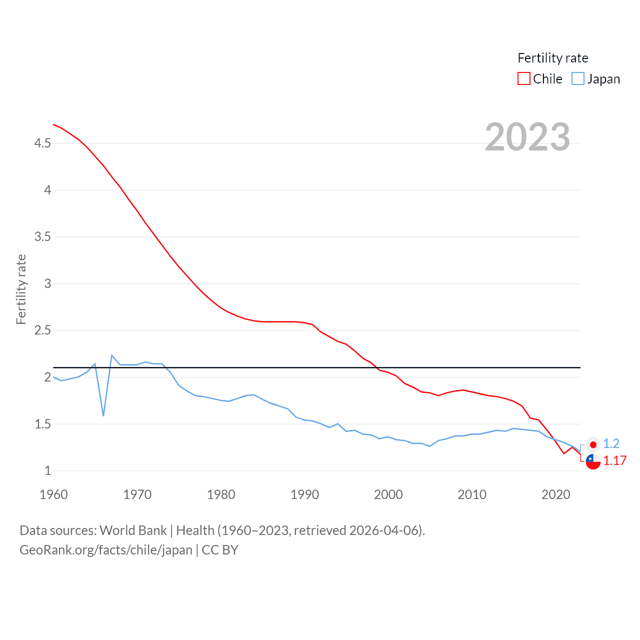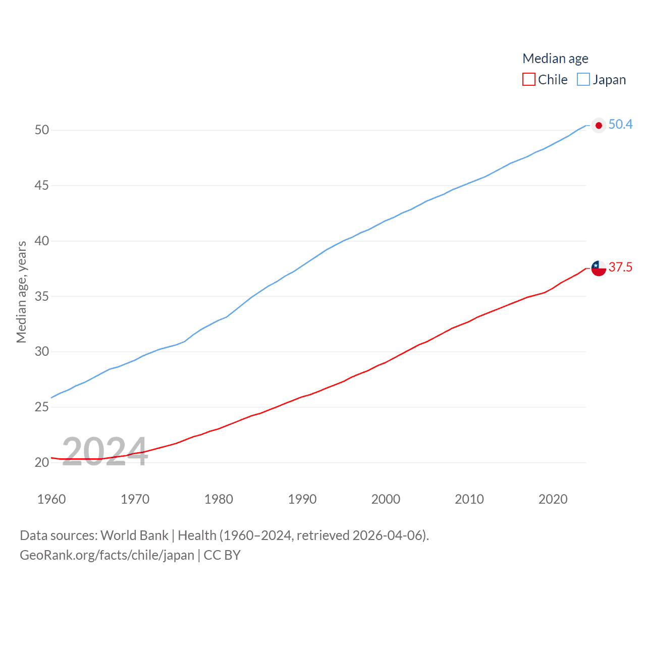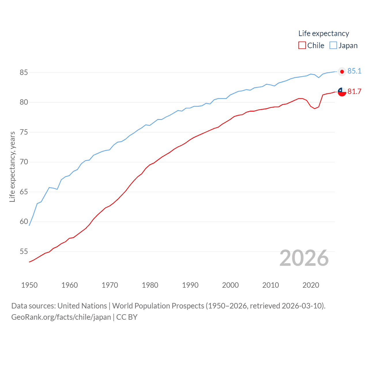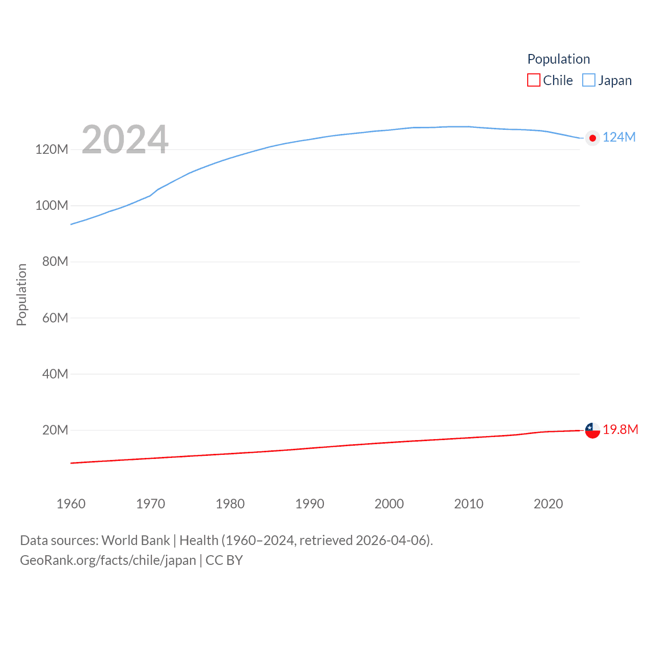 Chile has a population of 19.8M (ranked 66/197), compared with 124M in Japan (ranked 12/197). Chile's land area is 286,809 sq mi versus 140,761 sq mi for Japan (ranked 38th vs. 61st).