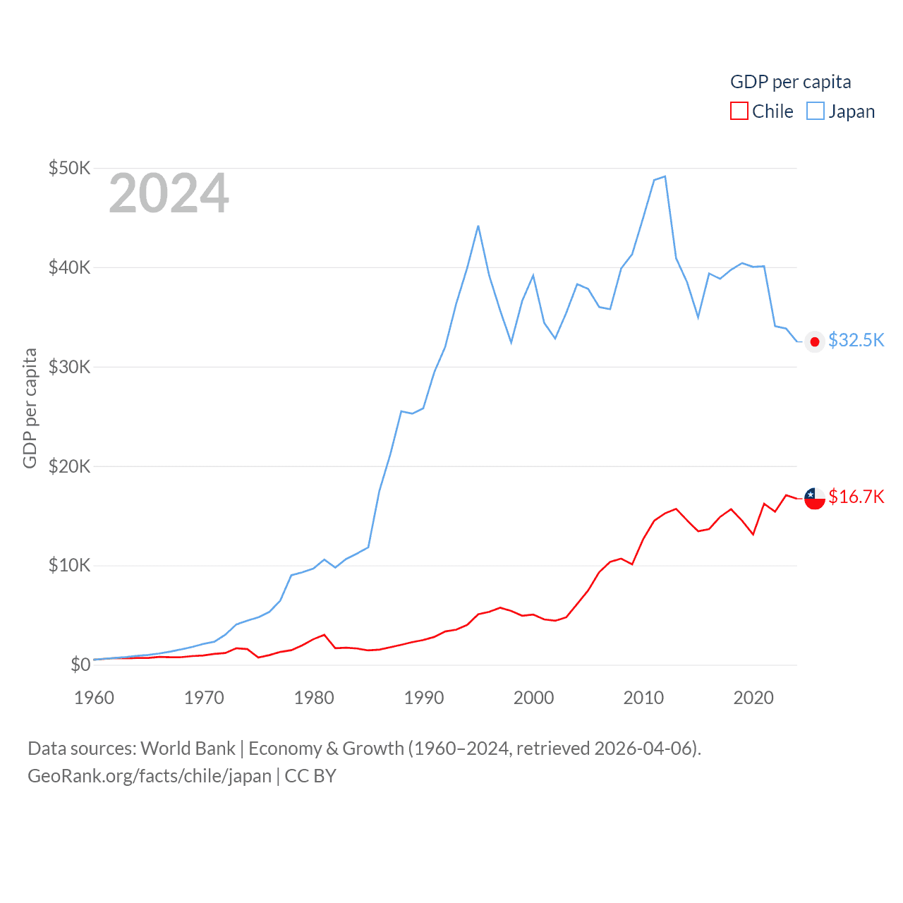 By GDP, Chile ranks 45/197 ($330B) and Japan ranks 4/197 ($4.03T). By GDP per capita, Chile ranks 65/197 ($16,710), while Japan ranks 38/197 ($32,487).