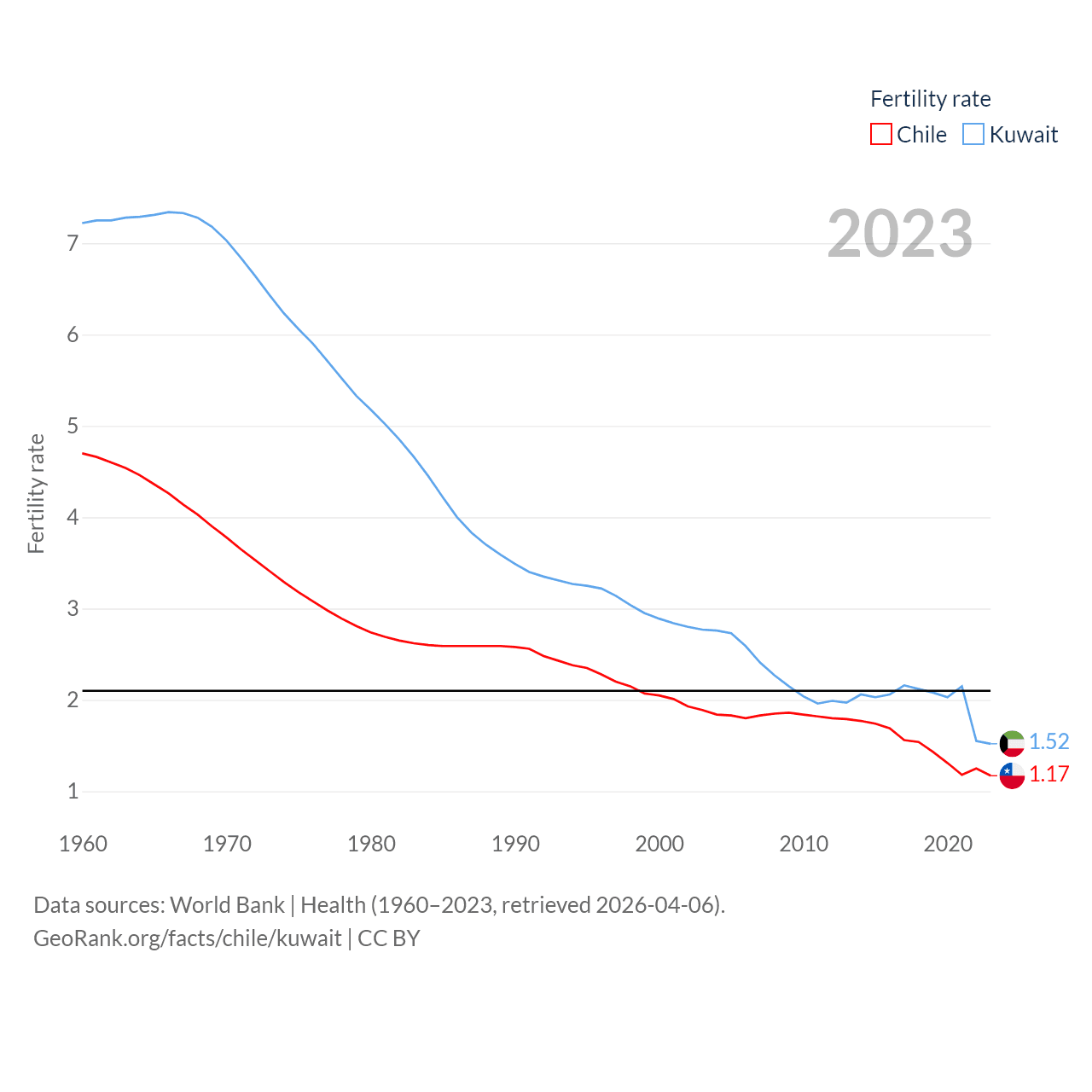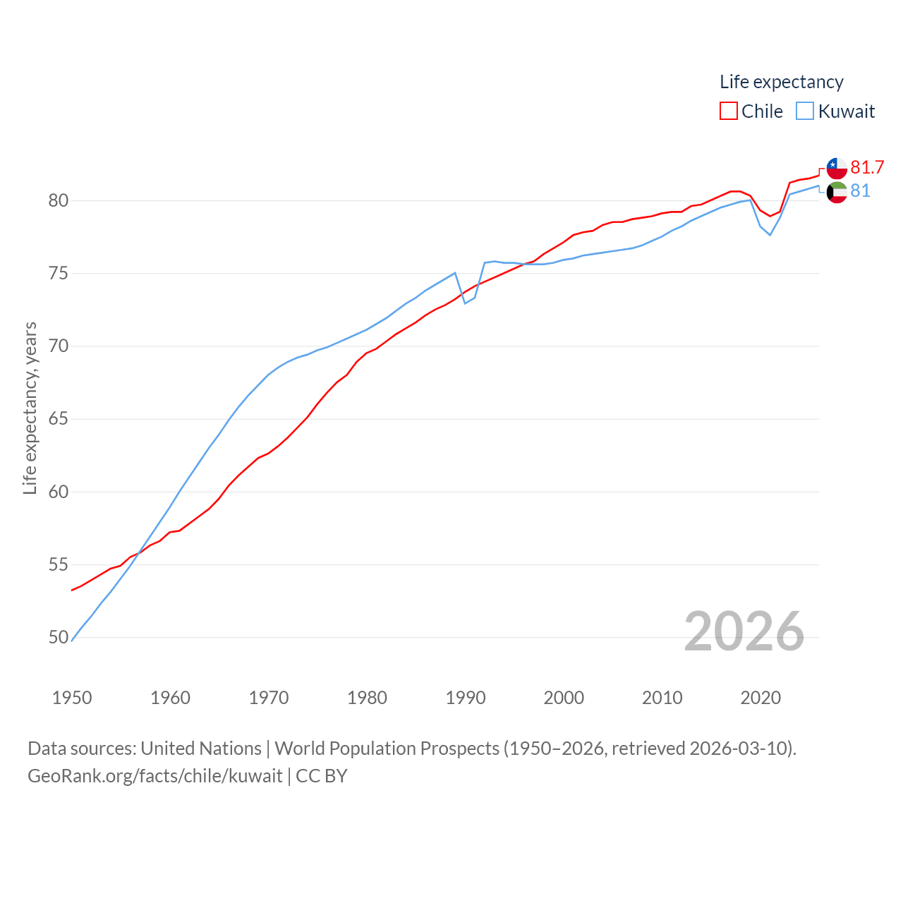 Chile has a population of 19.8M (ranked 66/197), compared with 4.9M in Kuwait (ranked 127/197). Chile's land area is 286,809 sq mi versus 6,880 sq mi for Kuwait (ranked 38th vs. 153rd).