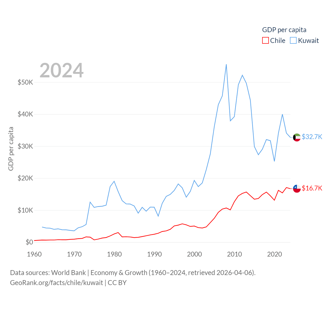 By GDP, Chile ranks 45/197 ($330B) and Kuwait ranks 59/197 ($160B). By GDP per capita, Chile ranks 65/197 ($16,710), while Kuwait ranks 37/197 ($32,718).