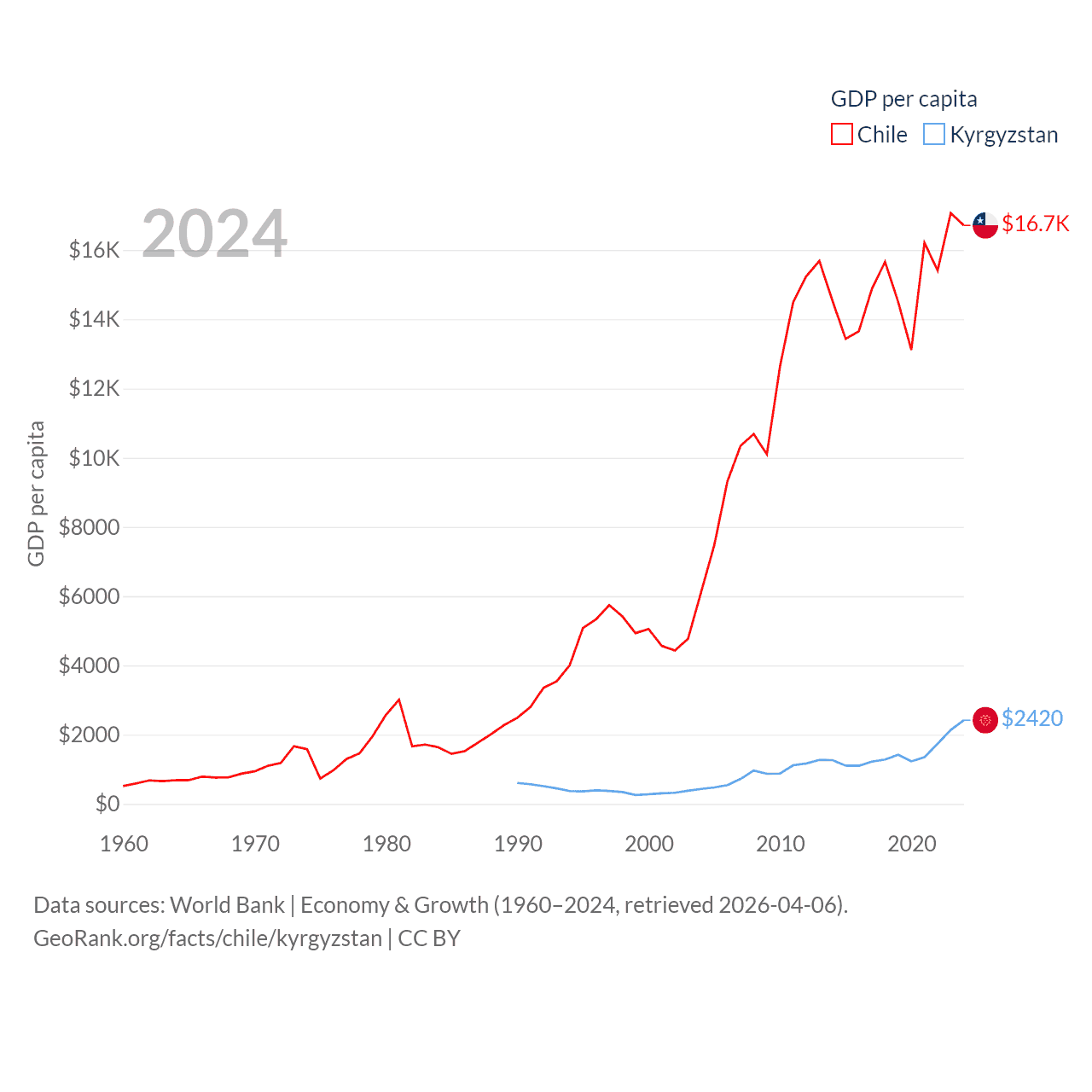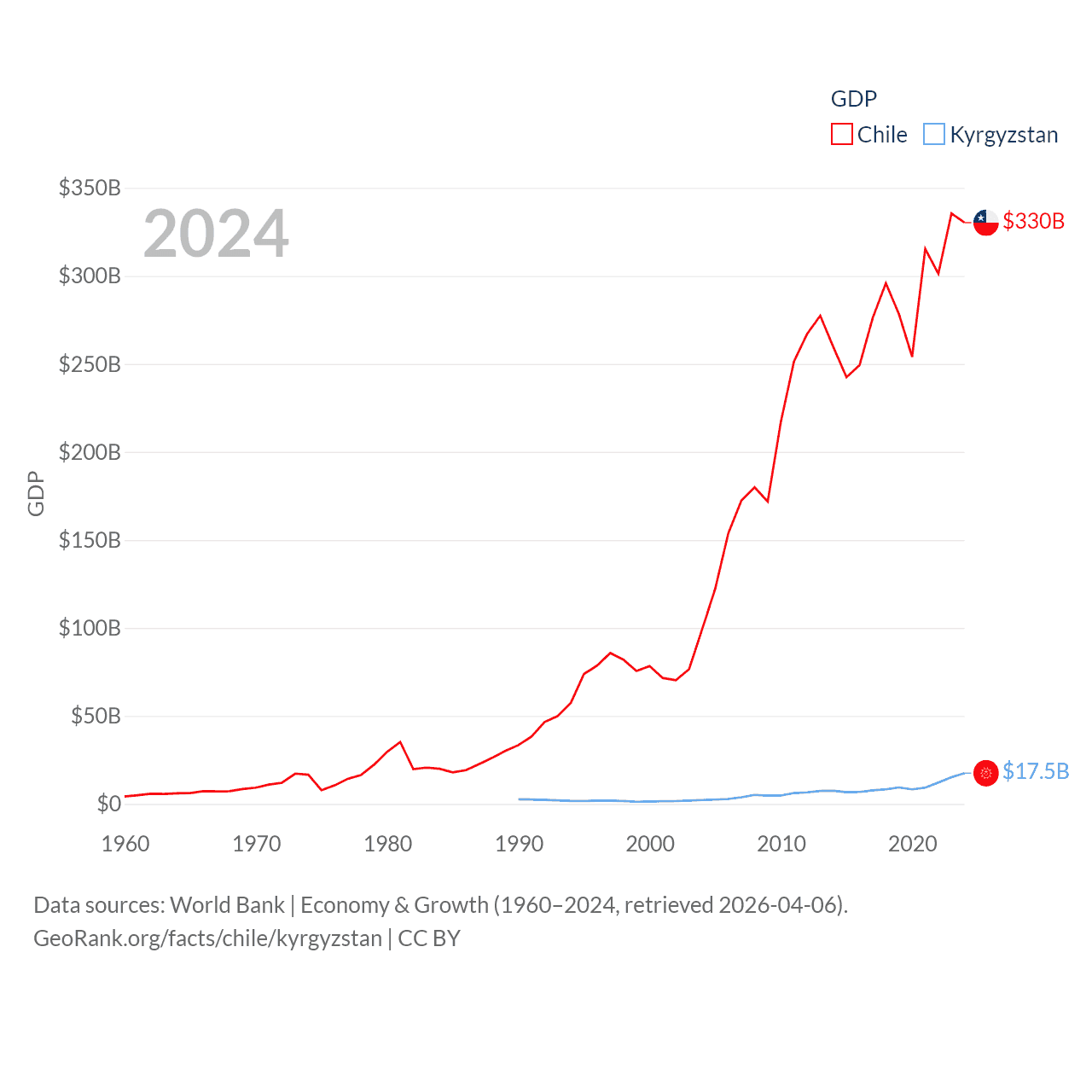 By GDP, Chile ranks 45/197 ($330B) and Kyrgyzstan ranks 135/197 ($17.5B). By GDP per capita, Chile ranks 65/197 ($16,710), while Kyrgyzstan ranks 150/197 ($2,420).