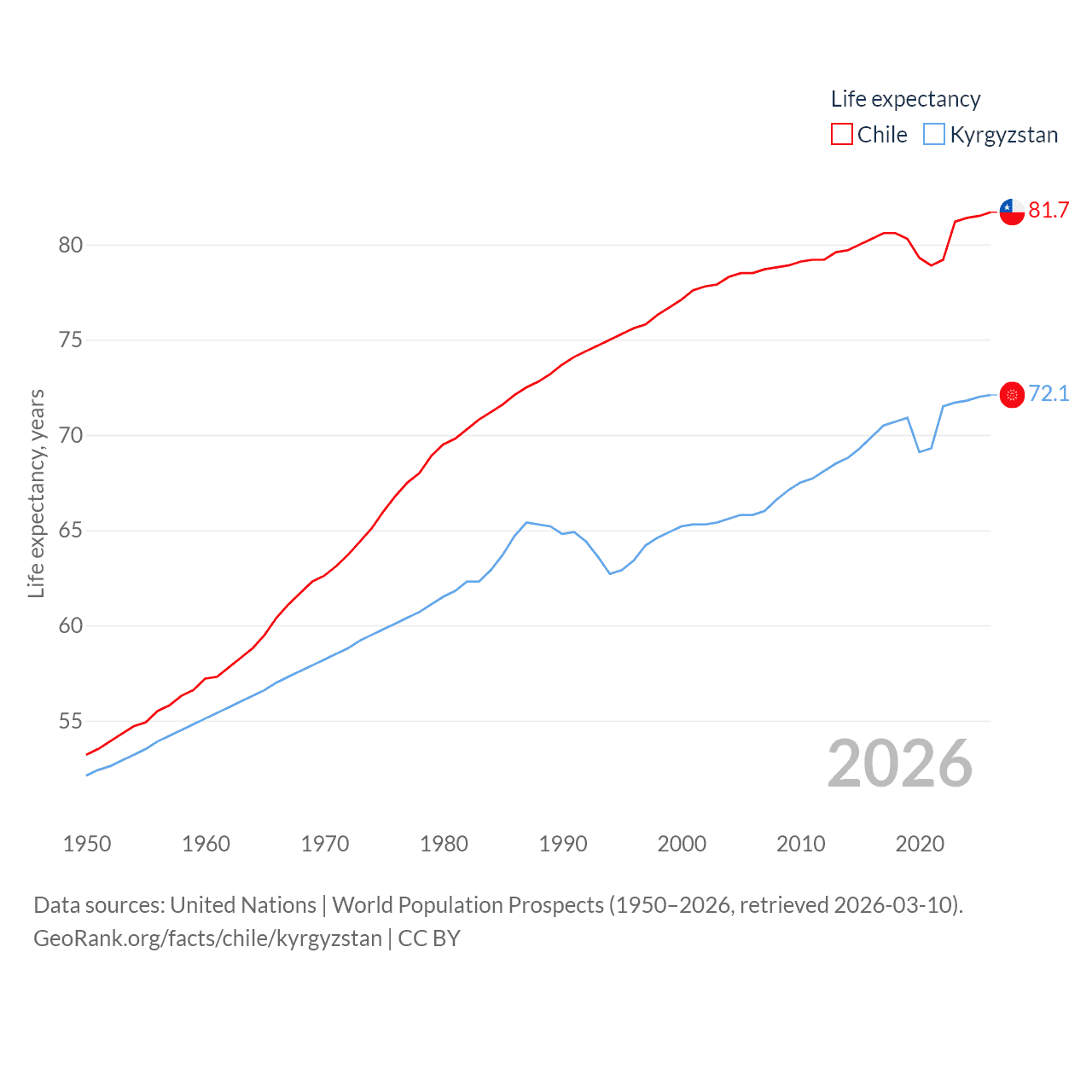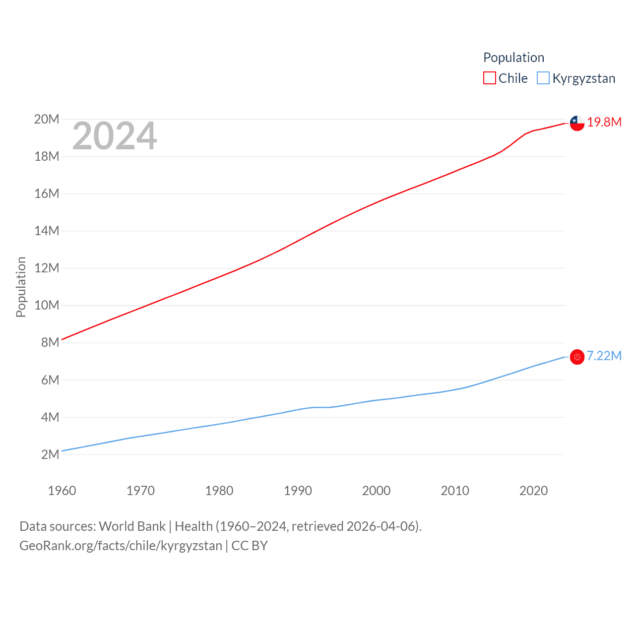 Chile has a population of 19.8M (ranked 66/197), compared with 7.22M in Kyrgyzstan (ranked 106/197). Chile's land area is 286,809 sq mi versus 74,054 sq mi for Kyrgyzstan (ranked 38th vs. 86th).