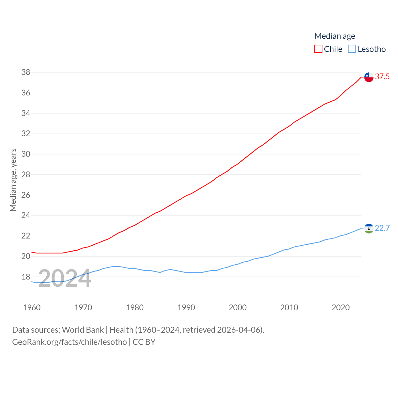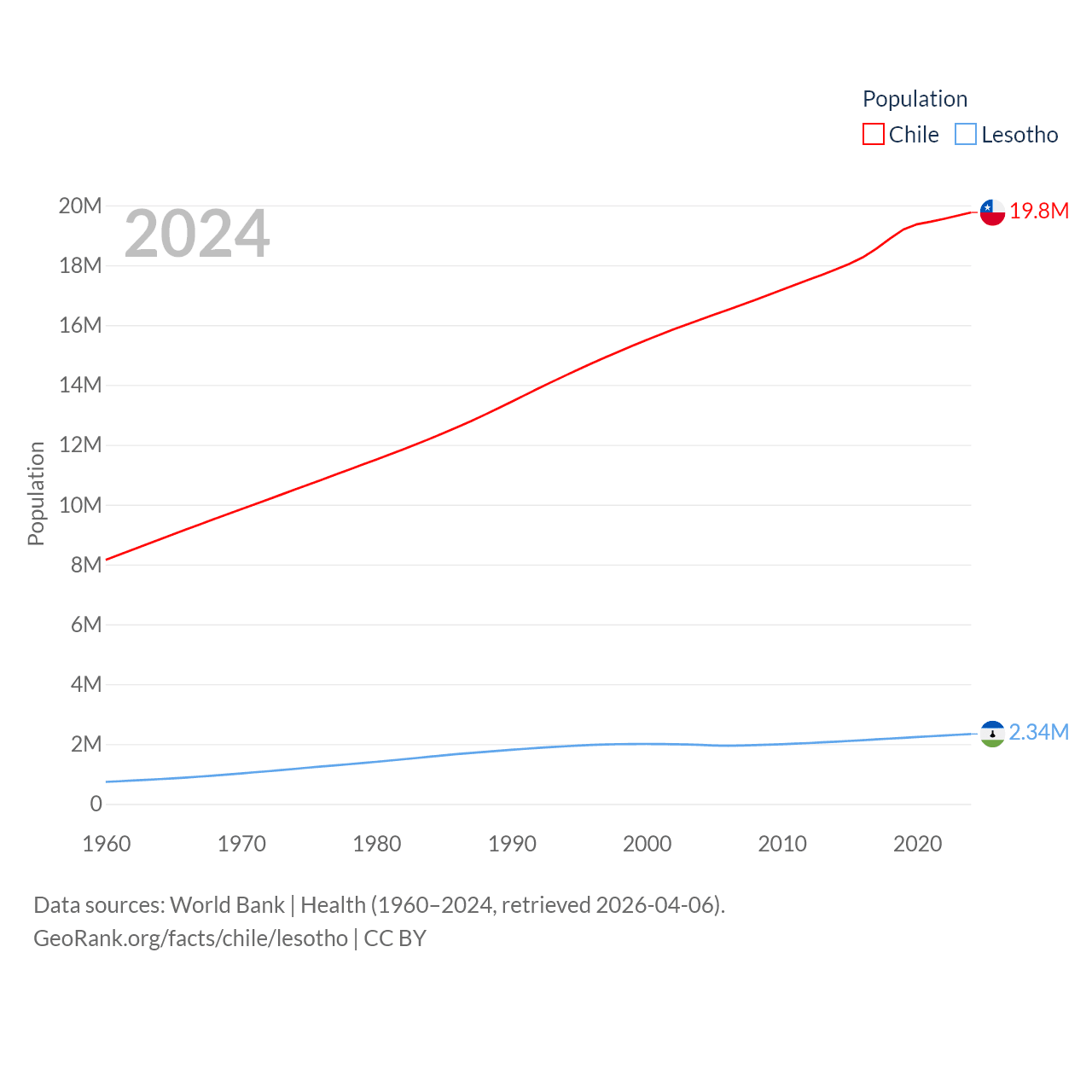 Chile has a population of 19.8M (ranked 66/197), compared with 2.34M in Lesotho (ranked 145/197). Chile's land area is 286,809 sq mi versus 11,722 sq mi for Lesotho (ranked 38th vs. 137th).