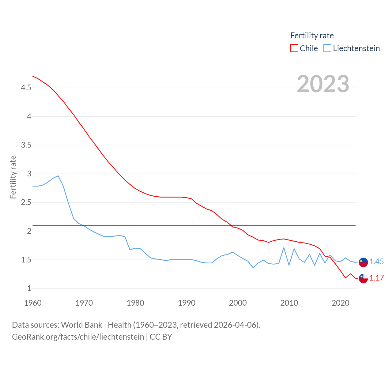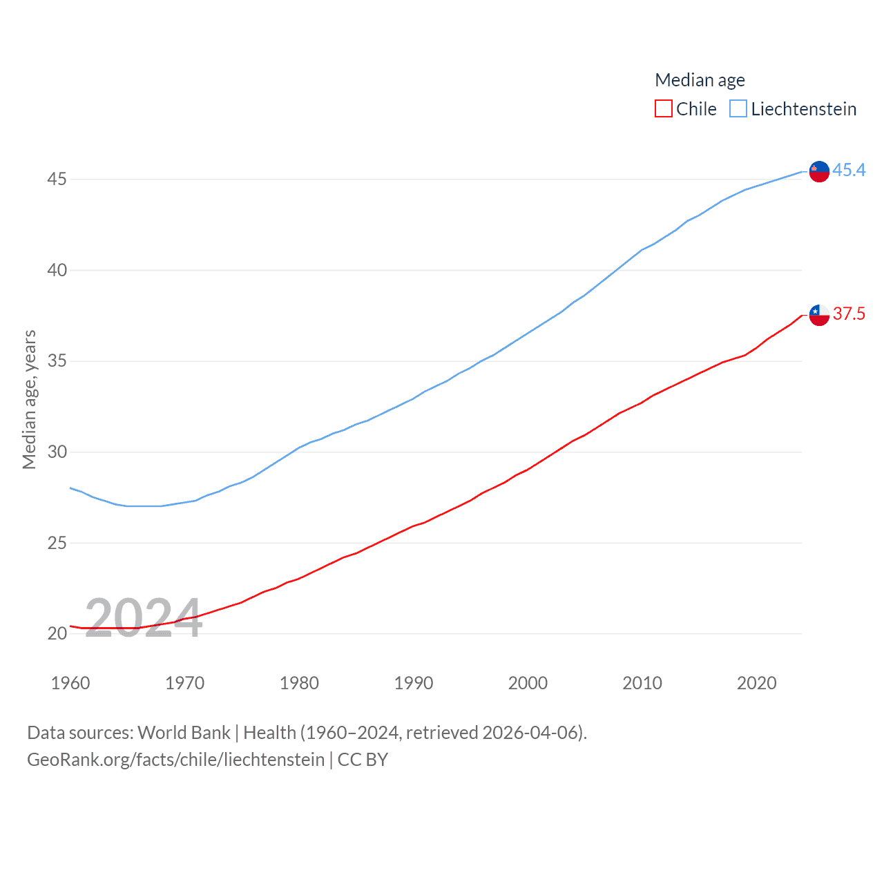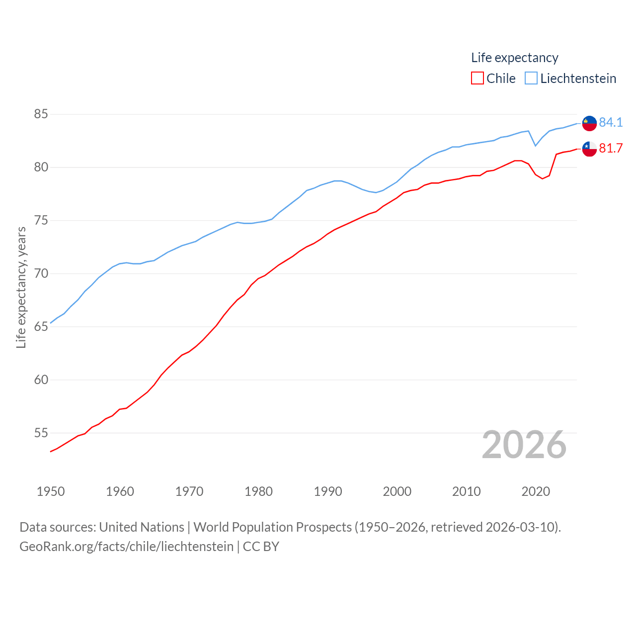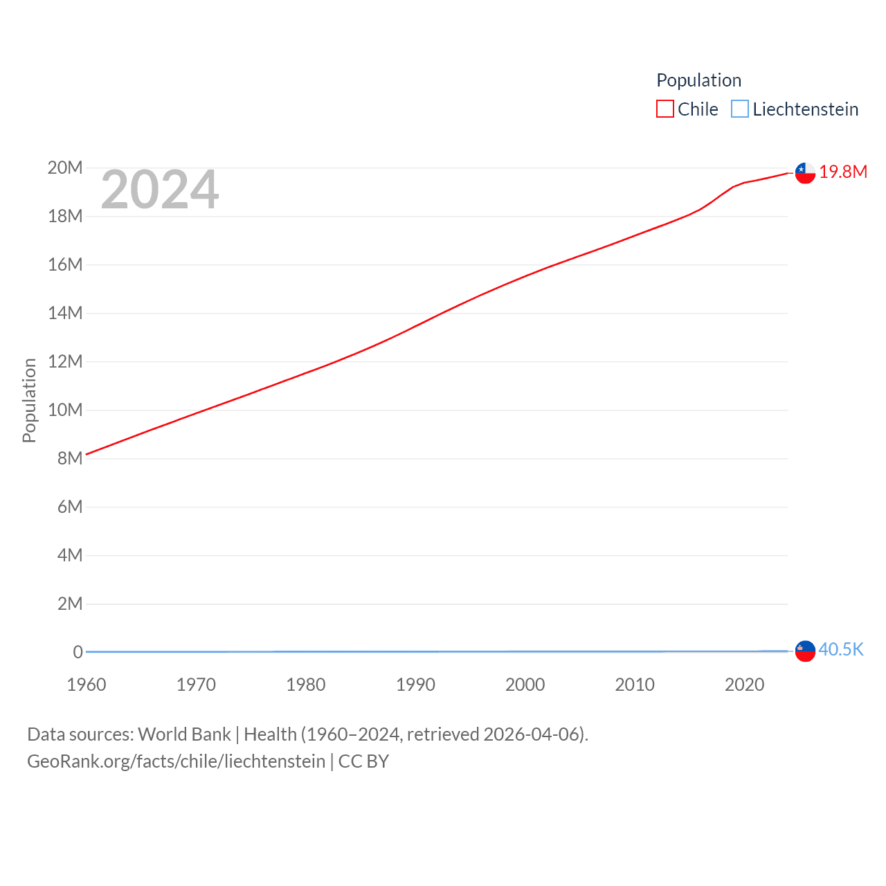 Chile has a population of 19.8M (ranked 66/197), compared with 40.4K in Liechtenstein (ranked 190/197). Chile's land area is 286,809 sq mi versus 61.8 sq mi for Liechtenstein (ranked 38th vs. 192nd).