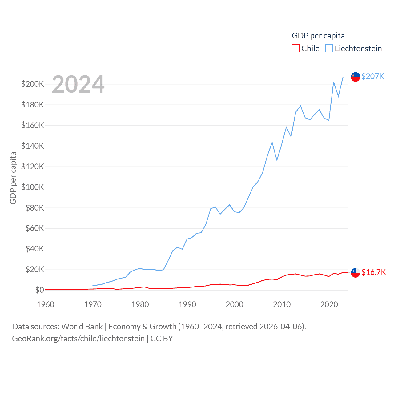 By GDP, Chile ranks 45/197 ($330B) and Liechtenstein ranks 156/197 ($8.24B). By GDP per capita, Chile ranks 65/197 ($16,710), while Liechtenstein ranks 2/197 ($206,781).
