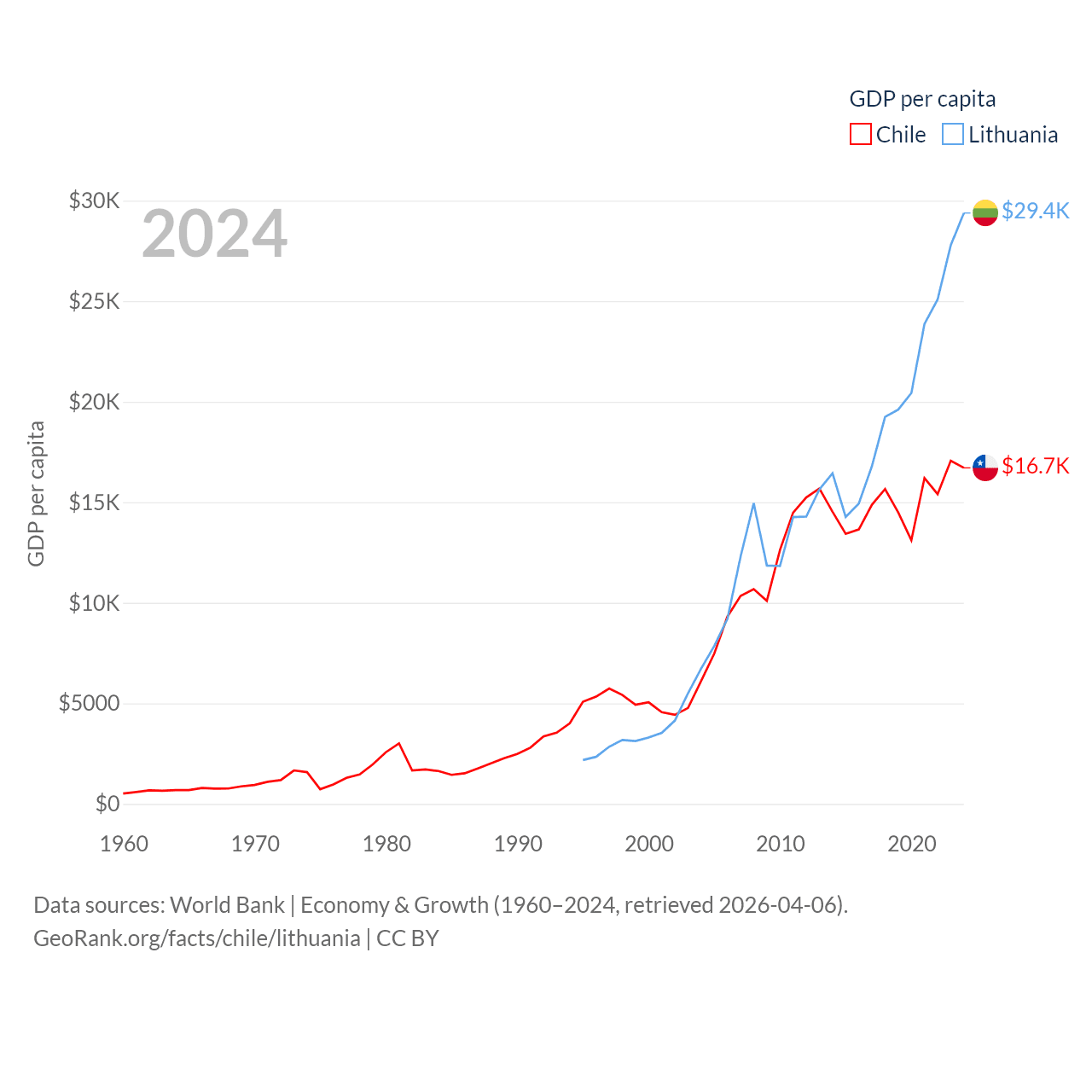 By GDP, Chile ranks 45/197 ($330B) and Lithuania ranks 79/197 ($84.9B). By GDP per capita, Chile ranks 65/197 ($16,710), while Lithuania ranks 43/197 ($29,384).