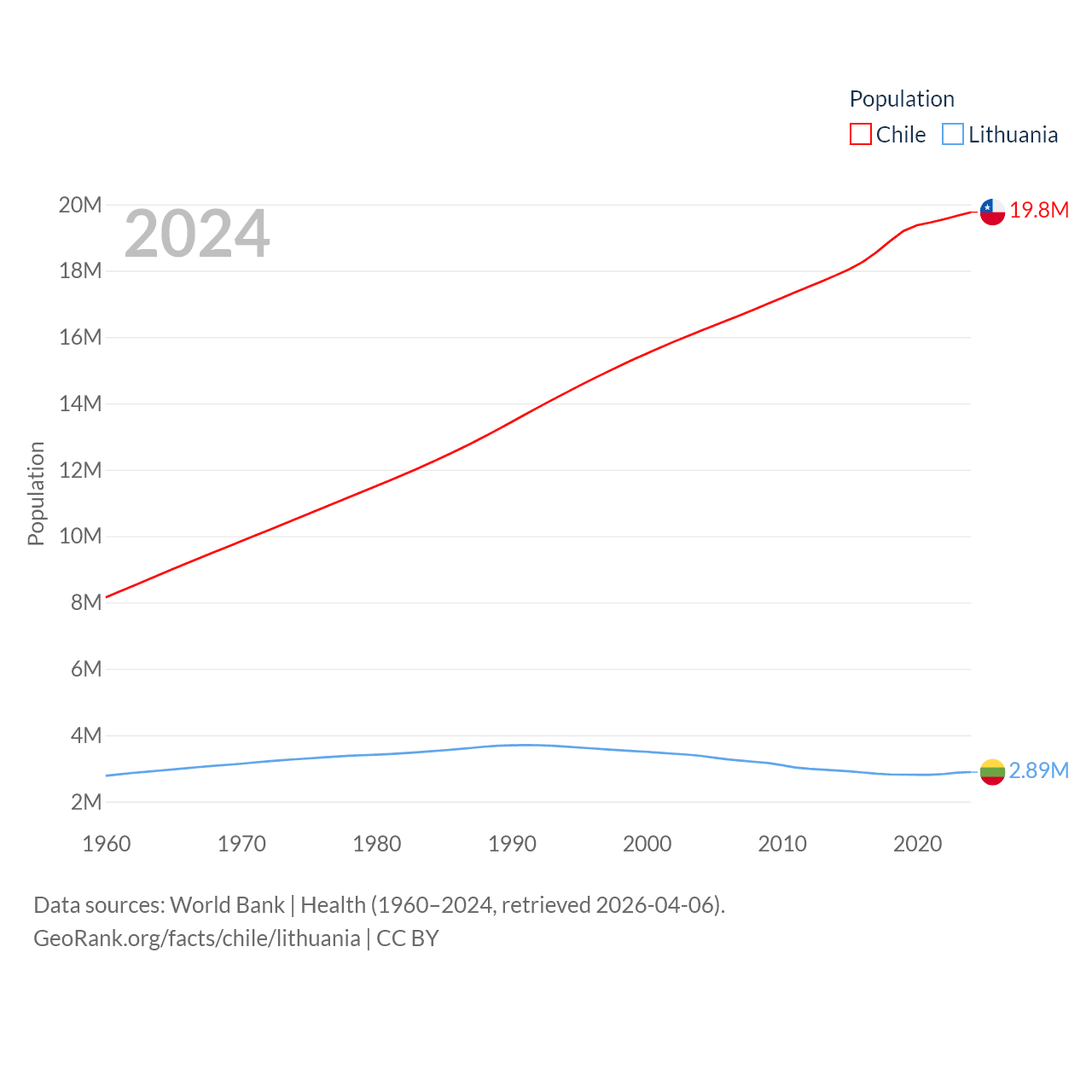 Chile has a population of 19.8M (ranked 66/197), compared with 2.89M in Lithuania (ranked 137/197). Chile's land area is 286,809 sq mi versus 24,170 sq mi for Lithuania (ranked 38th vs. 120th).