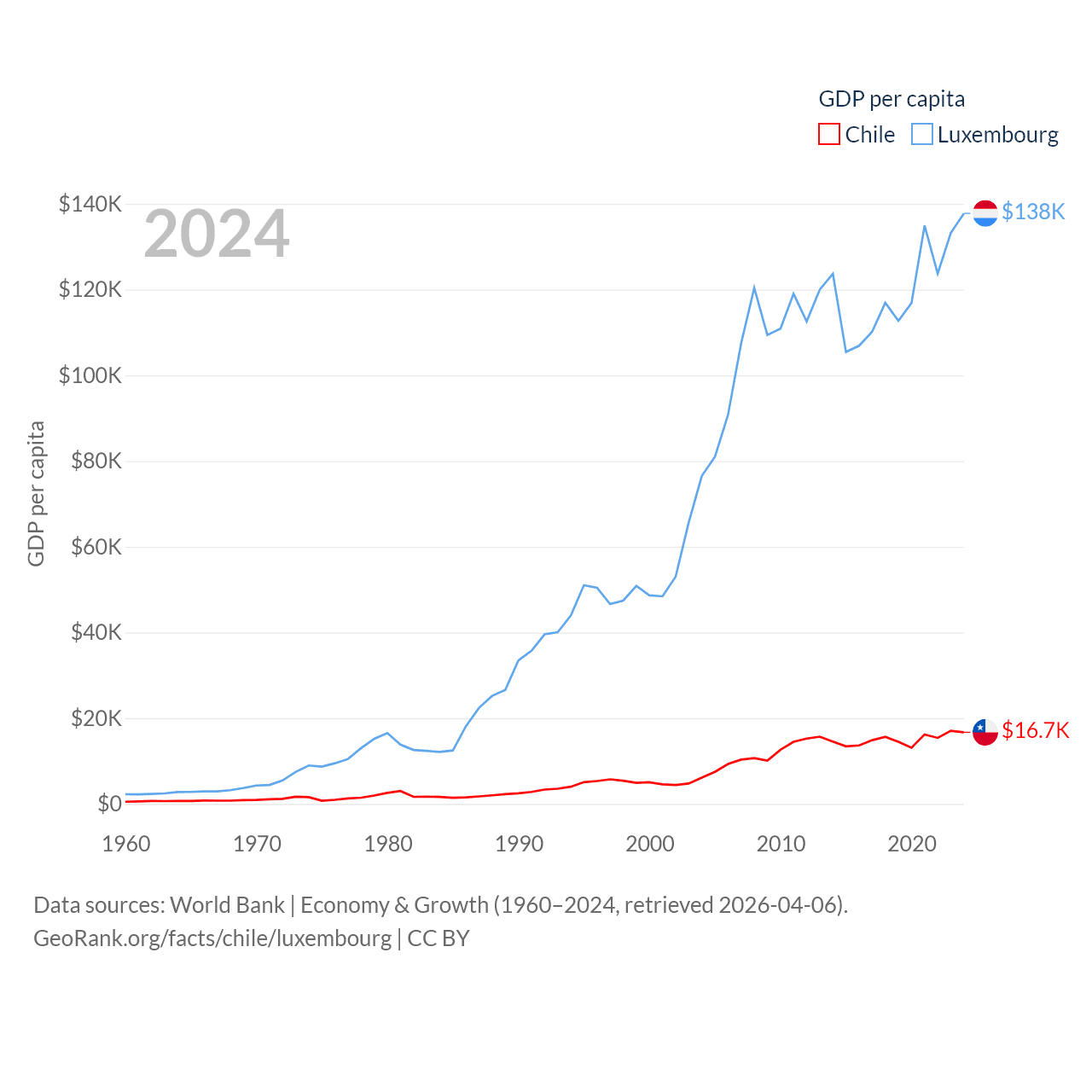 By GDP, Chile ranks 45/197 ($330B) and Luxembourg ranks 74/197 ($93.3B). By GDP per capita, Chile ranks 65/197 ($16,710), while Luxembourg ranks 3/197 ($137,782).