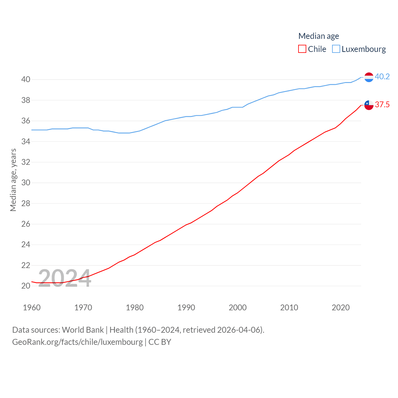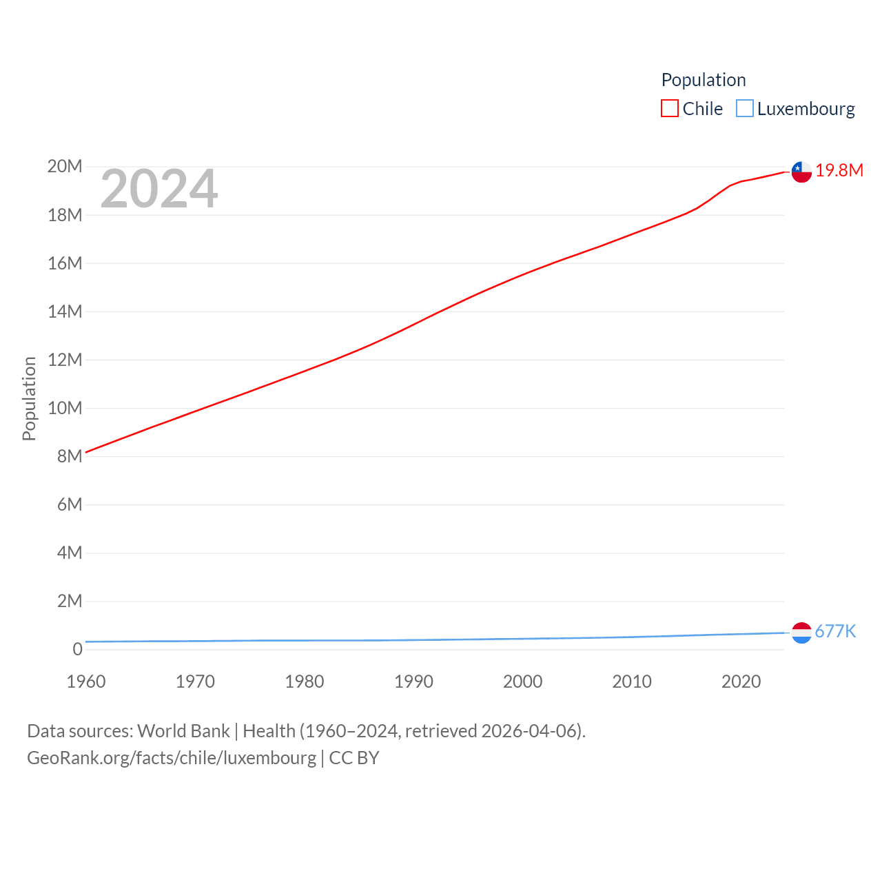 Chile has a population of 19.8M (ranked 66/197), compared with 677K in Luxembourg (ranked 164/197). Chile's land area is 286,809 sq mi versus 994 sq mi for Luxembourg (ranked 38th vs. 169th).