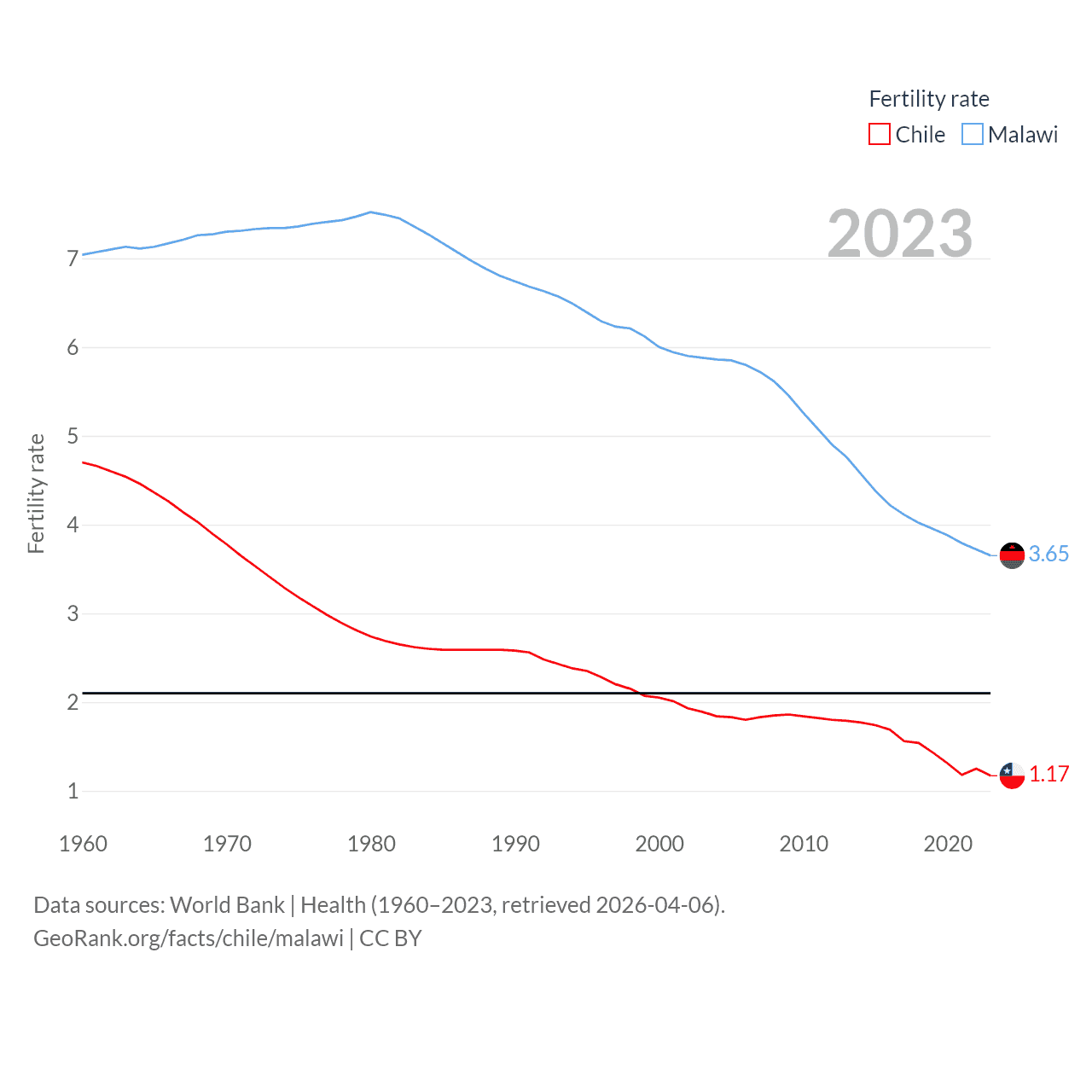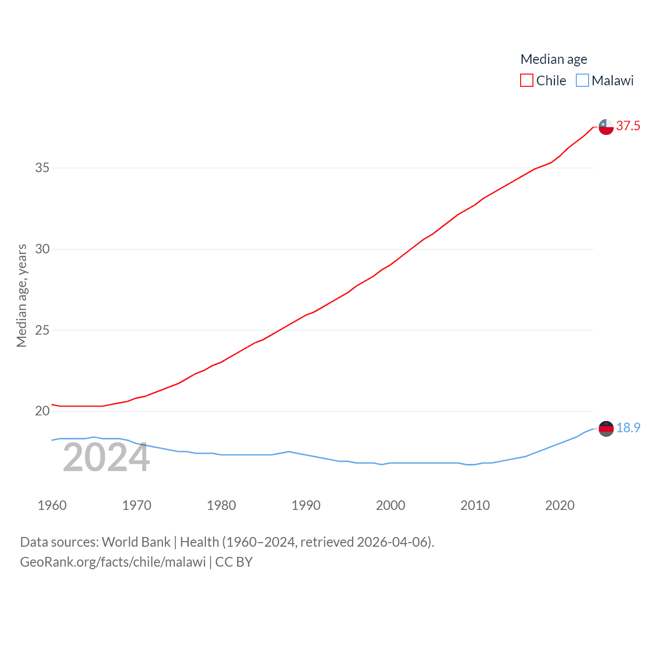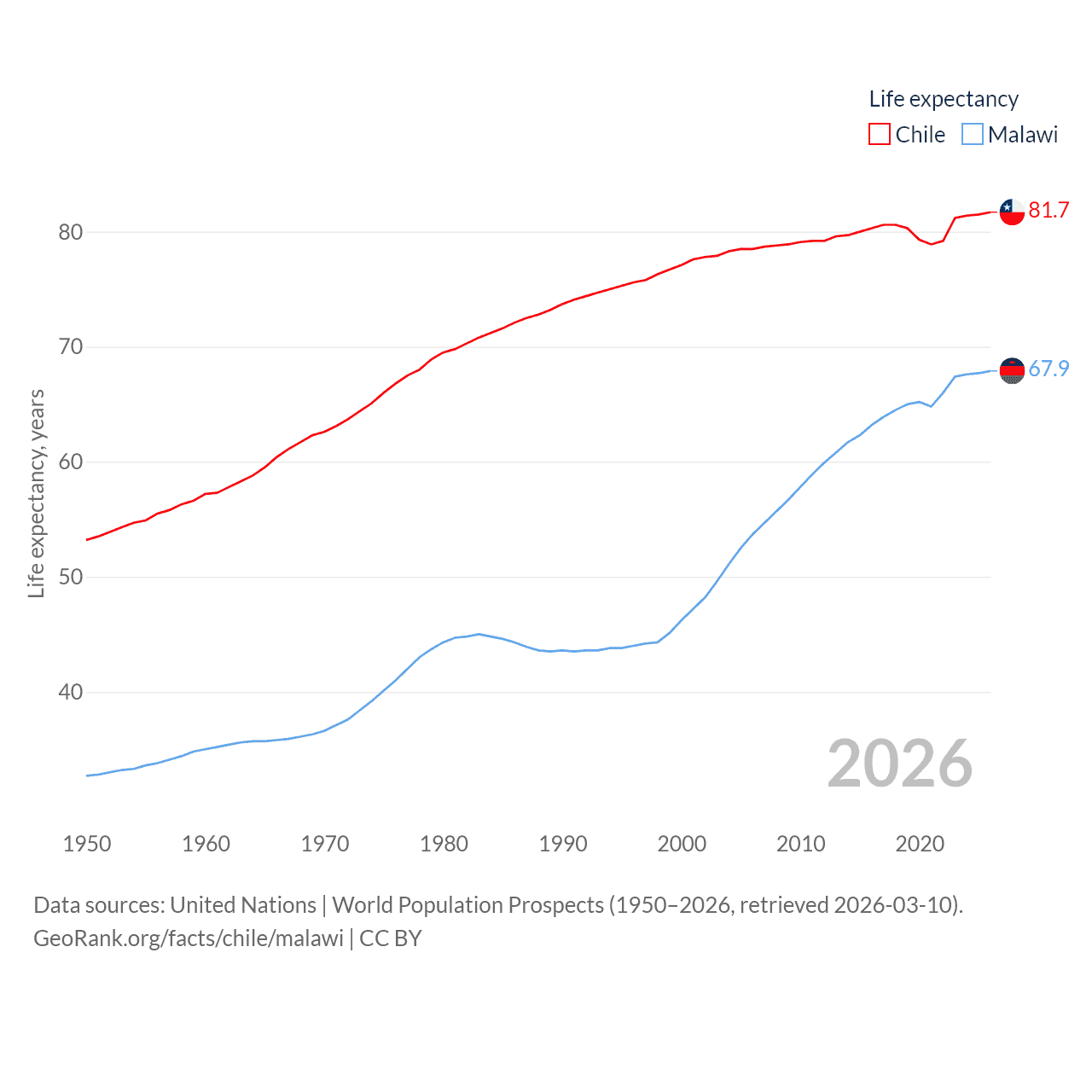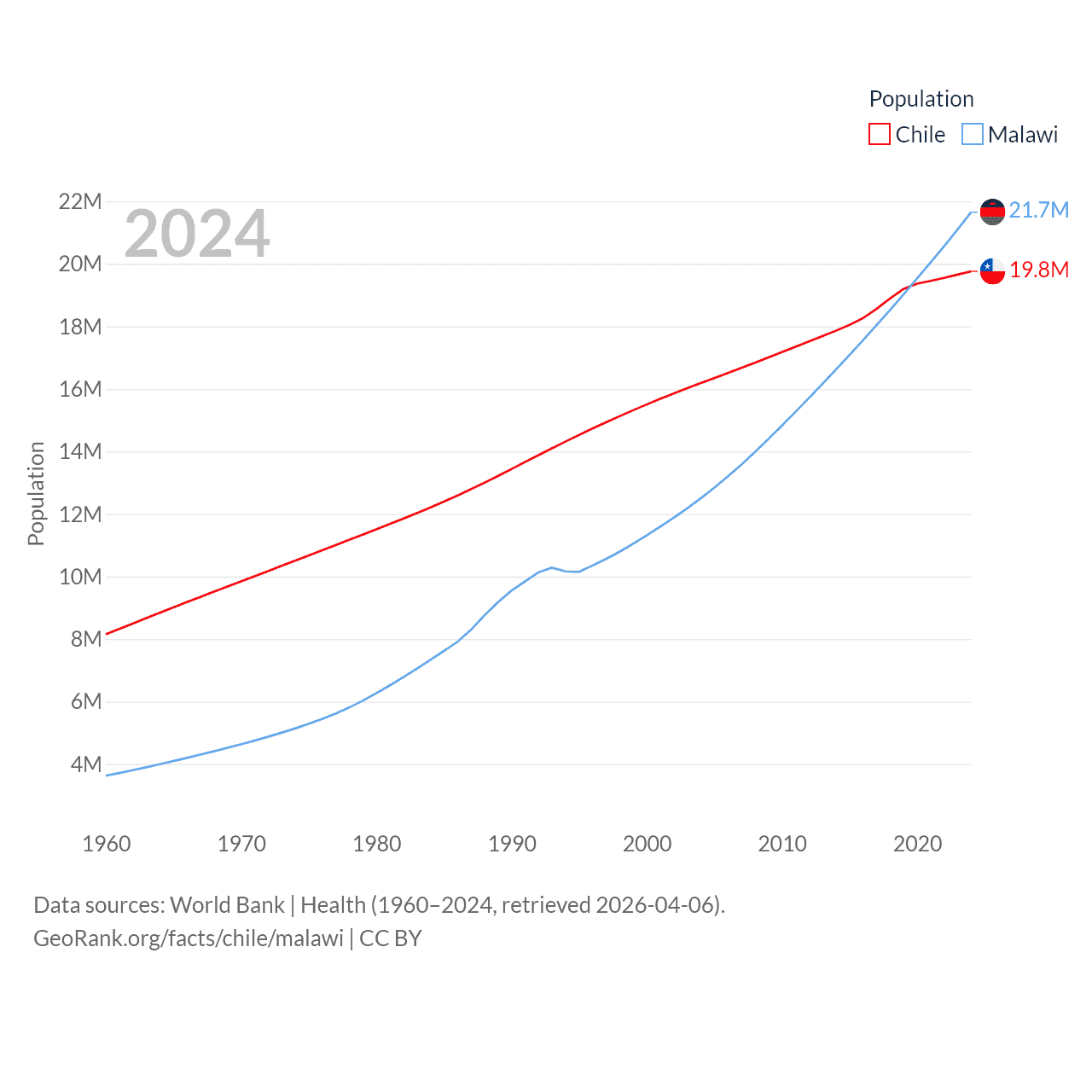 Chile has a population of 19.8M (ranked 66/197), compared with 21.7M in Malawi (ranked 62/197). Chile's land area is 286,809 sq mi versus 36,402 sq mi for Malawi (ranked 38th vs. 107th).