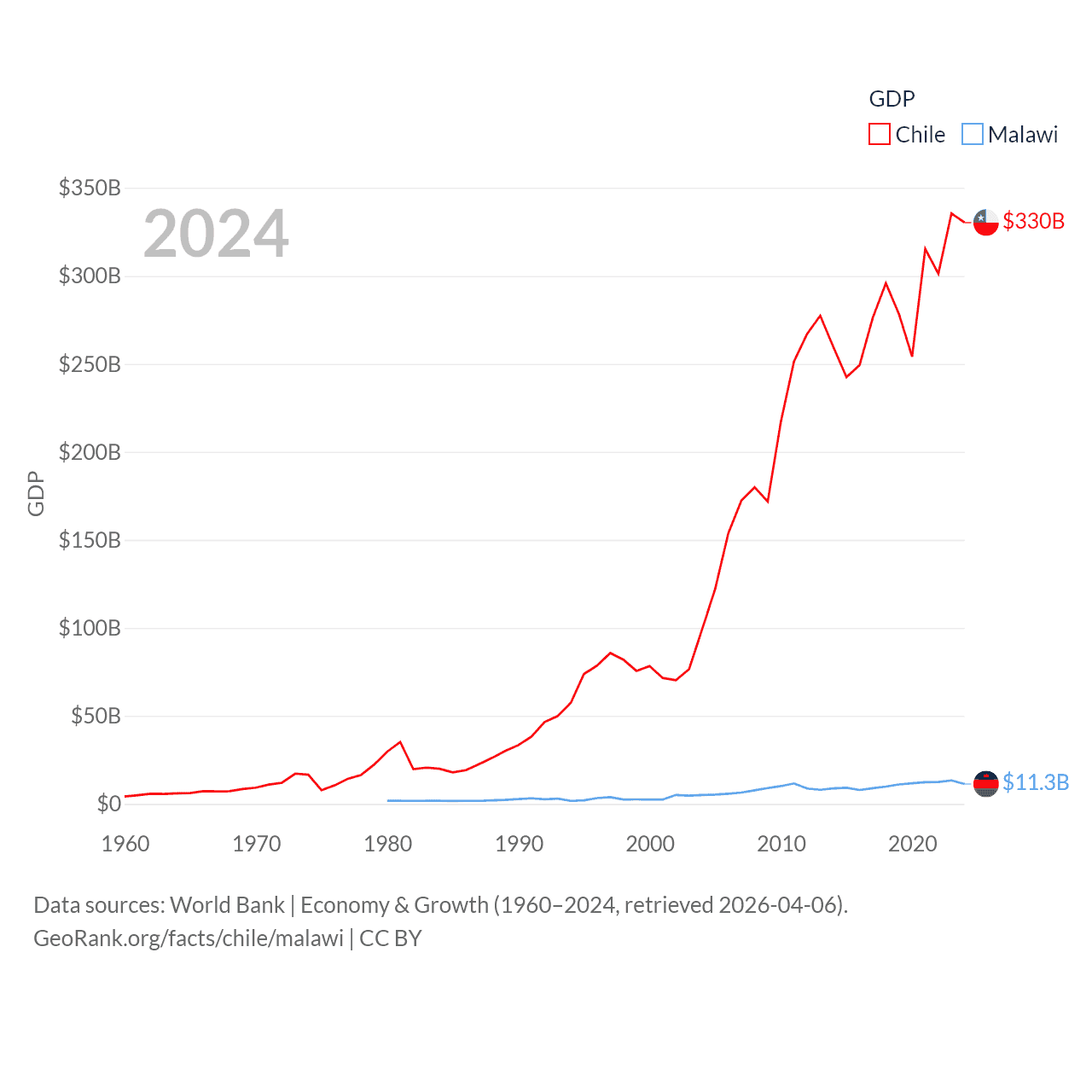 By GDP, Chile ranks 45/197 ($330B) and Malawi ranks 151/197 ($11.3B). By GDP per capita, Chile ranks 65/197 ($16,710), while Malawi ranks 194/197 ($523).