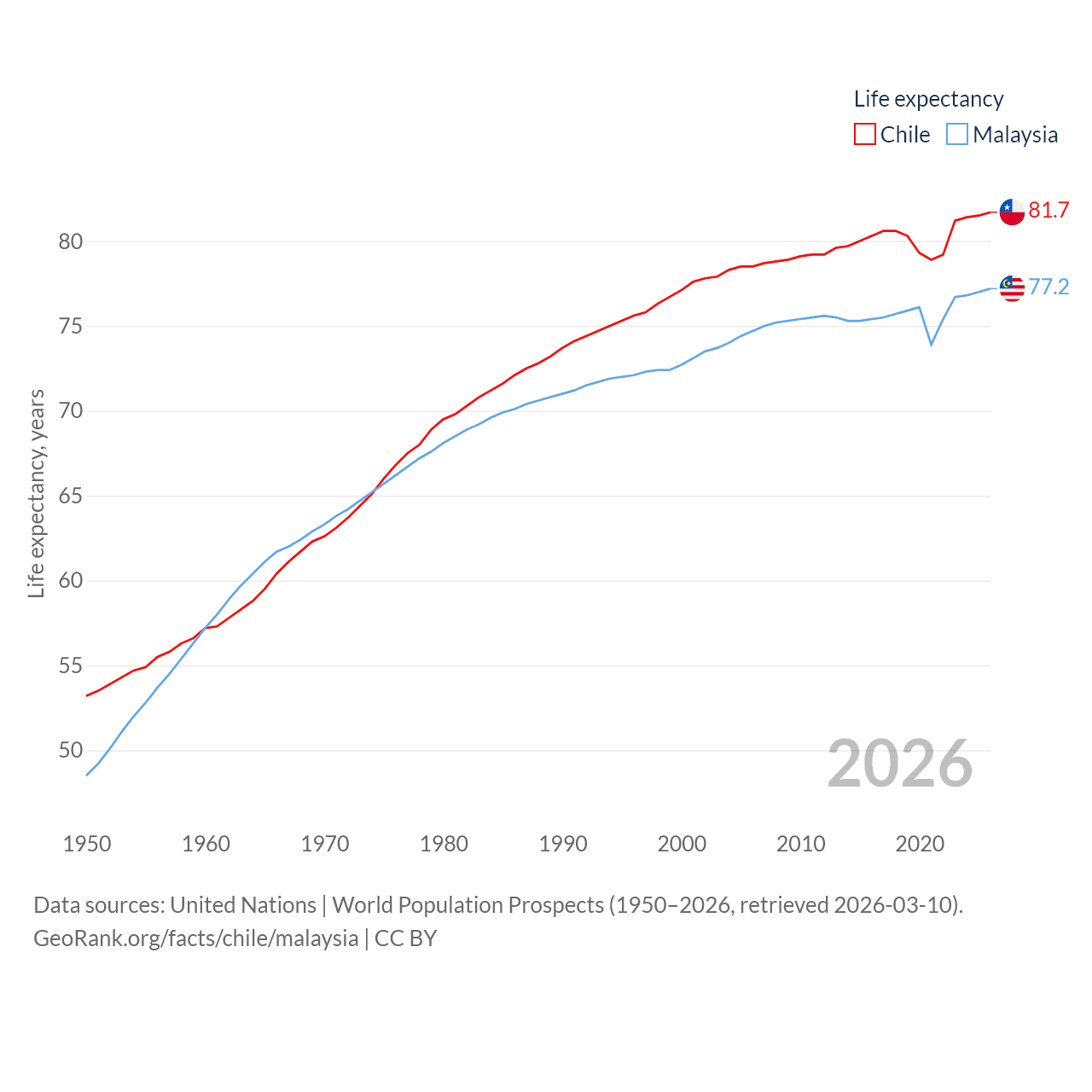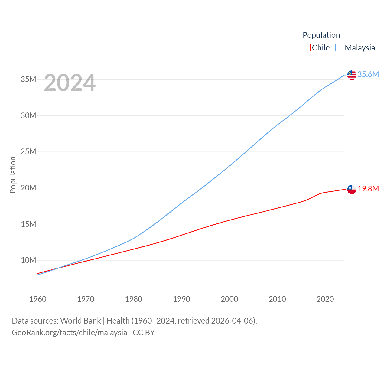 Chile has a population of 19.8M (ranked 66/197), compared with 35.6M in Malaysia (ranked 44/197). Chile's land area is 286,809 sq mi versus 126,854 sq mi for Malaysia (ranked 38th vs. 65th).