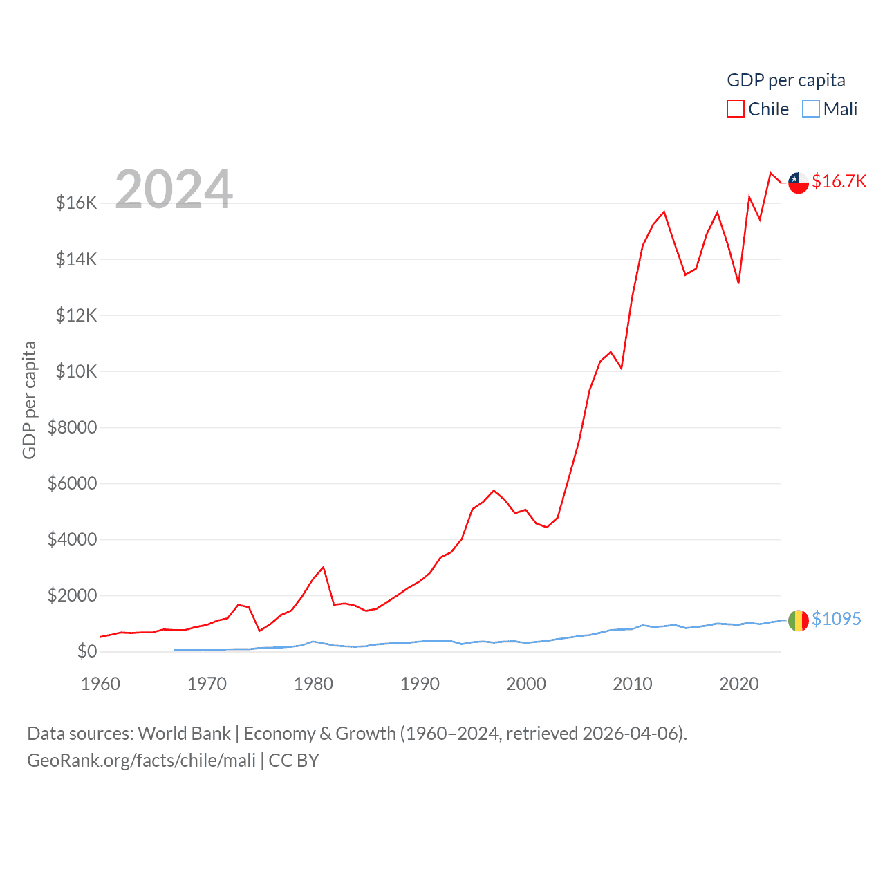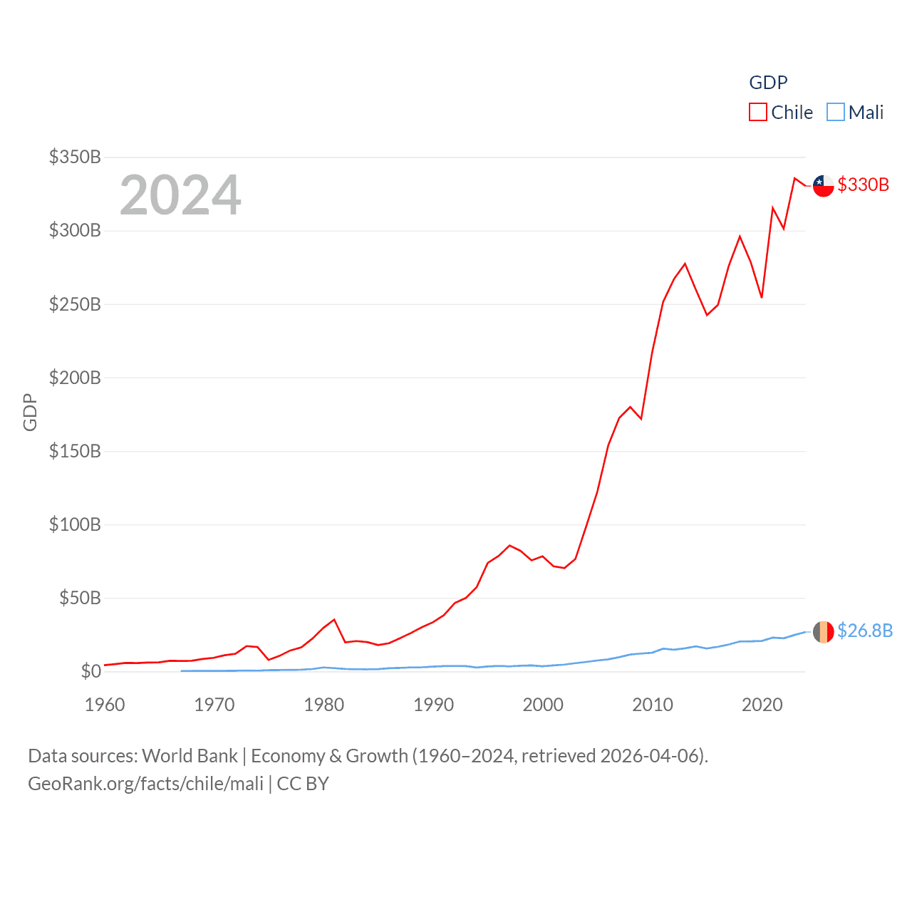 By GDP, Chile ranks 45/197 ($330B) and Mali ranks 113/197 ($26.8B). By GDP per capita, Chile ranks 65/197 ($16,710), while Mali ranks 173/197 ($1,095).