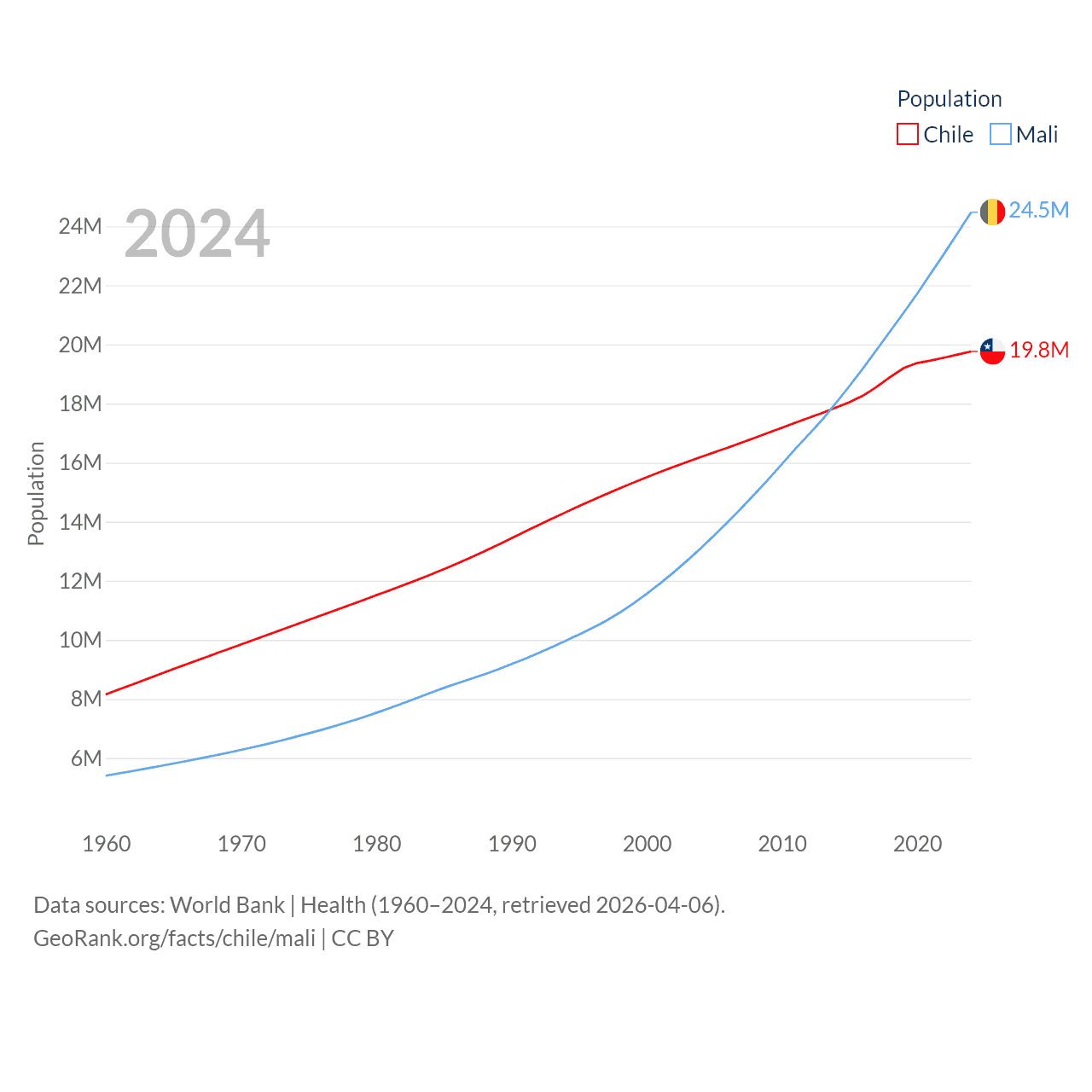 Chile has a population of 19.8M (ranked 66/197), compared with 24.5M in Mali (ranked 58/197). Chile's land area is 286,809 sq mi versus 471,118 sq mi for Mali (ranked 38th vs. 23rd).