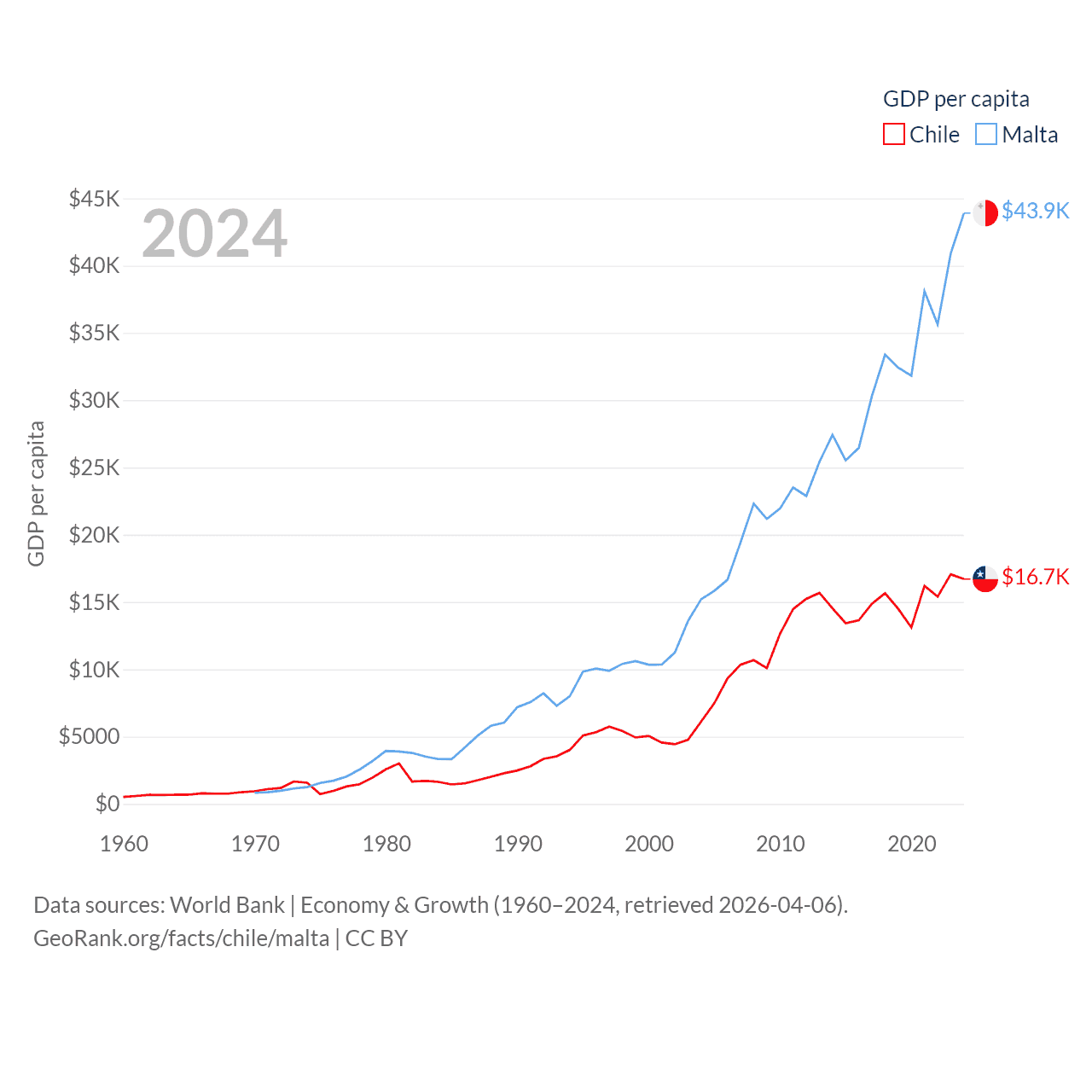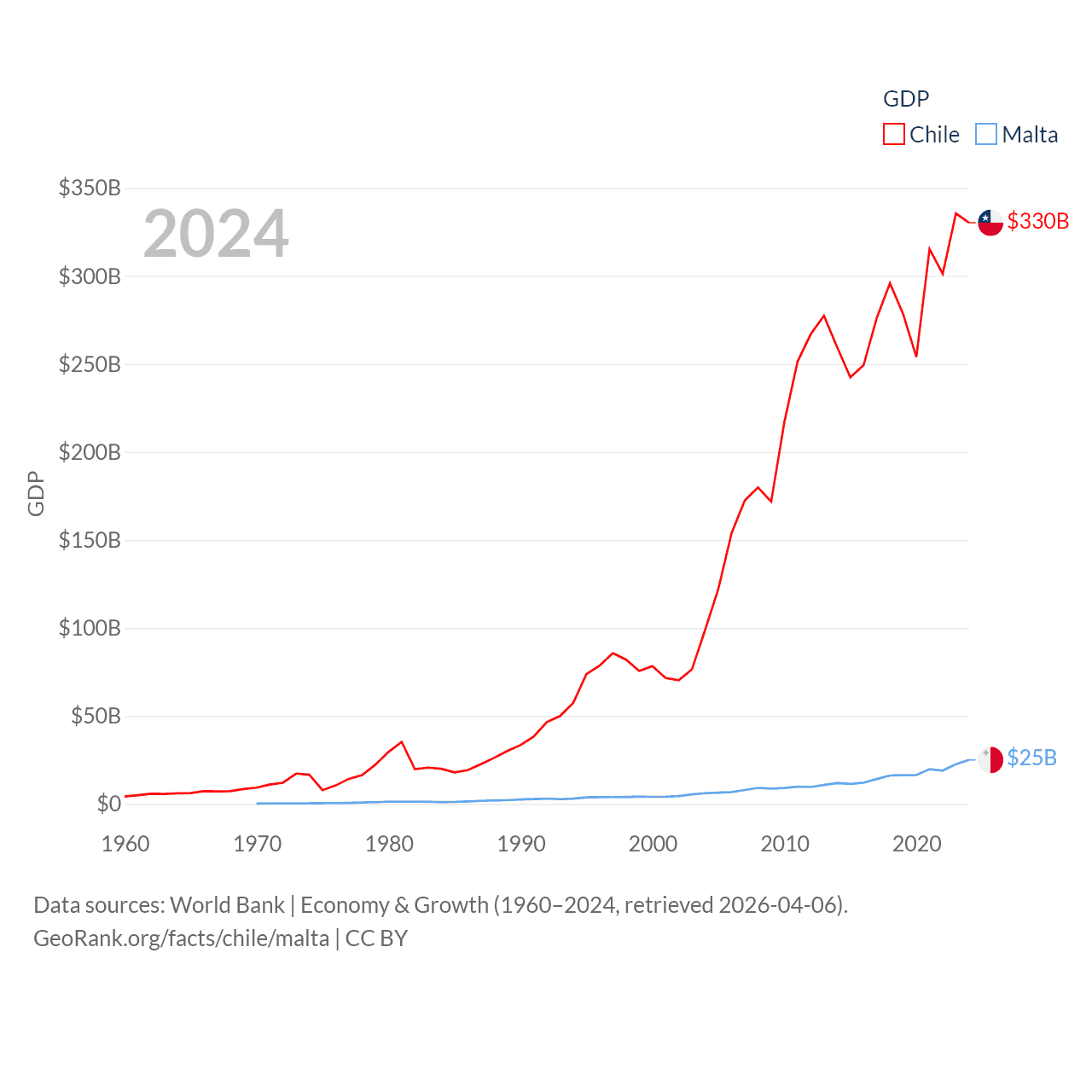 By GDP, Chile ranks 45/197 ($330B) and Malta ranks 119/197 ($25B). By GDP per capita, Chile ranks 65/197 ($16,710), while Malta ranks 28/197 ($43,899).