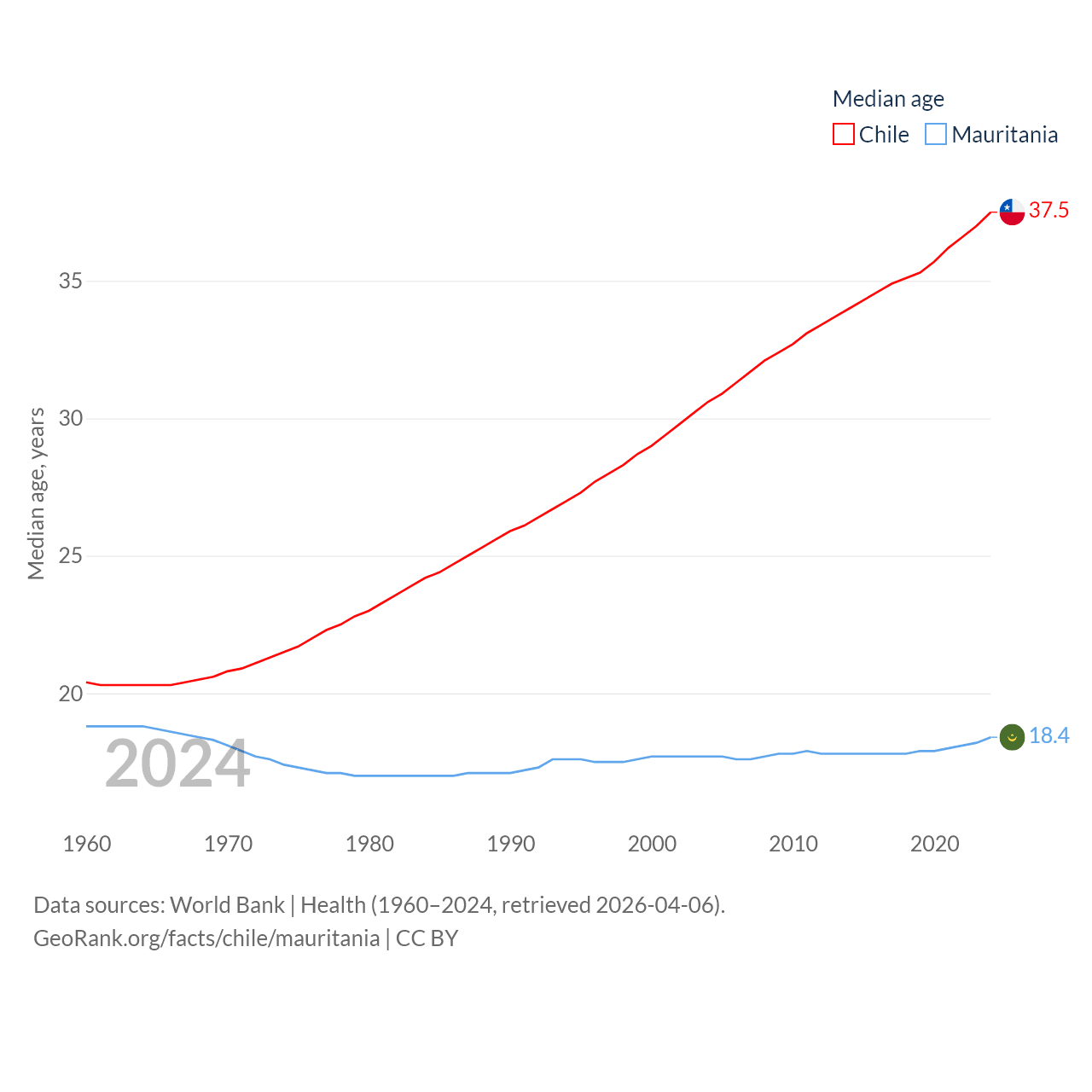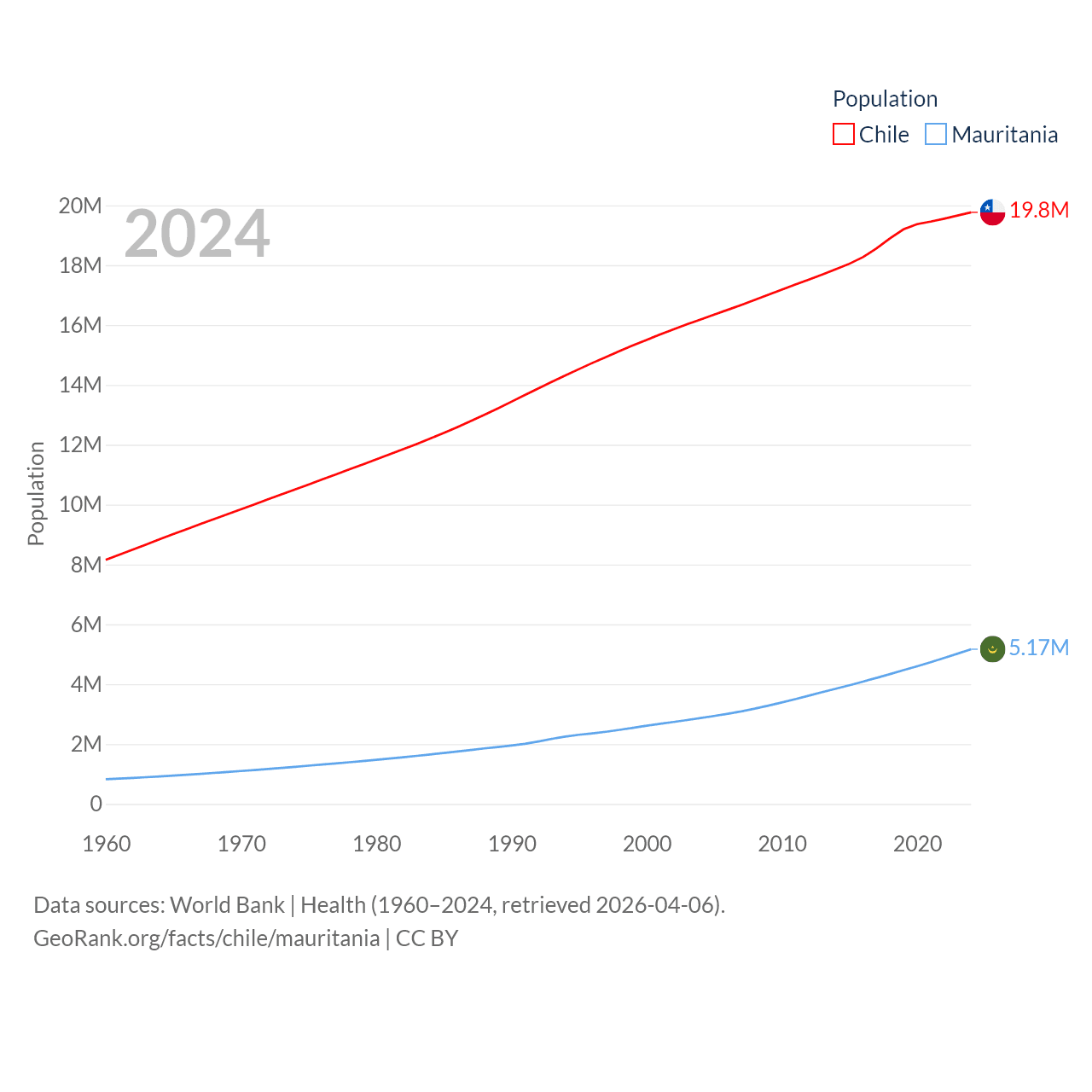 Chile has a population of 19.8M (ranked 66/197), compared with 5.17M in Mauritania (ranked 125/197). Chile's land area is 286,809 sq mi versus 397,955 sq mi for Mauritania (ranked 38th vs. 28th).