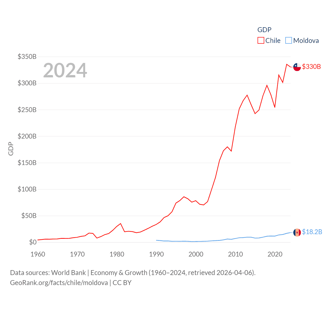 By GDP, Chile ranks 45/197 ($330B) and Moldova ranks 134/197 ($18.2B). By GDP per capita, Chile ranks 65/197 ($16,710), while Moldova ranks 99/197 ($7,576).