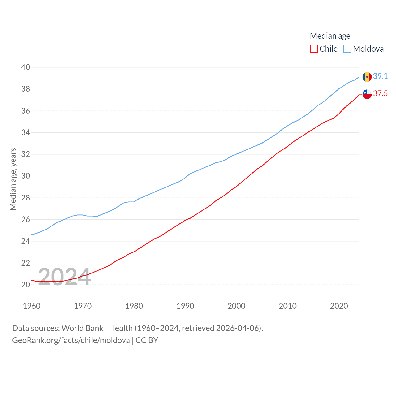Chile has a population of 19.8M (ranked 66/197), compared with 2.4M in Moldova (ranked 143/197). Chile's land area is 286,809 sq mi versus 12,714 sq mi for Moldova (ranked 38th vs. 135th).