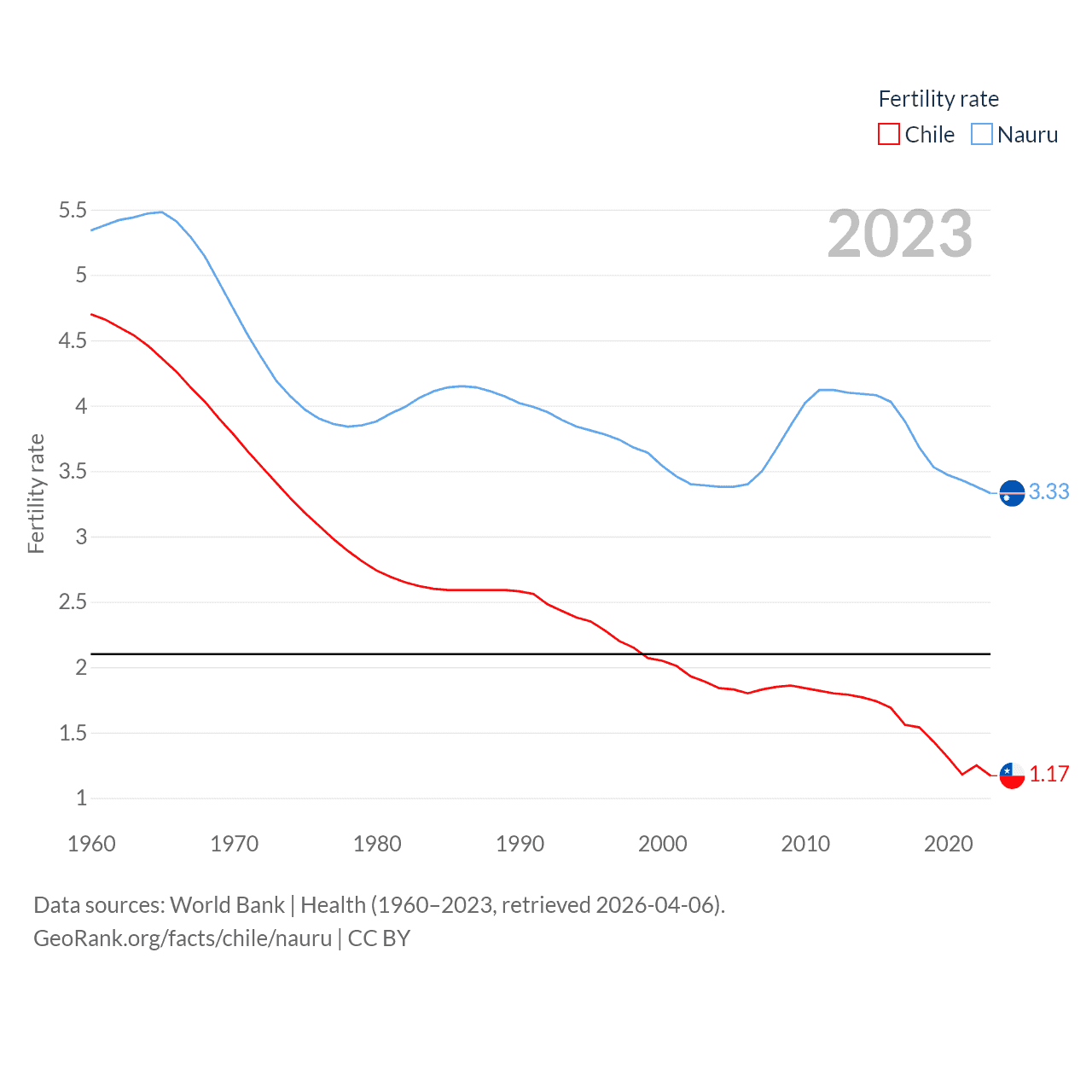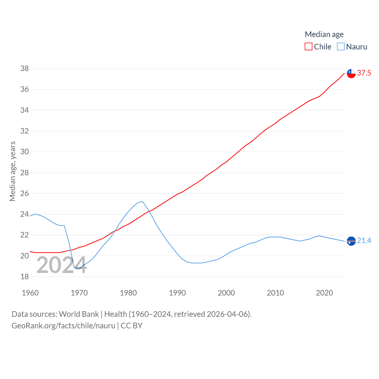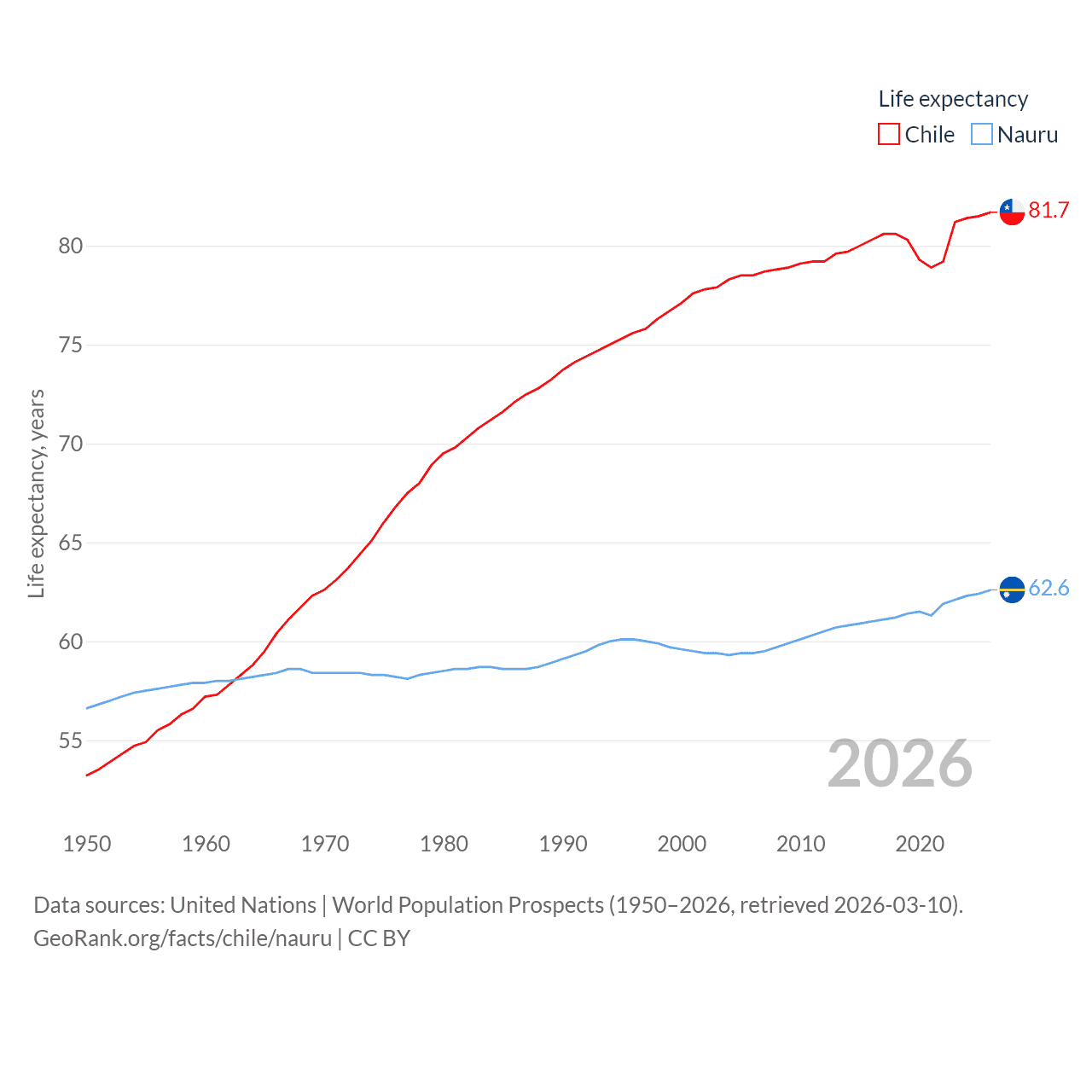 Chile has a population of 19.8M (ranked 66/197), compared with 11.9K in Nauru (ranked 195/197). Chile's land area is 286,809 sq mi versus 7.72 sq mi for Nauru (ranked 38th vs. 195th).