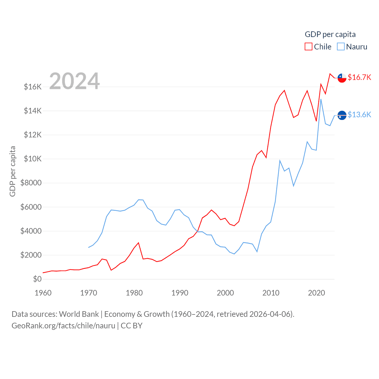 By GDP, Chile ranks 45/197 ($330B) and Nauru ranks 195/197 ($163M). By GDP per capita, Chile ranks 65/197 ($16,710), while Nauru ranks 74/197 ($13,609).